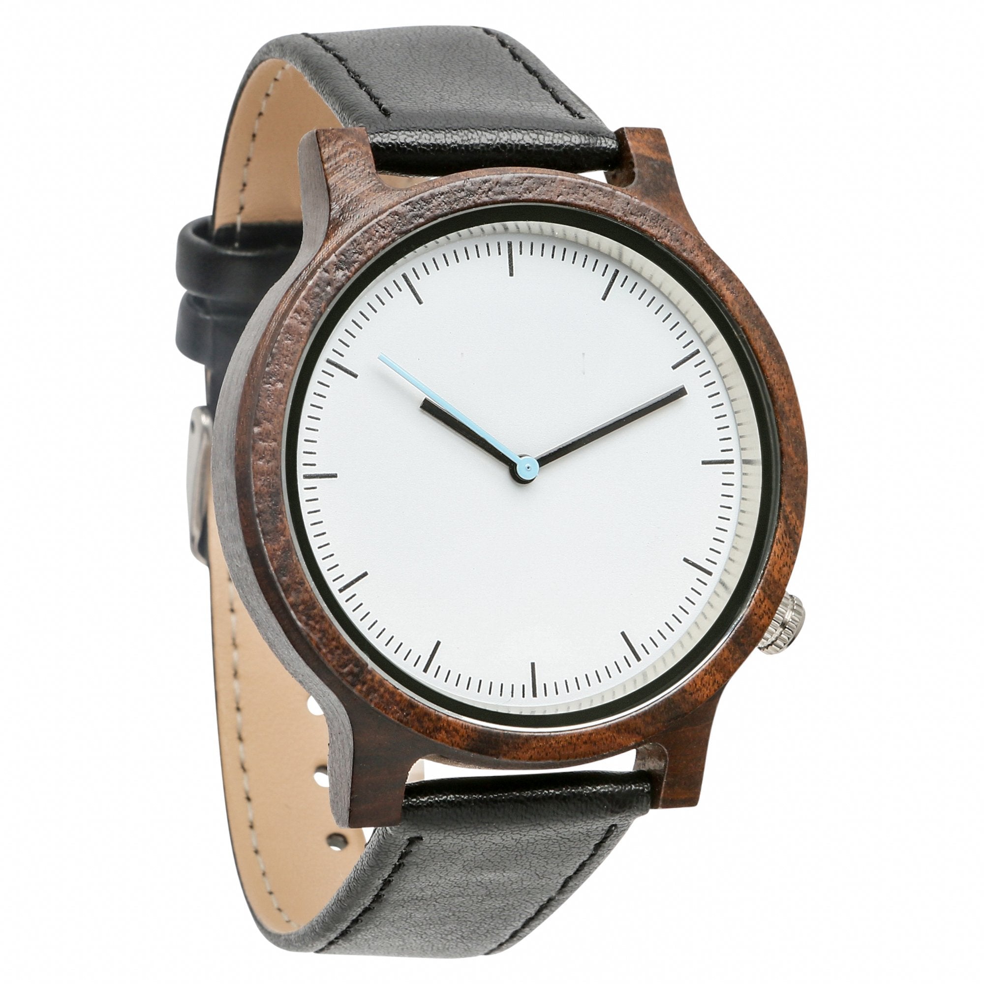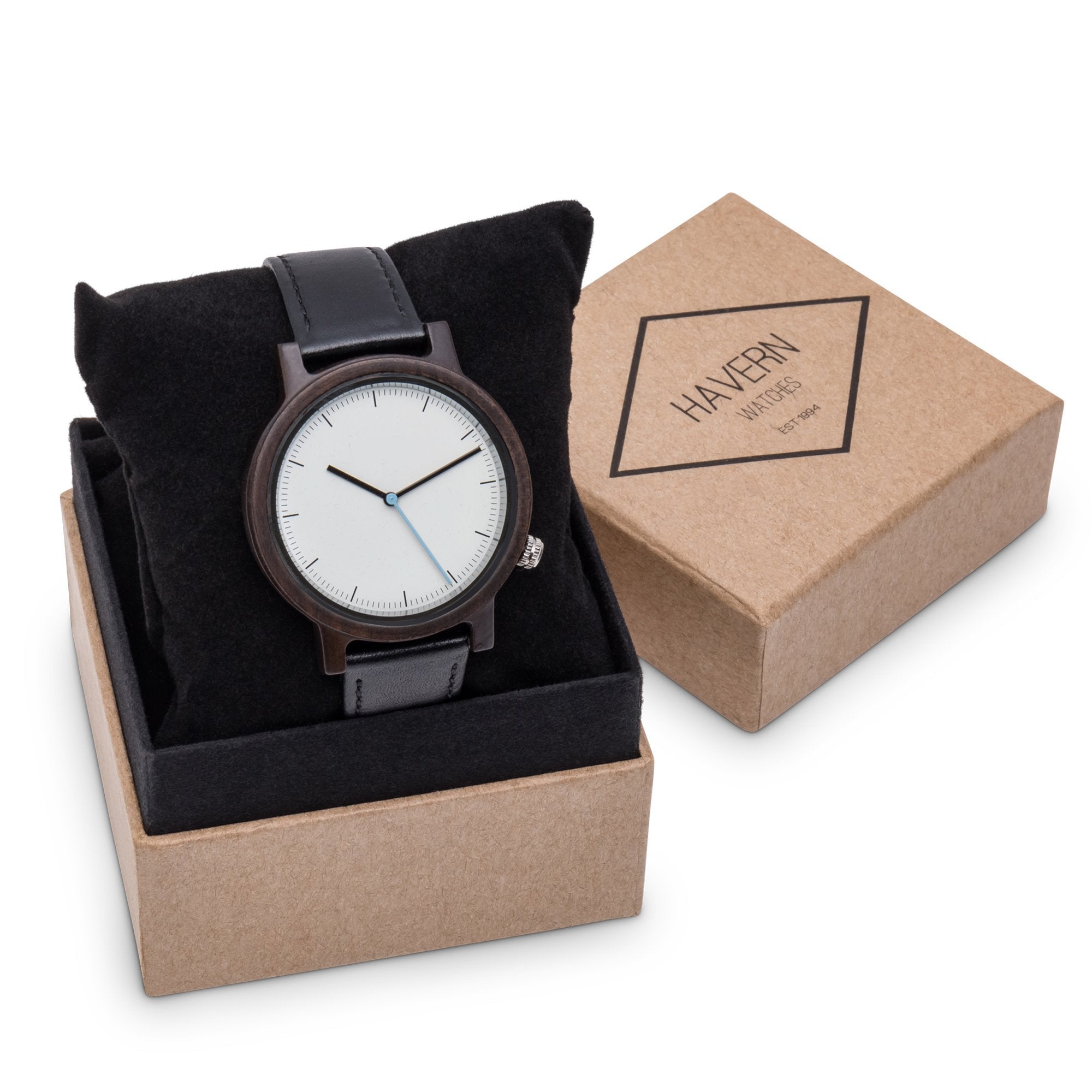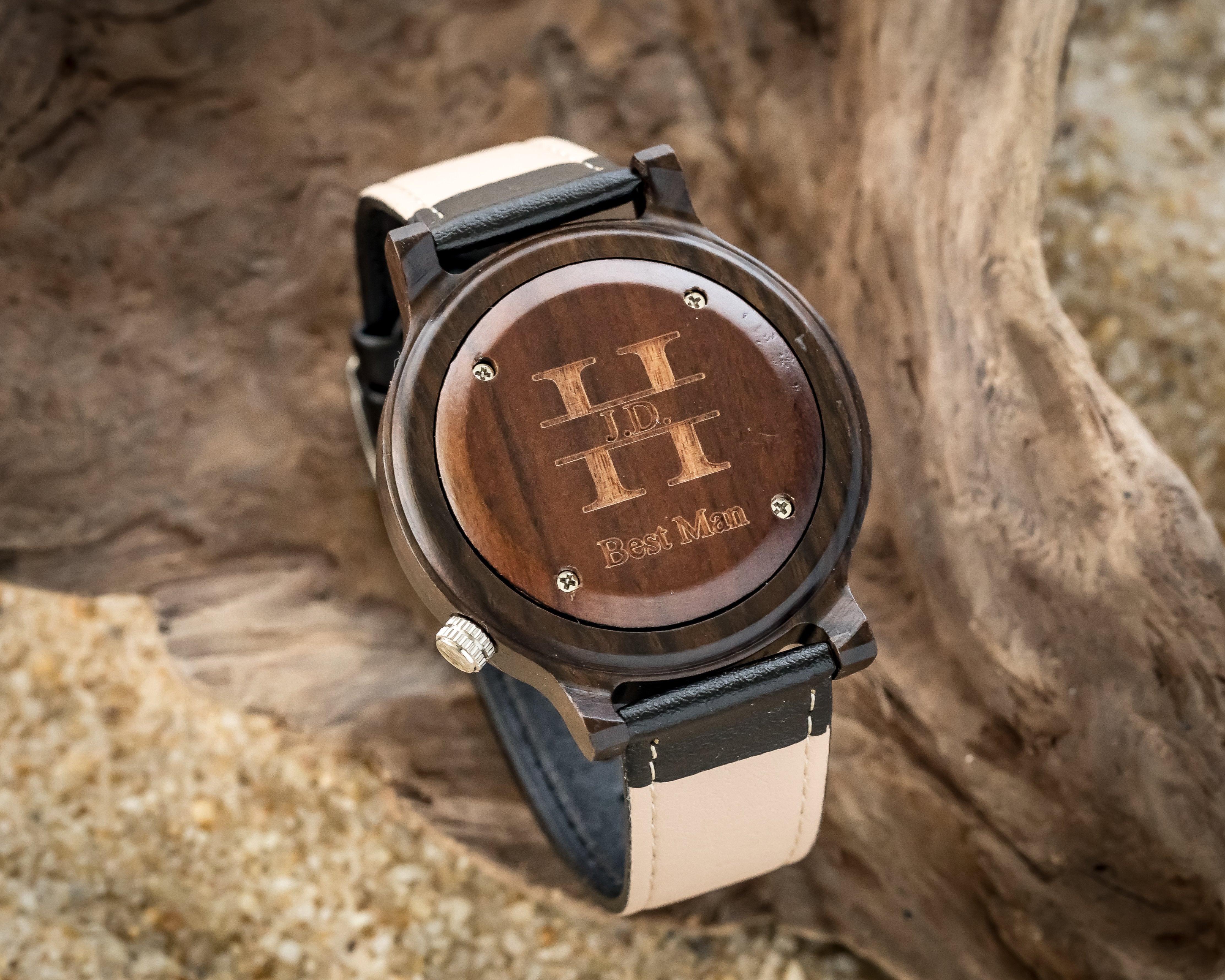The Axel Ebony wooden watch is designed for the retro-modern gentleman who appreciates the finer things in life. This signature timepiece features a black sandalwood watch case and genuine black leather wristband for long-wearing comfort. Its style-forward design is matched by superior function: reliable quartz movement and simple dial markers are built for elite performance. Add custom engraving to your Axel watch to create the perfect gift for any occasion. For added impact, upload a photo of your handwritten message to make your gift truly unique.