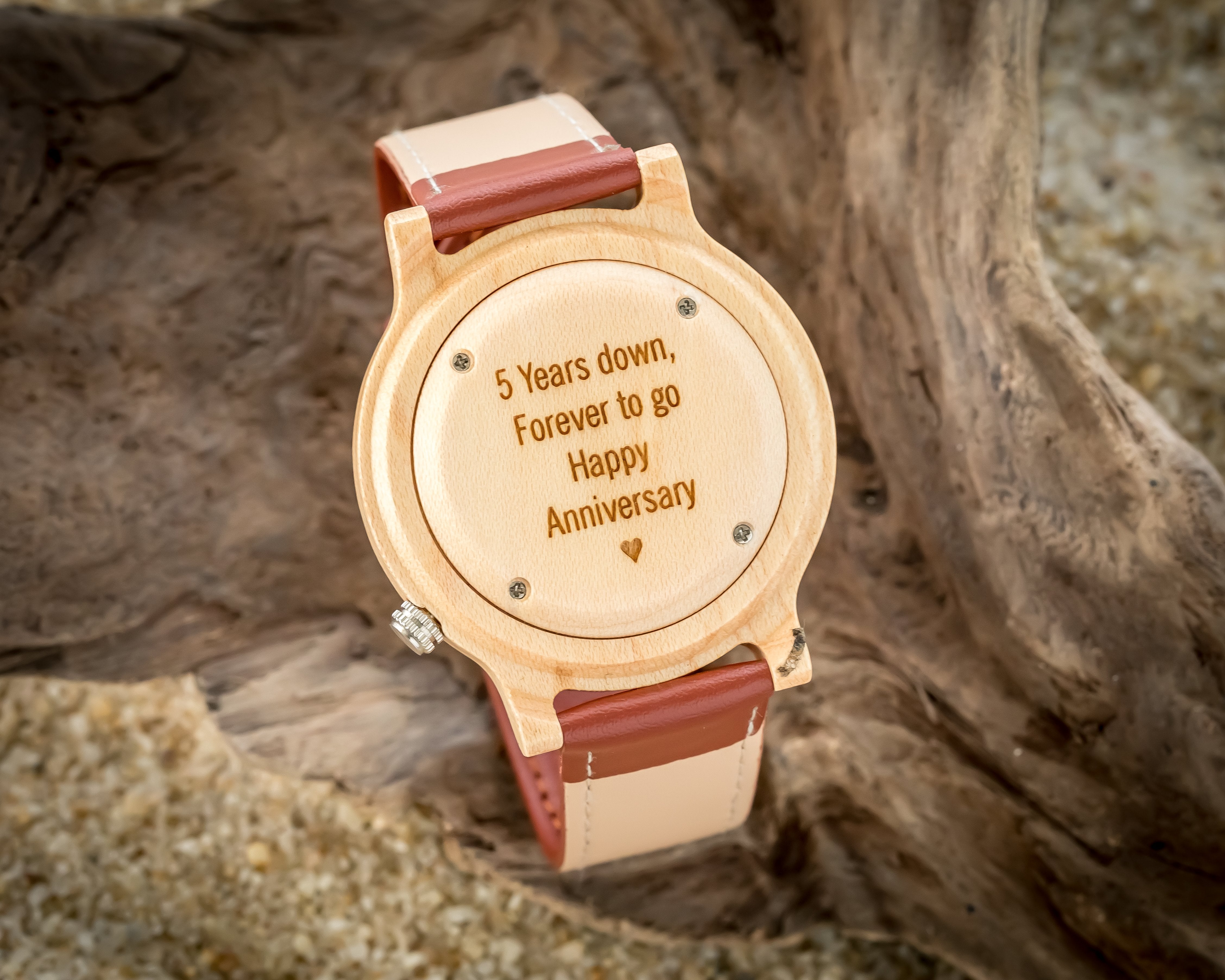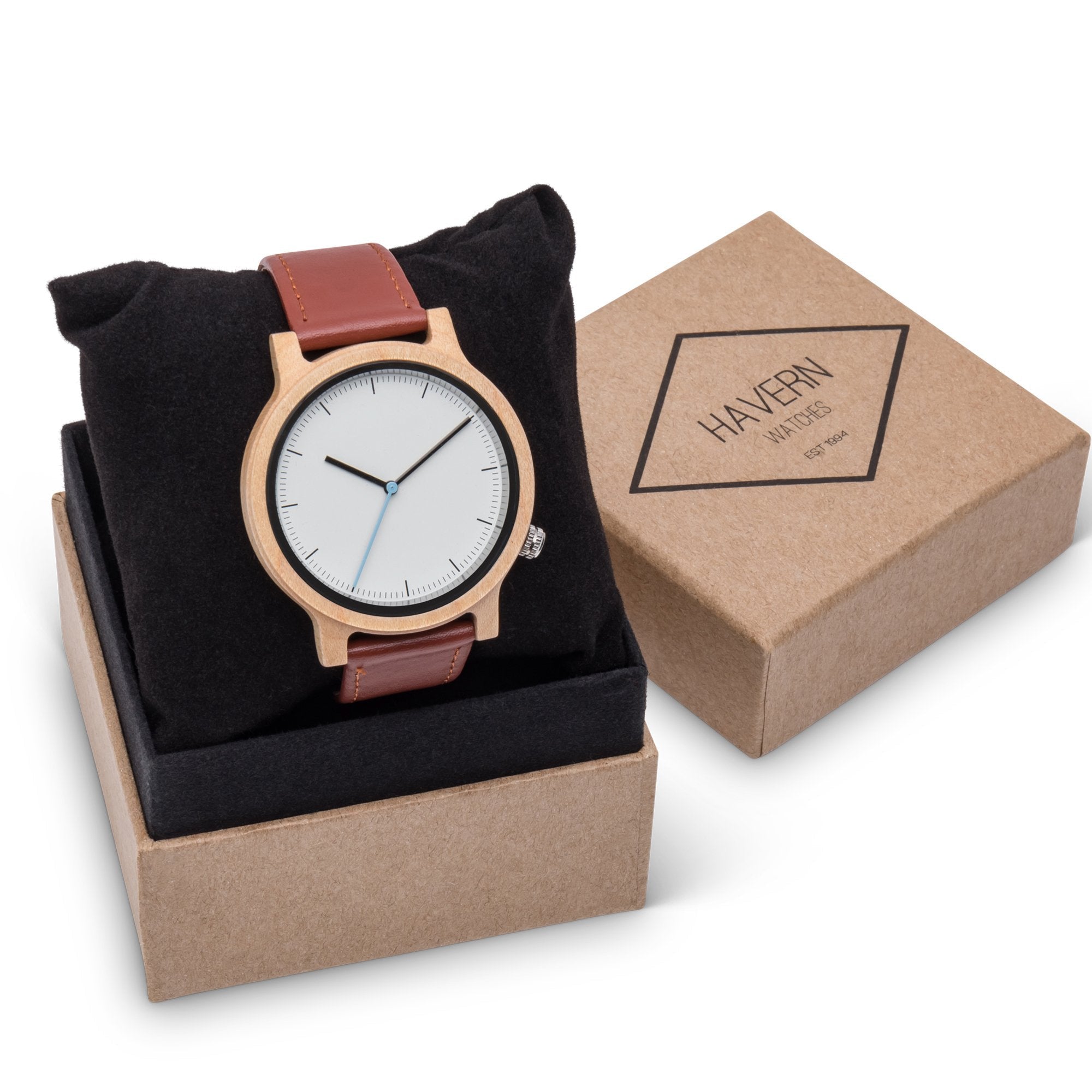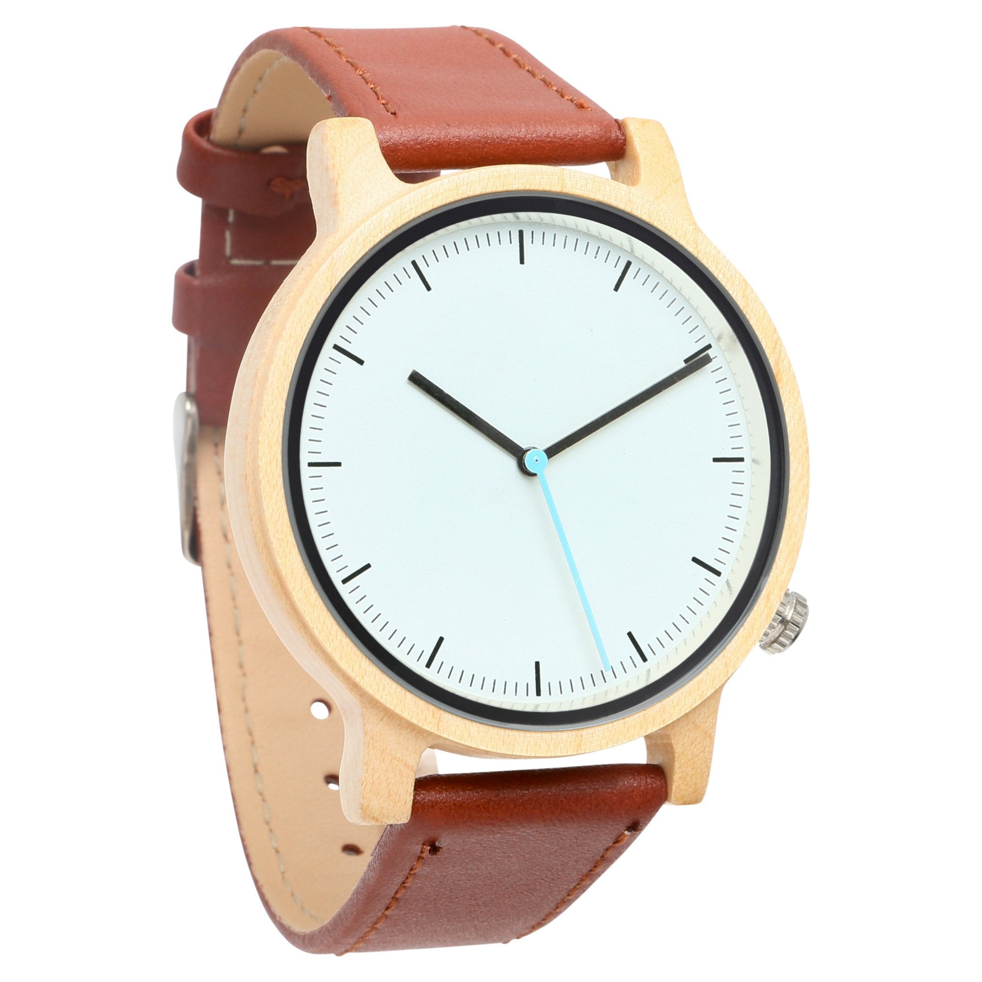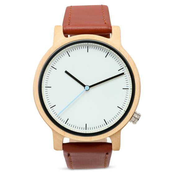 The Axel Maple wooden watch is designed for the retro-modern gentleman who appreciates the finer things in life. This signature timepiece features a U.S.A.-sourced maple wood watch case and genuine russet brown leather wristband for long-wearing comfort. Its style-forward design is matched by superior function: reliable quartz movement and simple dial markers are built for elite performance. Add custom engraving to your Axel watch to create the perfect gift for any occasion. For added impact, upload a photo of your handwritten message to make your gift truly unique.