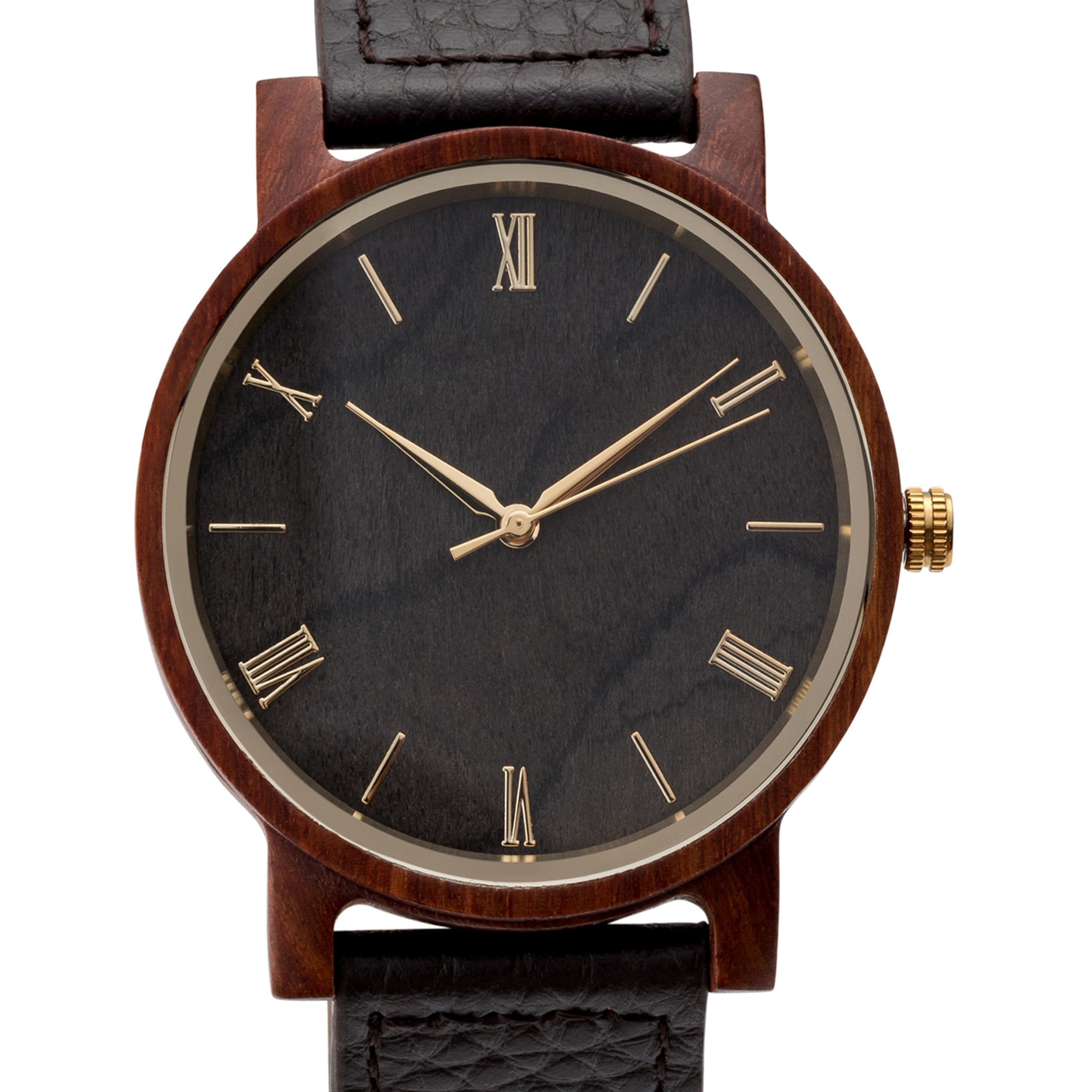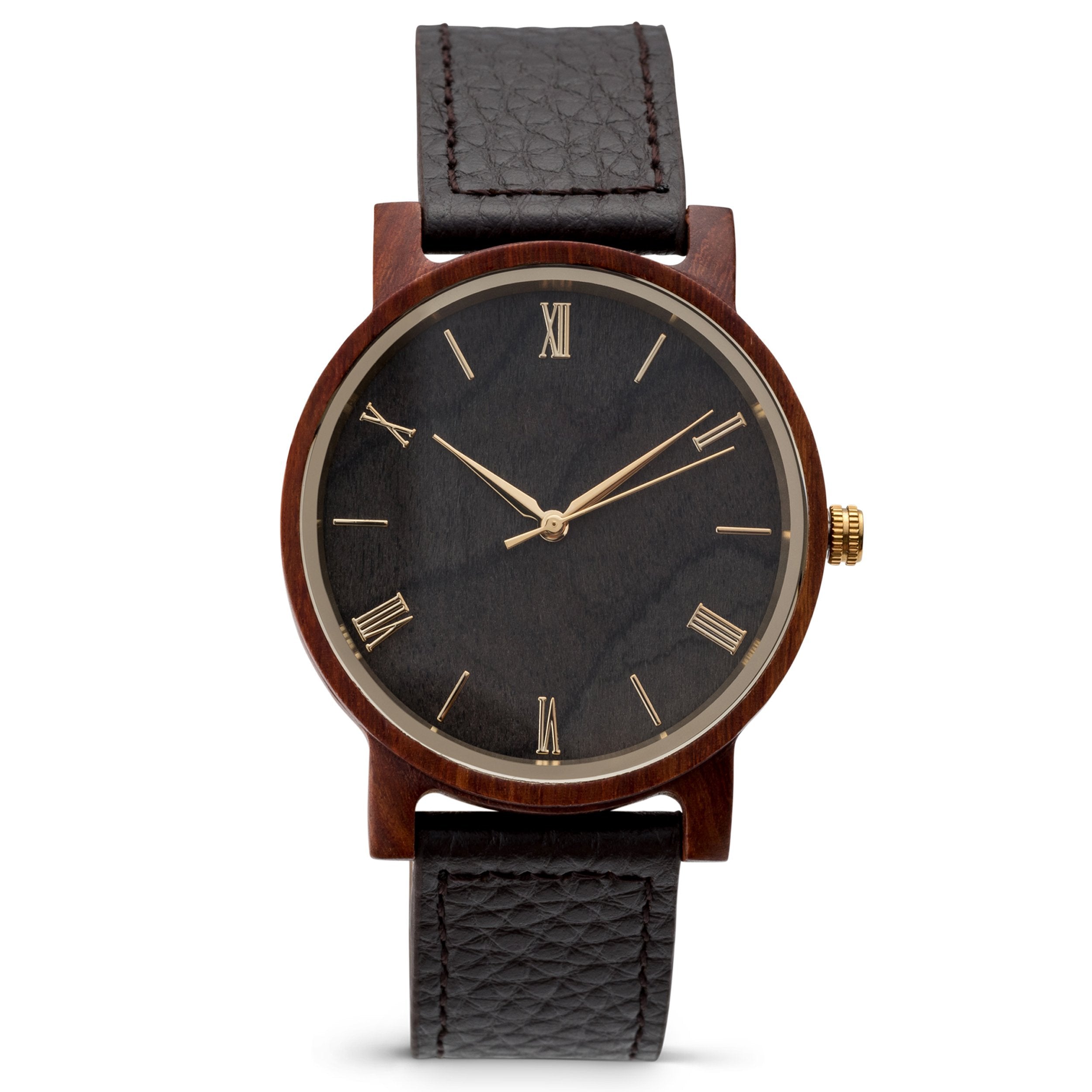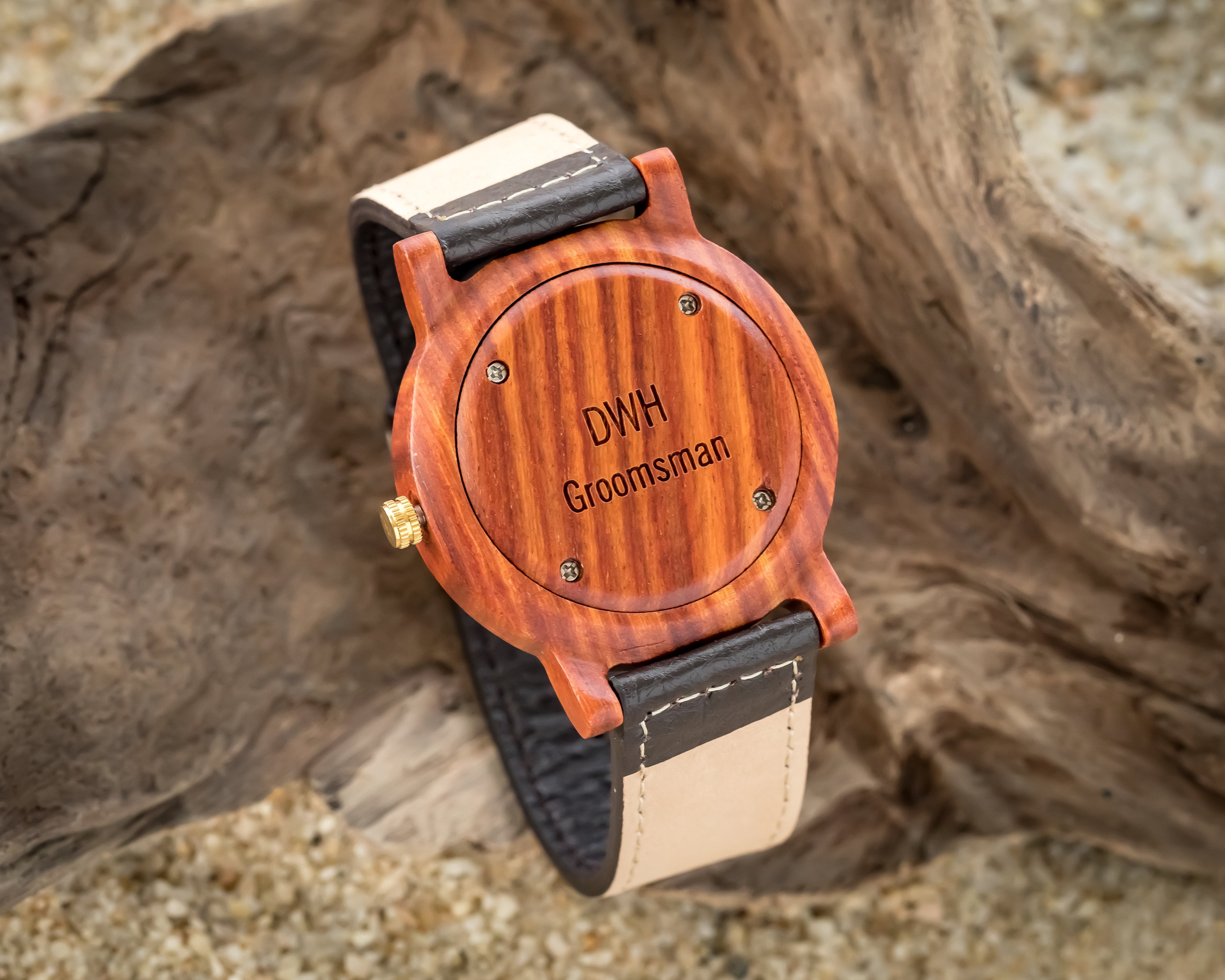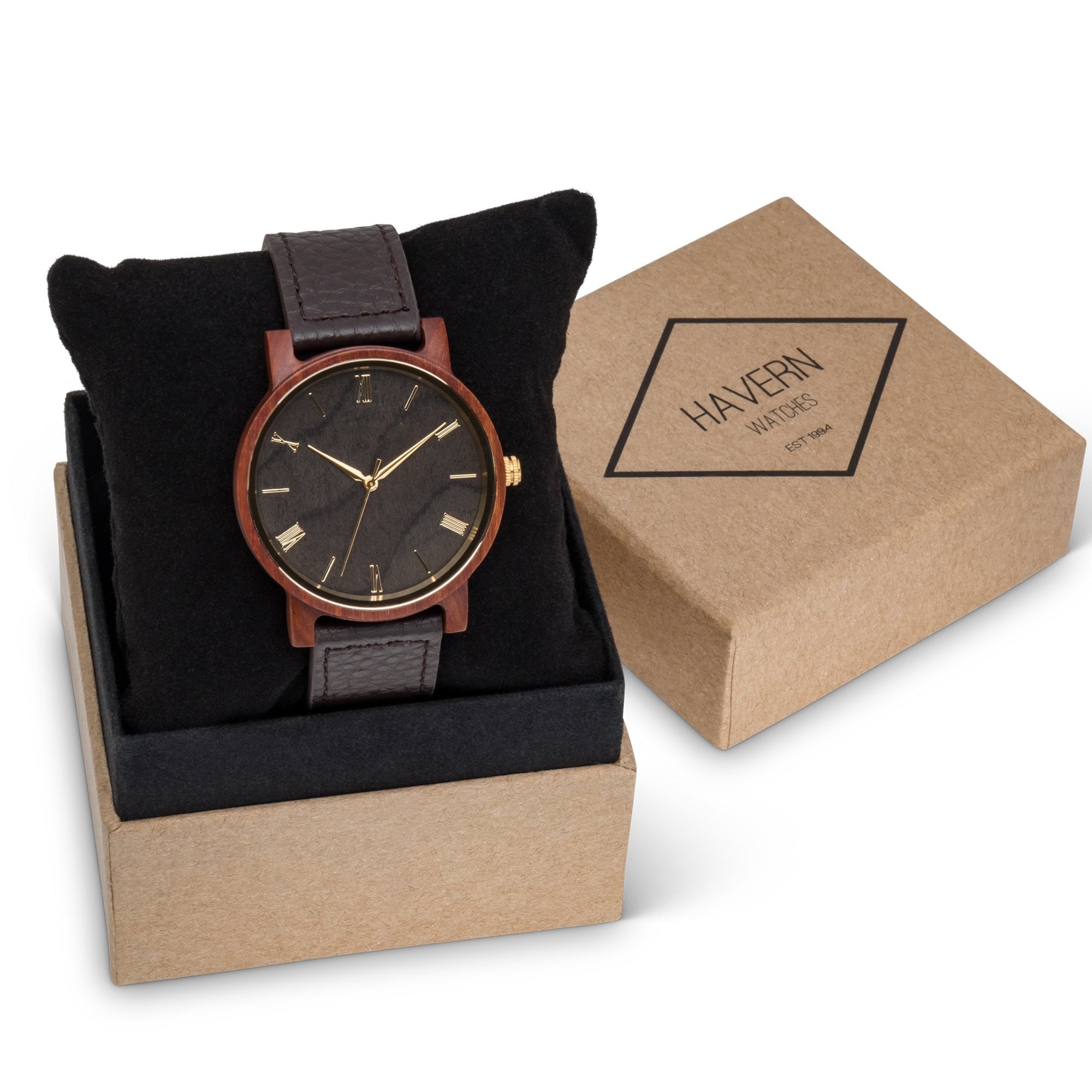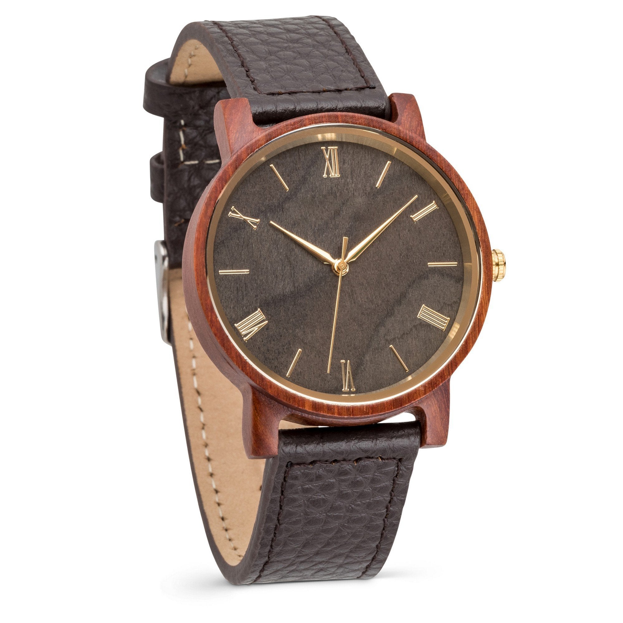 The Rexford Sandalwood wooden watch adds classic design and timeless detail to your everyday look. Crafted from a single piece of red sandalwood and finished with a genuine black leather band, this watch is designed for long-wearing comfort. Its style-forward design is matched by superior function: reliable quartz movement and roman numeral dial markers are built for elite performance. Add custom engraving to your Rexford watch to create the perfect gift for any occasion. For added impact, upload a photo of your handwritten message to make your gift truly unique.