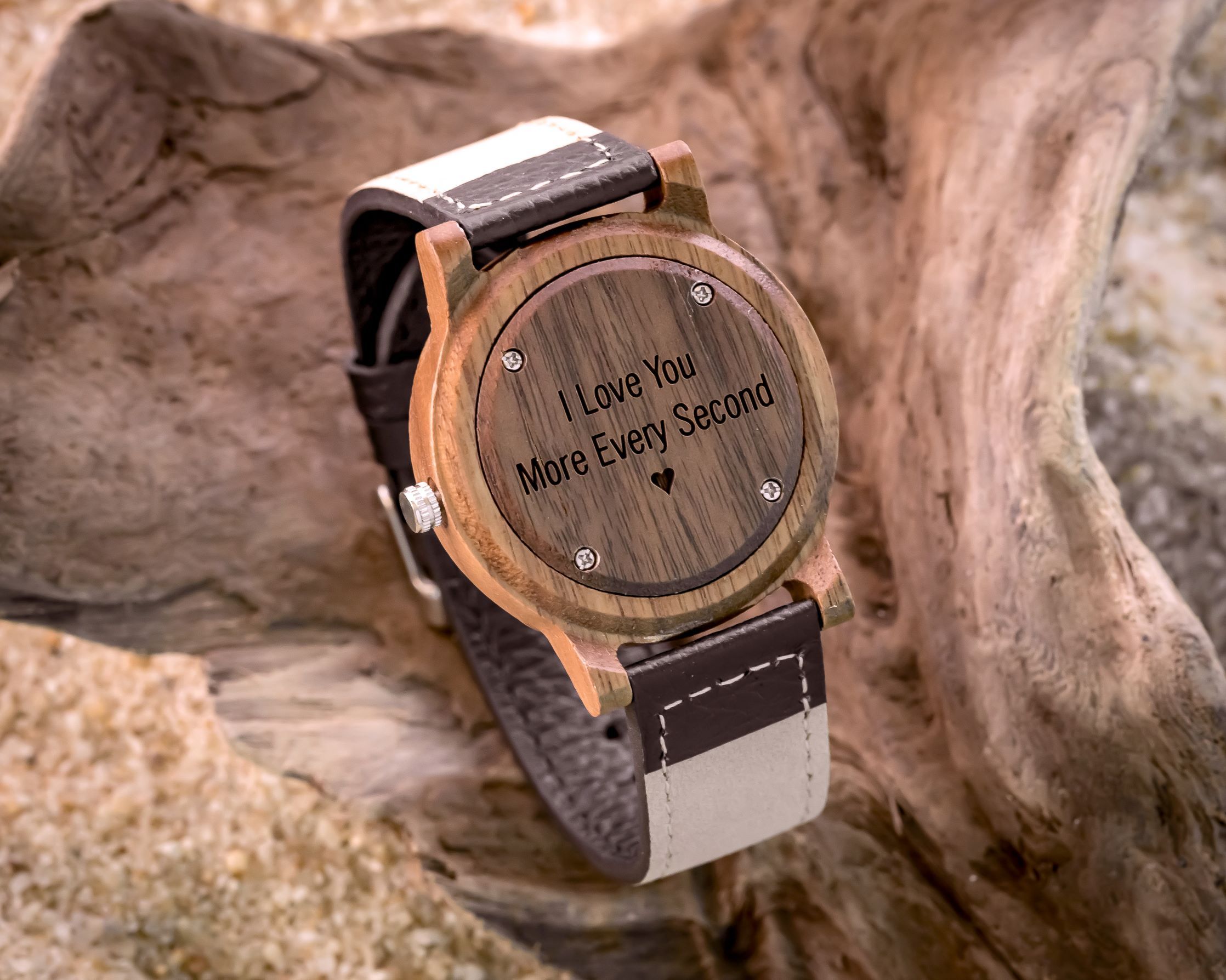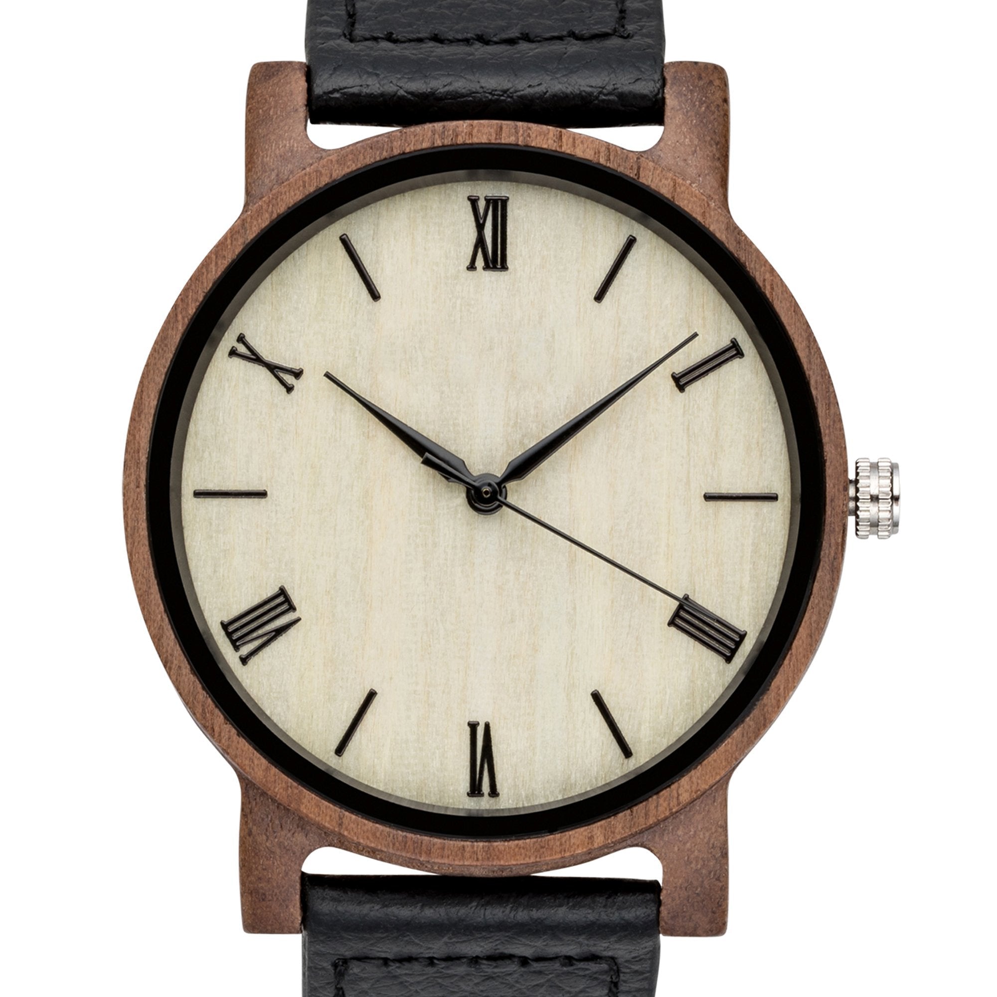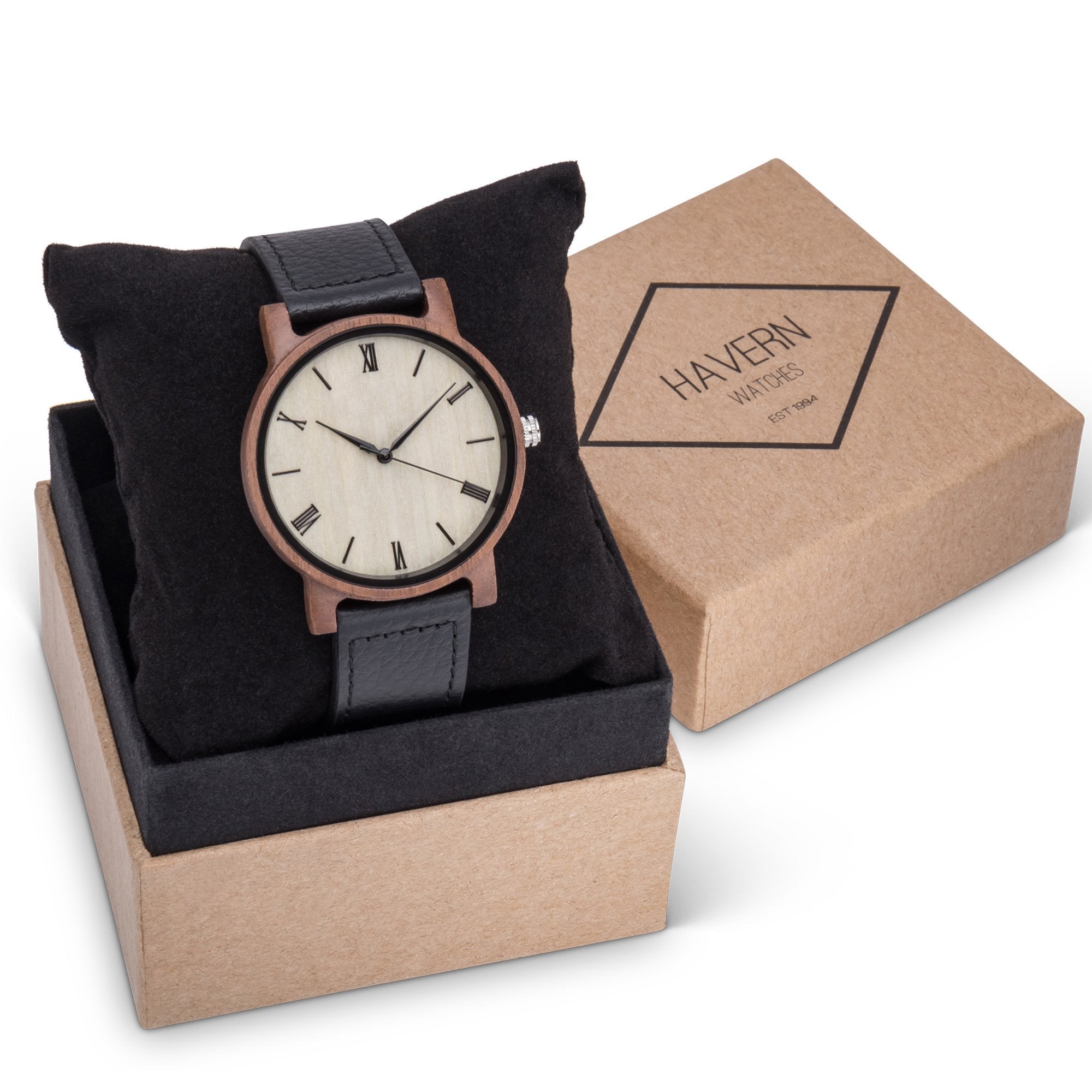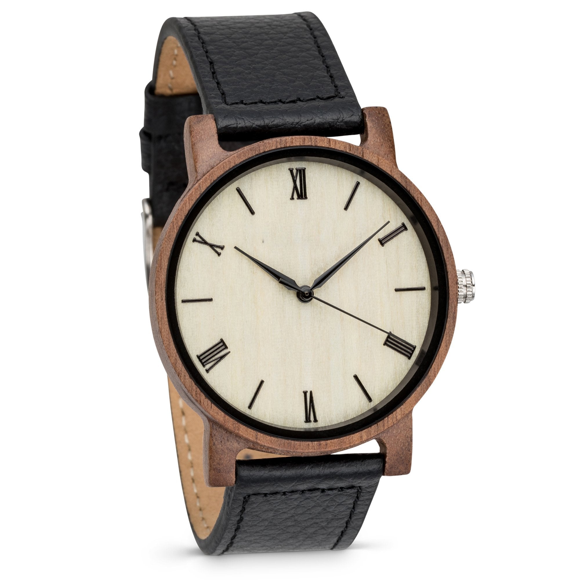 Designed for the man with discerning taste, the Rexford Walnut wooden watch adds rich texture to your everyday look. Crafted from a single piece of U.S.A.-sourced walnut wood and finished with a genuine black leather wristband, this watch is designed for long-wearing comfort. Its style-forward design is matched by superior function: reliable quartz movement and roman numeral dial markers are built for elite performance. Add custom engraving to your Rexford watch to create the perfect gift for any occasion. For added impact, upload a photo of your handwritten message to make your gift truly unique.