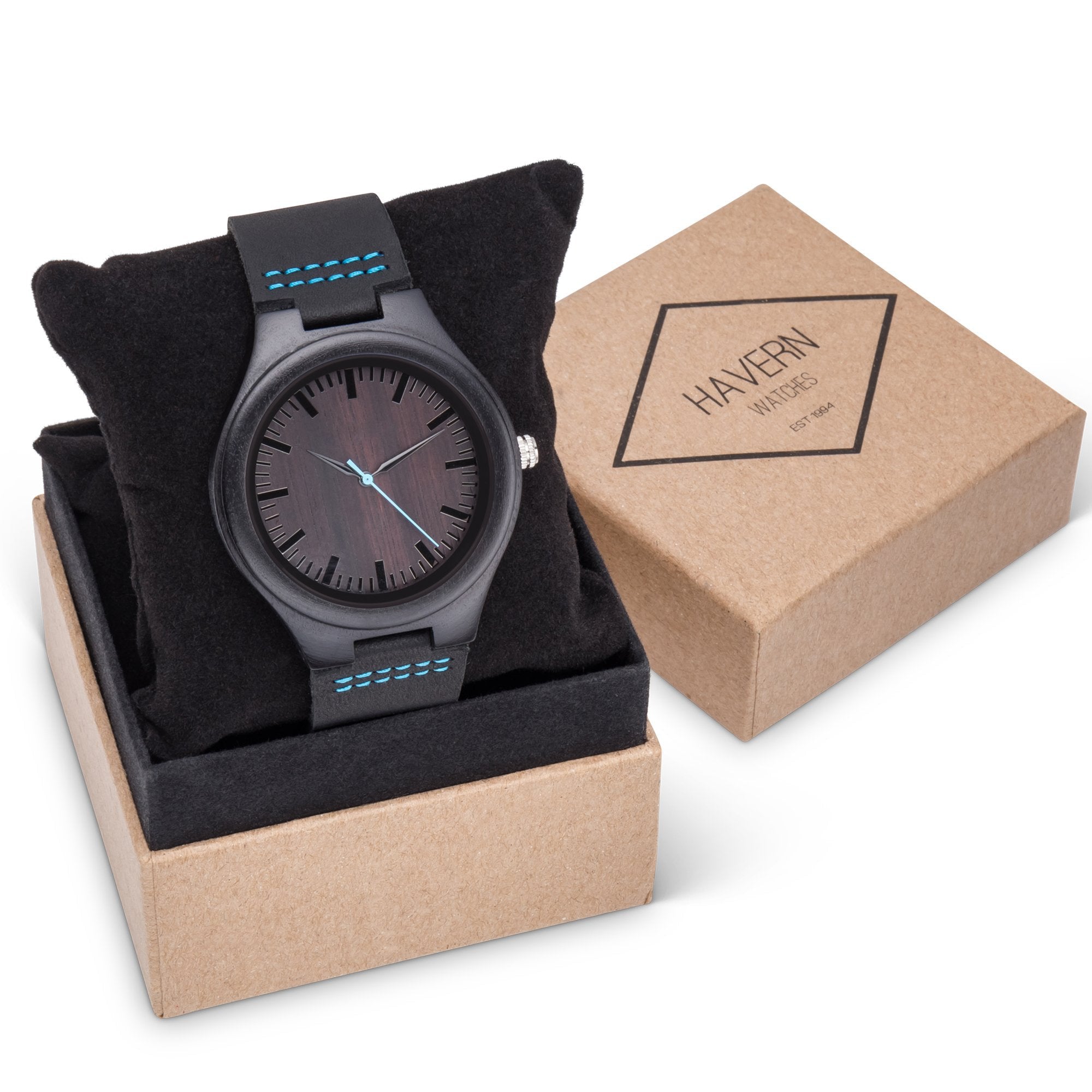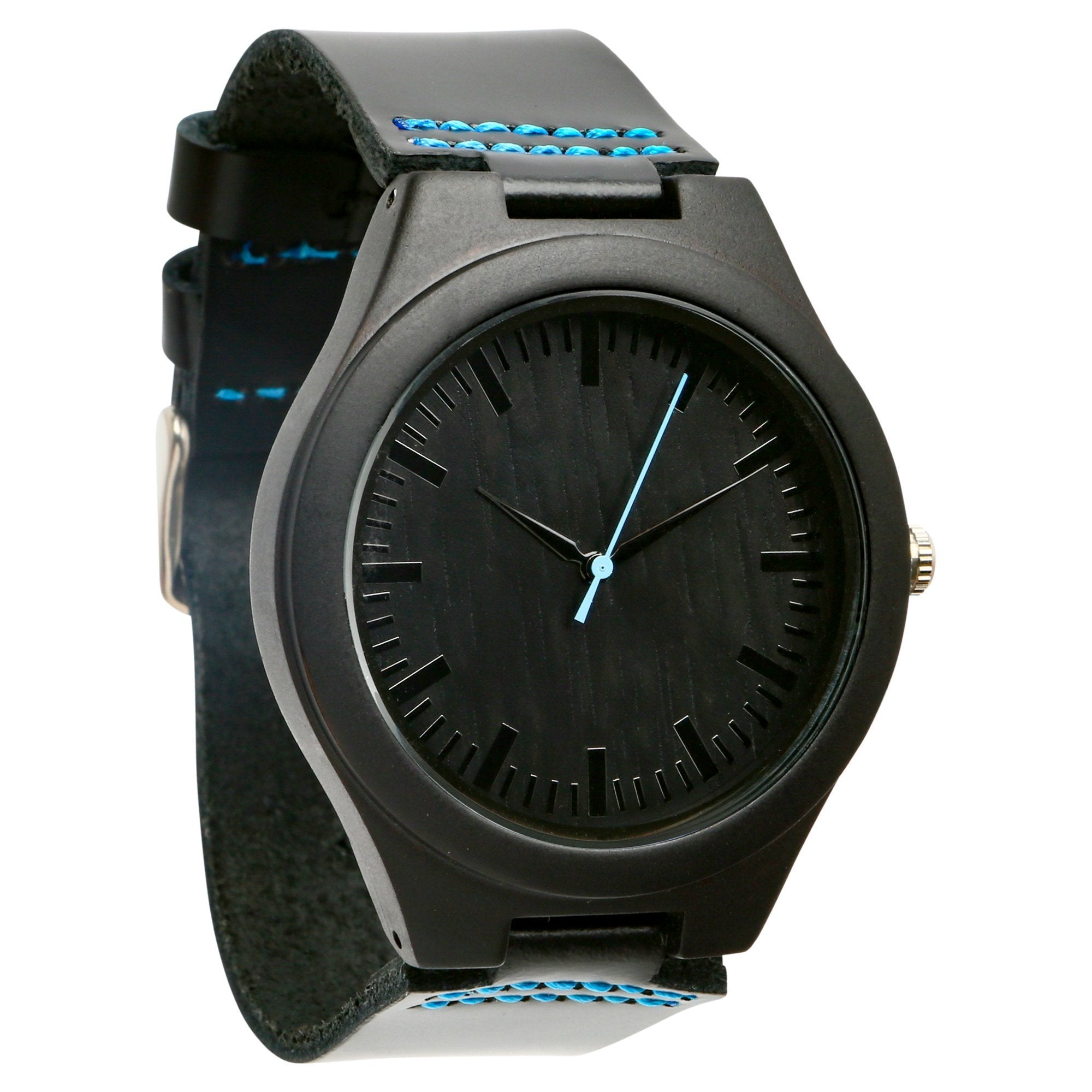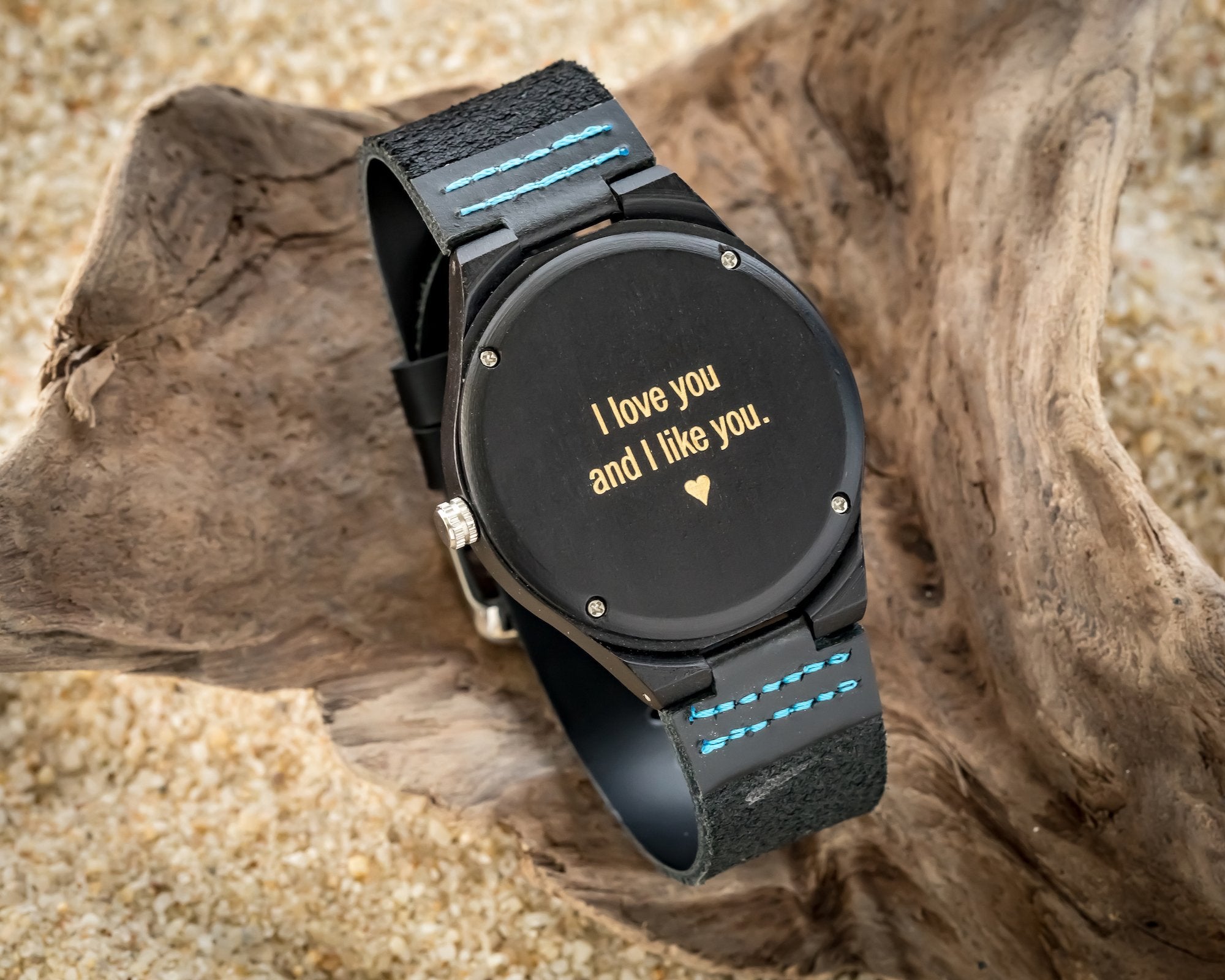 For the bold modern gentleman, Clark Blue wooden watch offers a sleek statement accessory for your everyday wardrobe. This minimalist timepiece features a black sandalwood watch case and geniune black leather wristband with blue contrast stitching designed for long-wearing comfort. Its style-forward design is matched by superior function: reliable quartz movement and simple dial markers are built for elite performance. Add custom engraving to your Clark watch to create the perfect gift for any occasion. For added impact, upload a photo of your handwritten message to make your gift truly unique.
