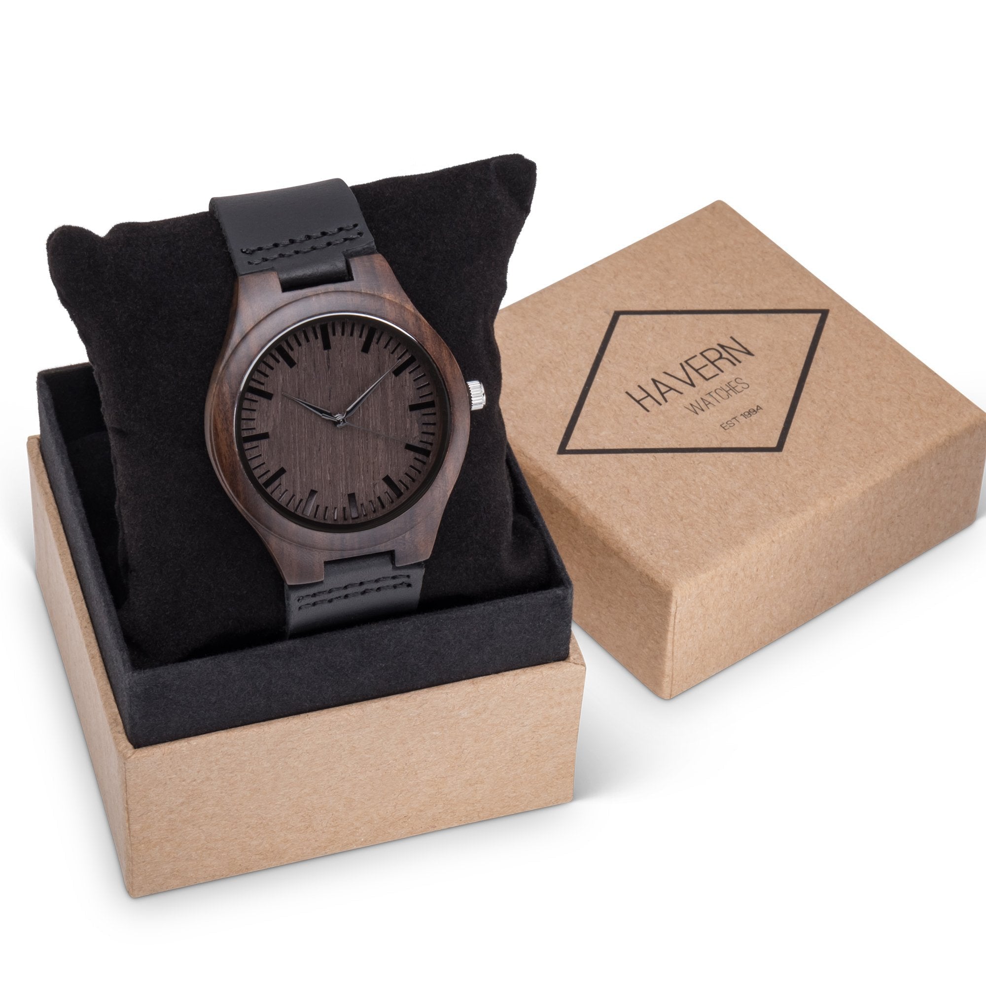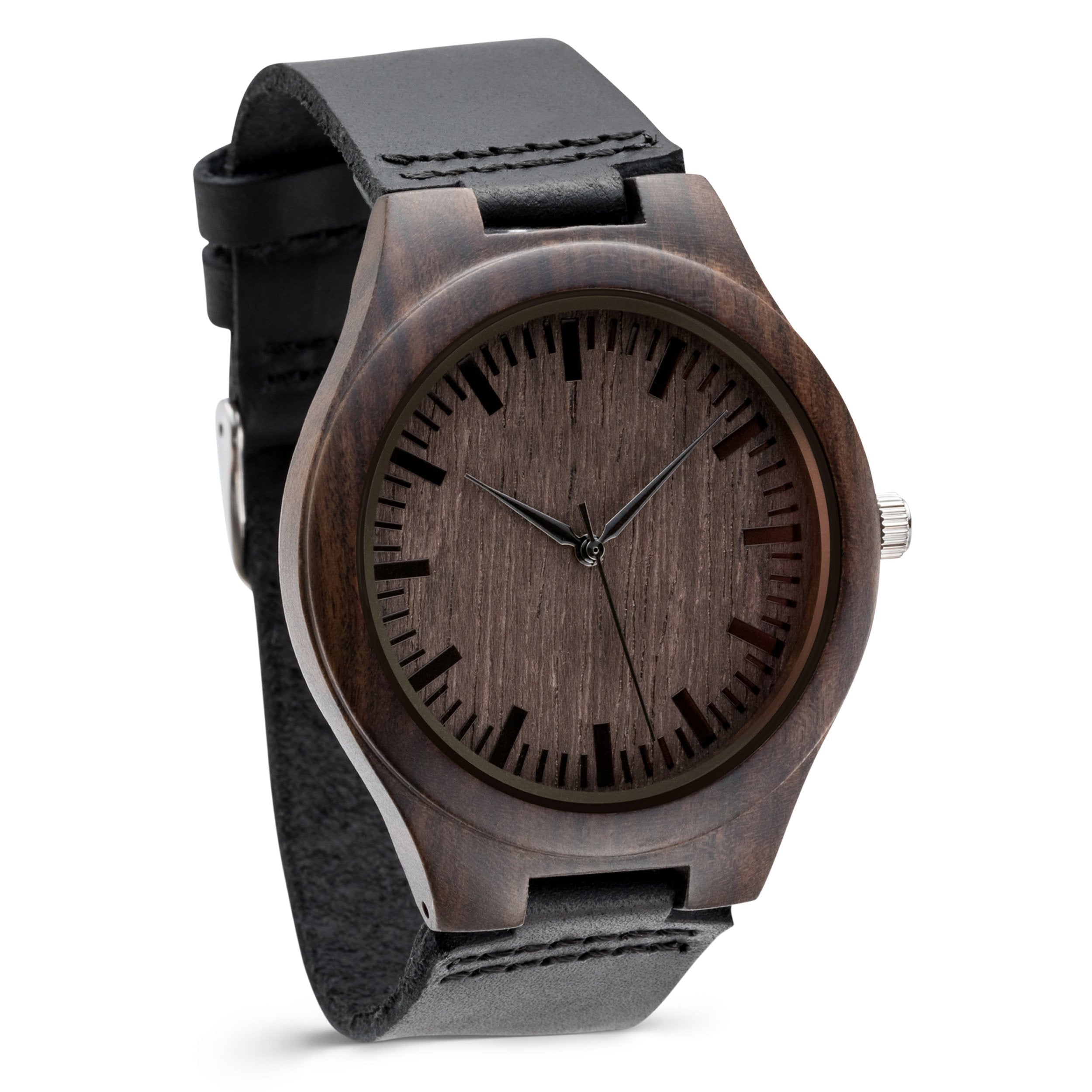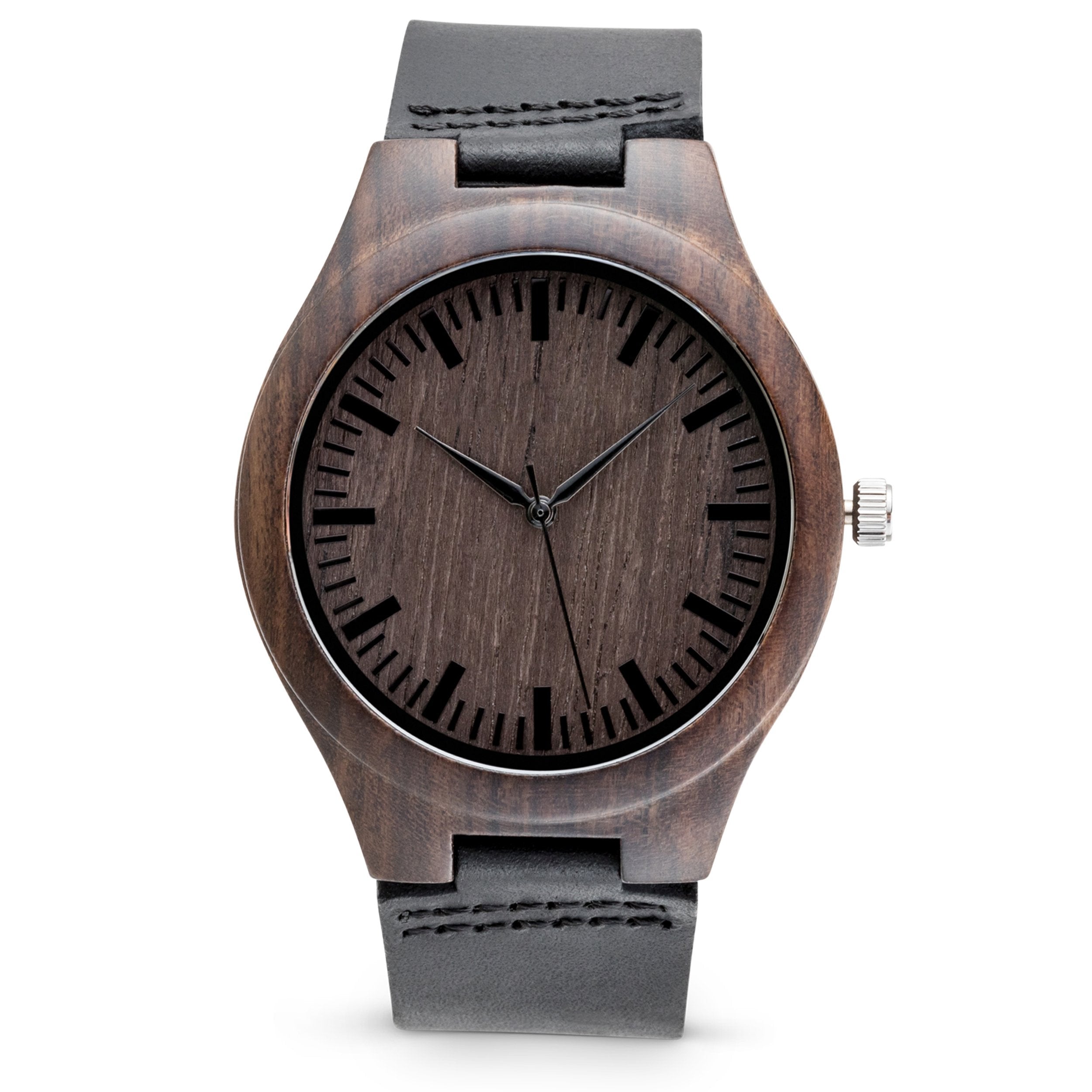 The Clark Ebony wooden watch lends a sleek, understated tone to your everyday look. Crafted from a single piece of black sandalwood and finished with a genuine black leather band, this watch is designed for long-wearing comfort. Its style-forward design is matched by superior function: reliable quartz movement and bold dial markers are built for elite performance. Add custom engraving to your Clark watch to create the perfect gift for any occasion. For added impact, upload a photo of your handwritten message to make your gift truly unique.