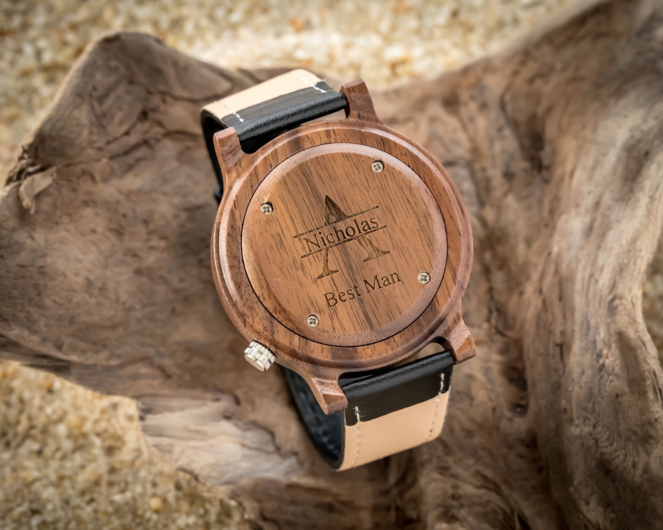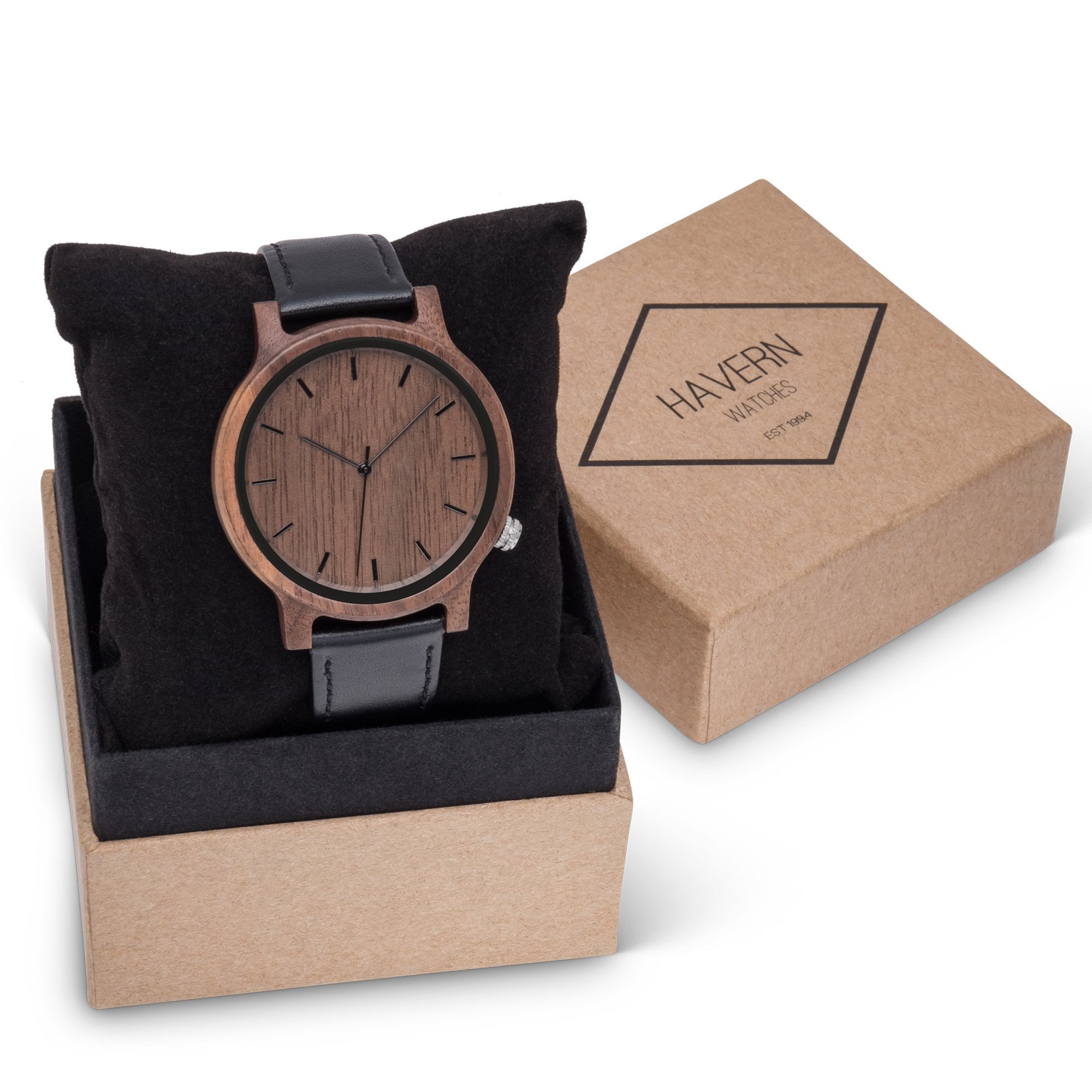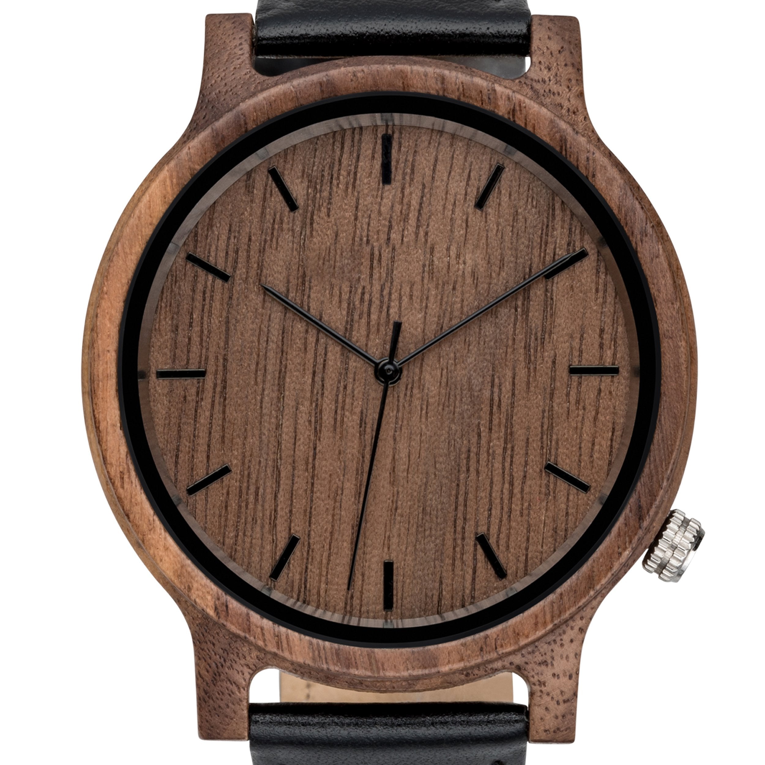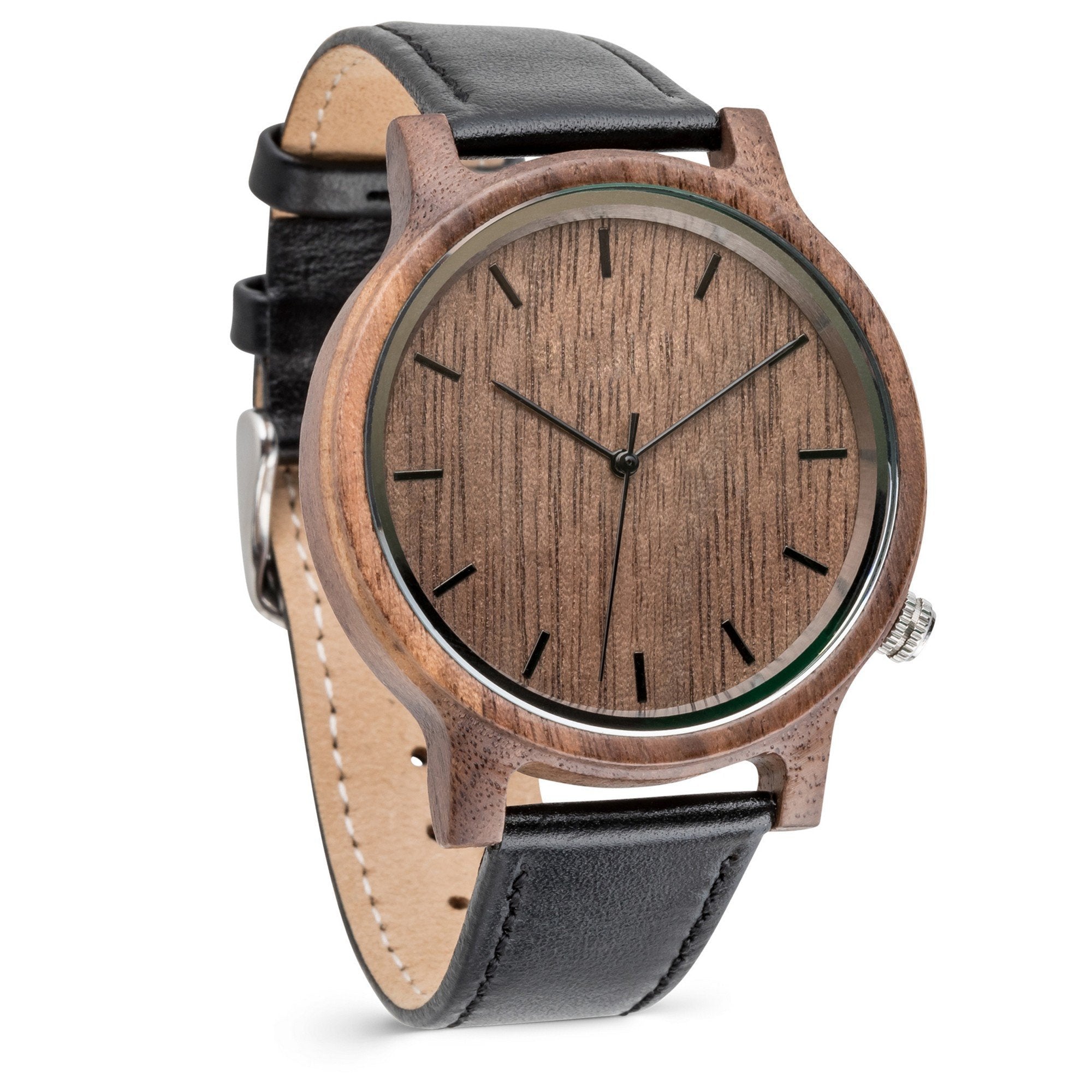 Perfect for the modern gentleman with classic tastes, the Leo Walnut wooden watch is a timeless everyday accessory. Crafted from a single piece of U.S.A.-sourced walnut wood and a genuine black leather band, this watch is designed for long-wearing comfort. Its style-forward design is matched by superior function: reliable quartz movement and notch dial markers are built for elite performance. Add custom engraving to your Leo watch to create the perfect gift for any occasion. For added impact, upload a photo of your handwritten message to make your gift truly unique.