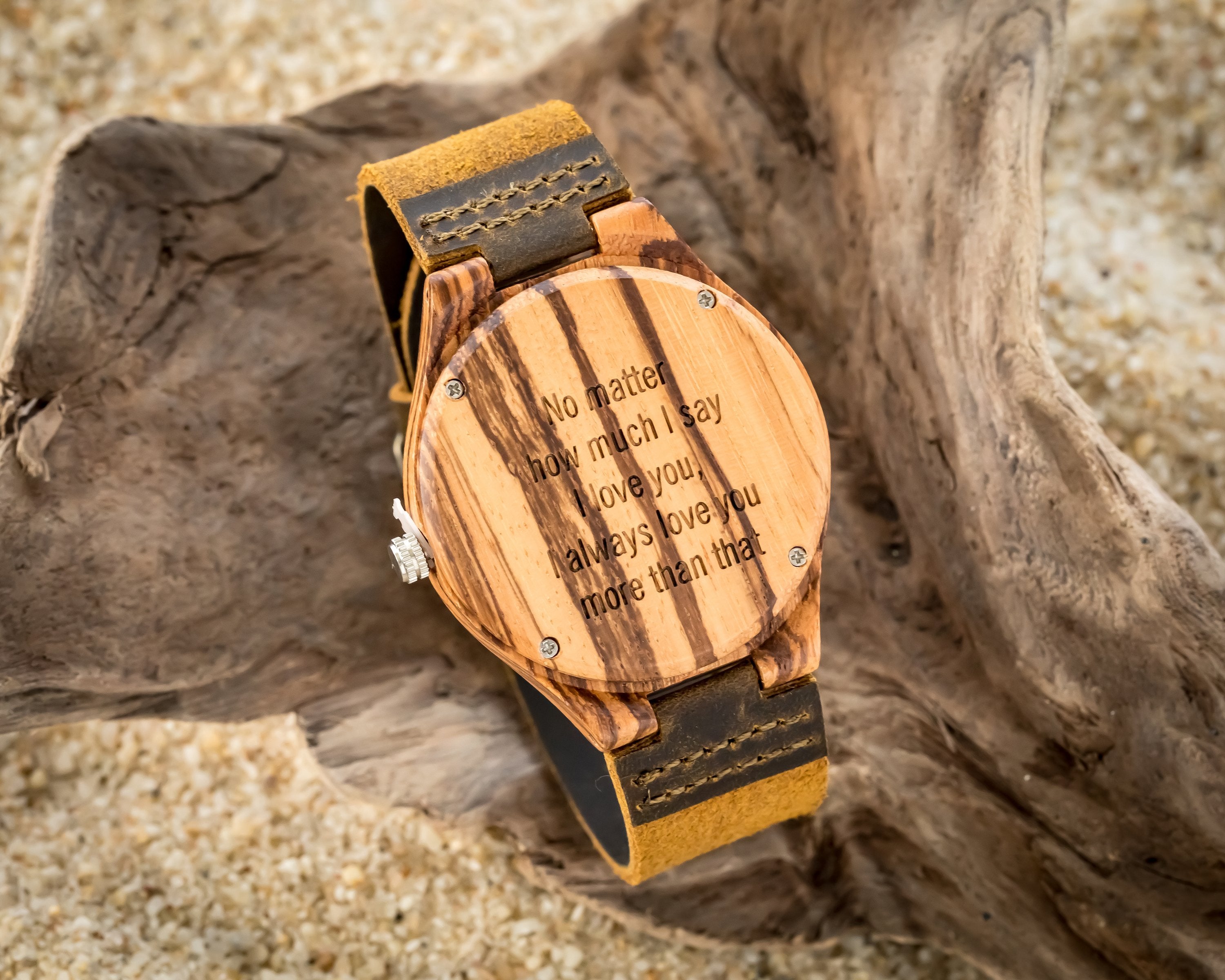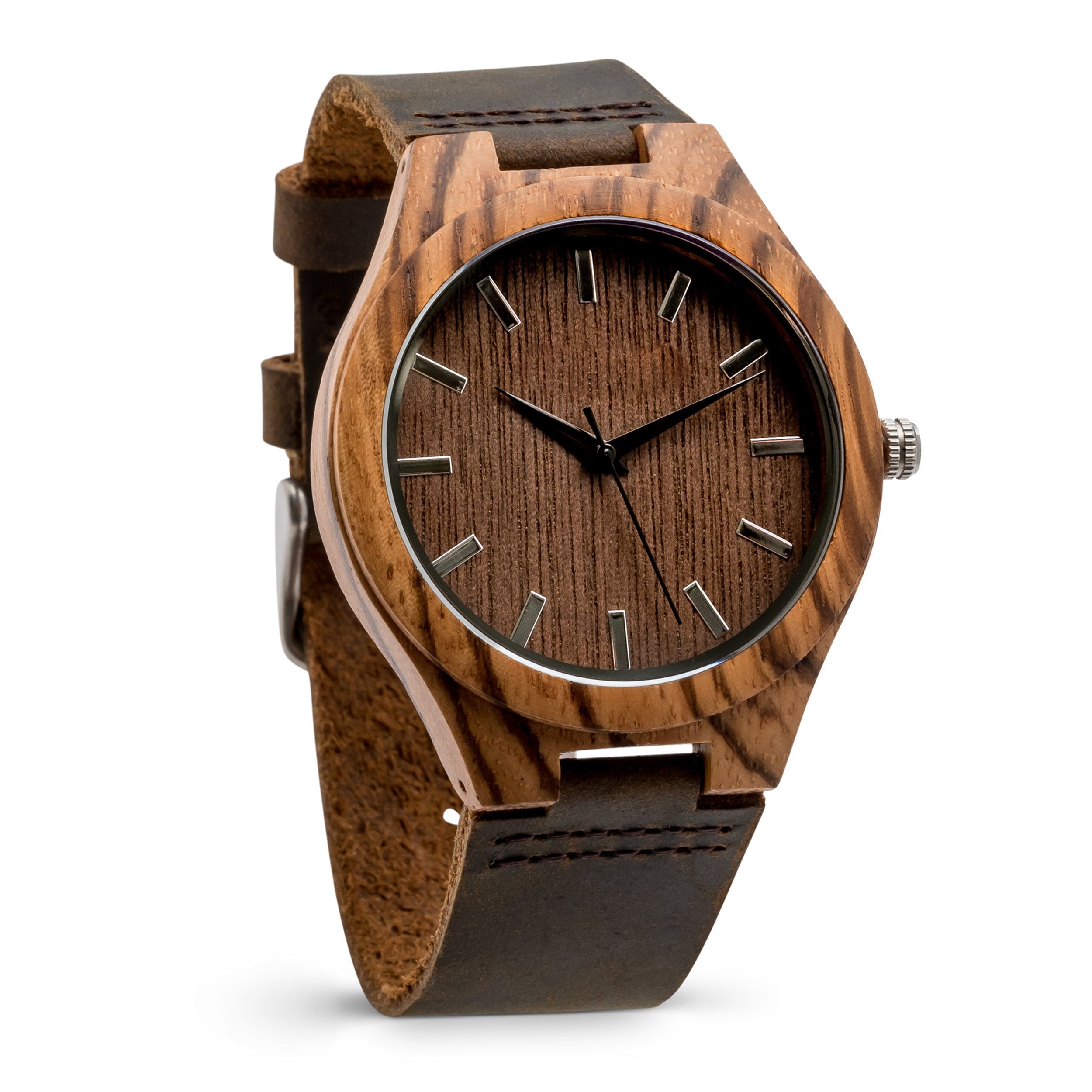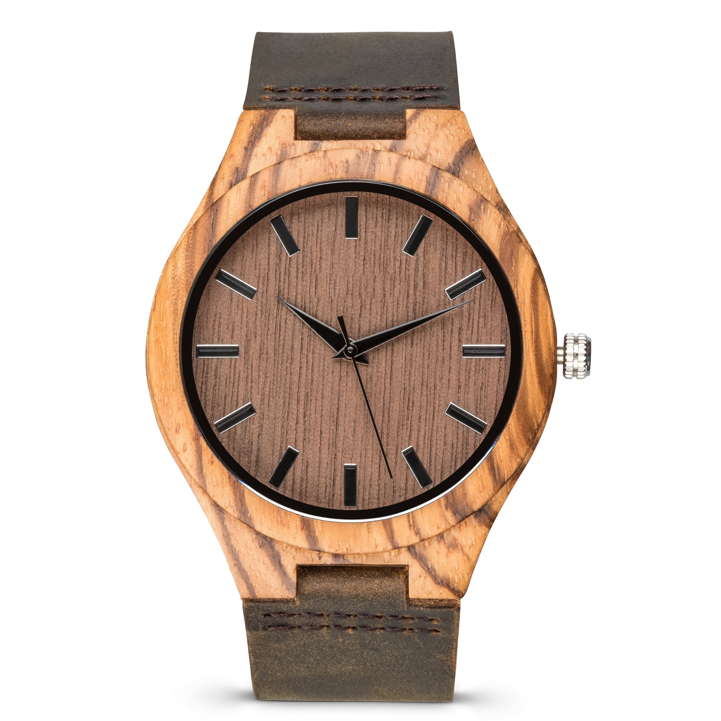 The Olympic Zebrawood wooden watch pairs rich natural textures with the effortless simplicity of modern design. Crafted from a single piece of zebrawood, this watch is finished with a genuine brown leather band to create a sleek high-contrast look. Its style-forward design is matched by superior function: reliable quartz movement and bold dial markers are built for elite performance. Add custom engraving to your Olympic watch to create the perfect gift for any occasion. For added impact, upload a photo of your handwritten message to make your gift truly unique.