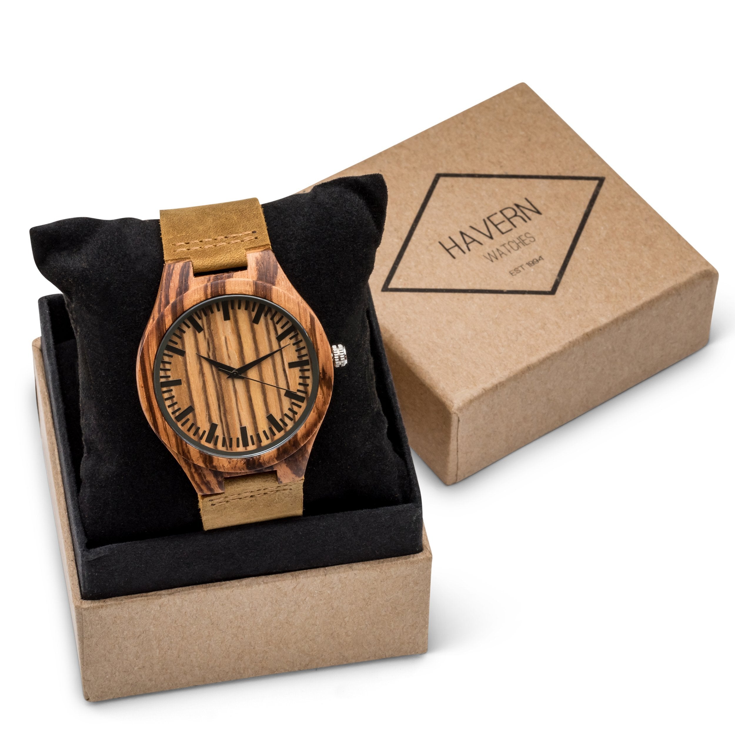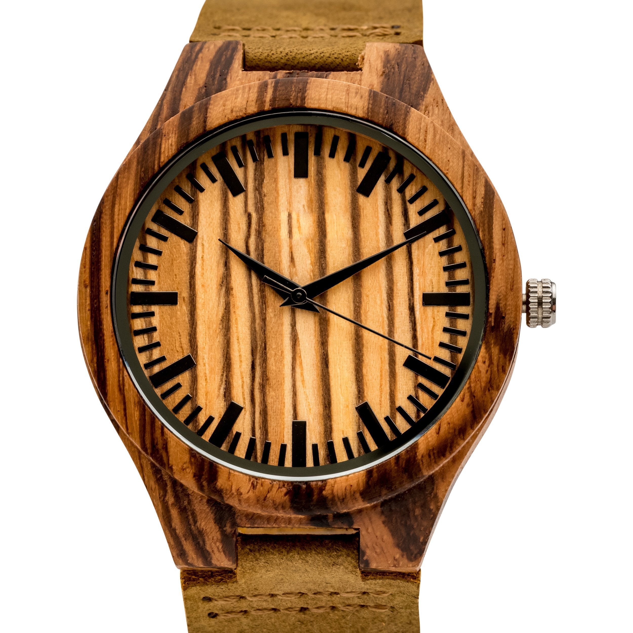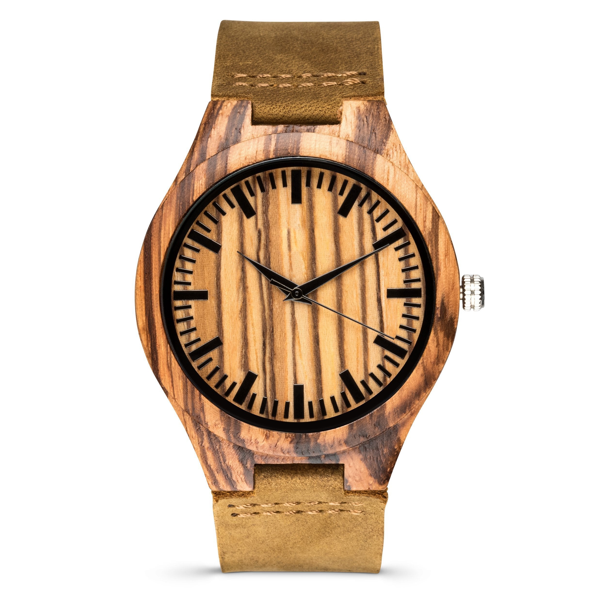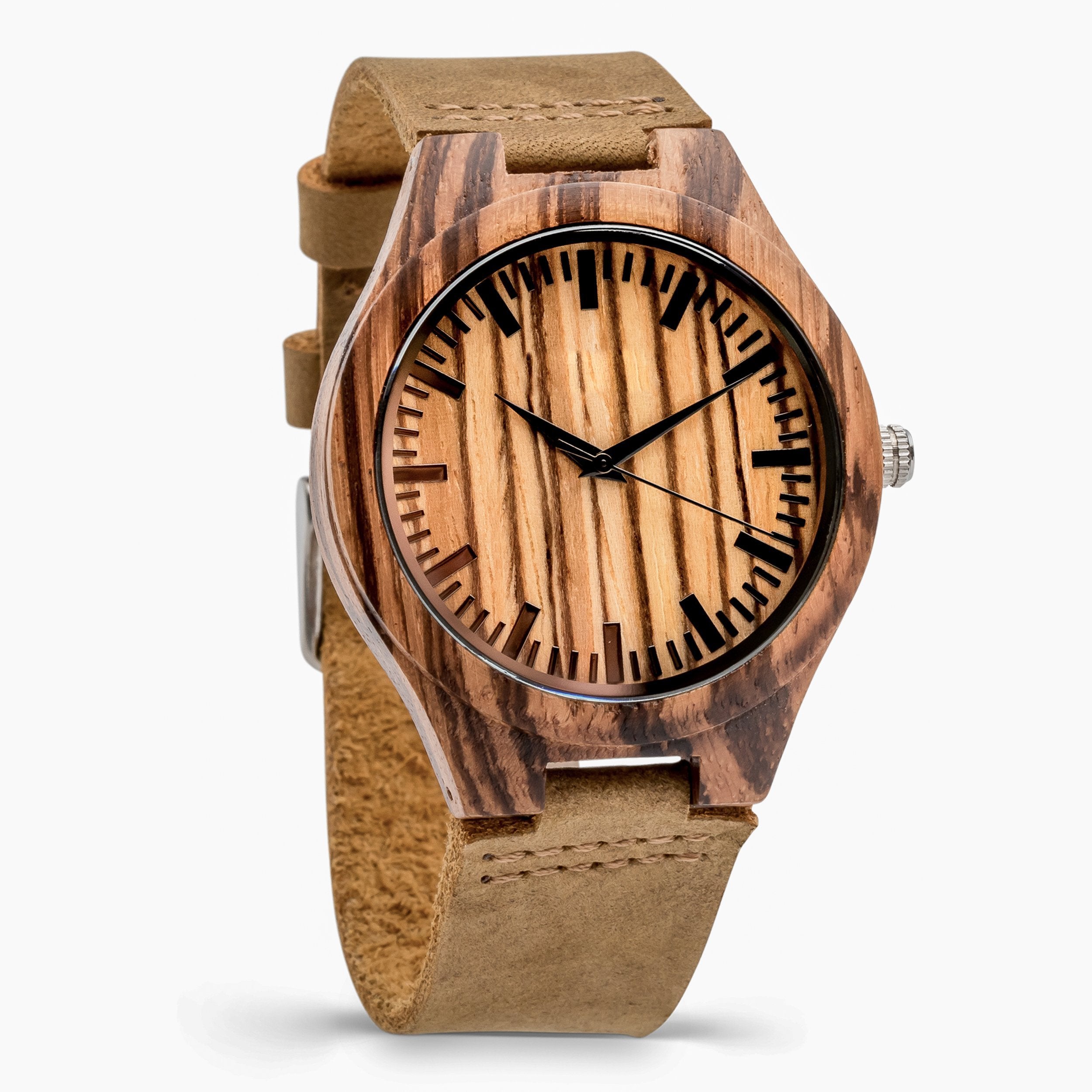 The Woodland Classic wooden watch mixes warm natural tones with sophisticated textures for a timeless everyday look. Crafted from a single piece of zebrawood and a genuine tan leather band, this watch is designed for long-wearing comfort. Its style-forward design is matched by superior function: reliable quartz movement and bold dial markers are built for elite performance. Add custom engraving to your Woodland watch to create the perfect gift for any occasion. For added impact, upload a photo of your handwritten message to make your gift truly unique.