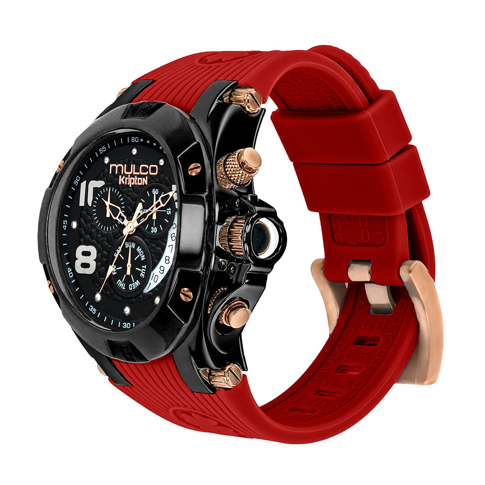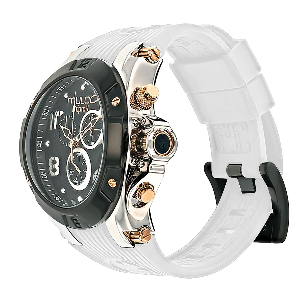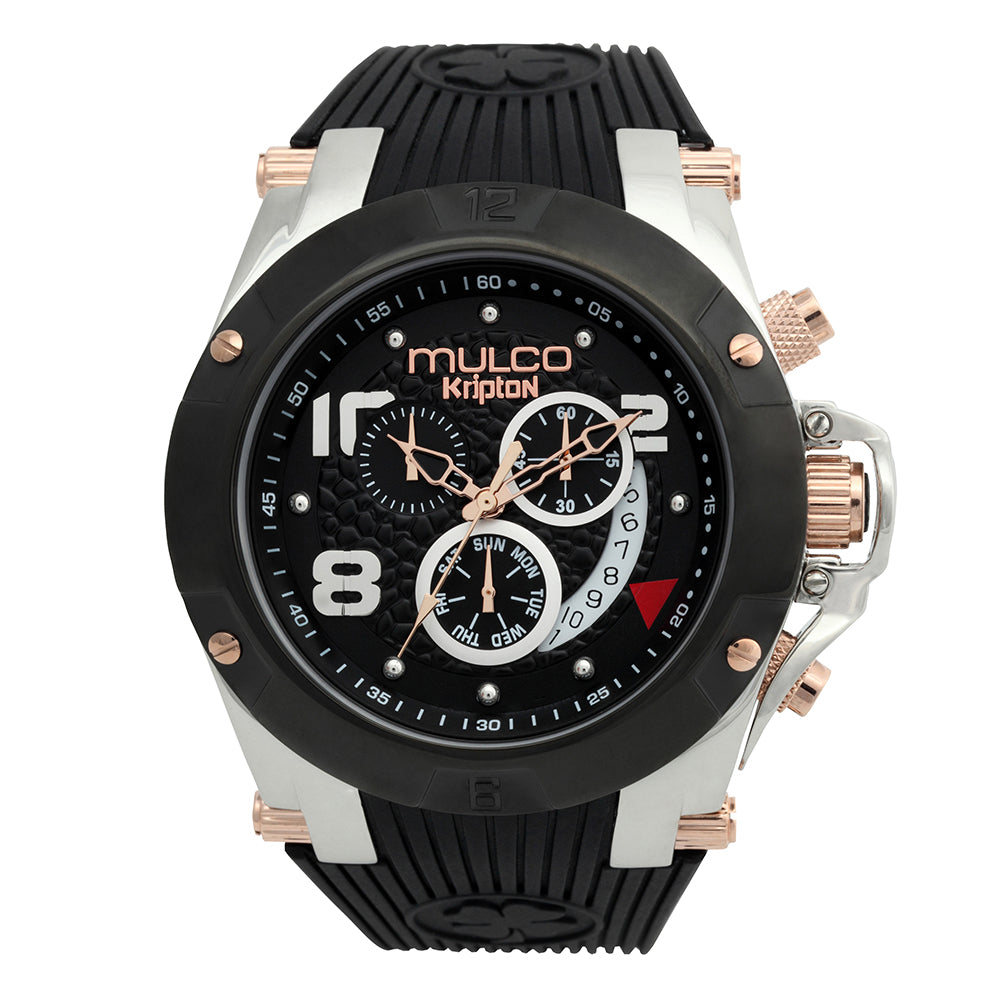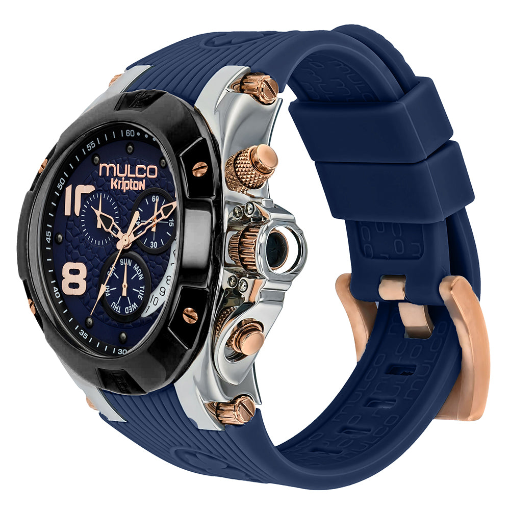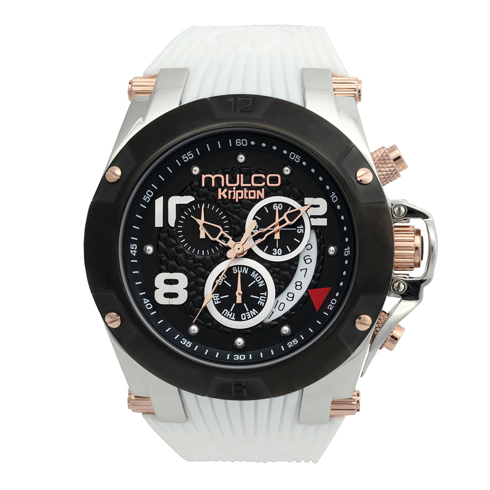 Mulco Krypton City is a highly calculated collection with unique interconnectivity between its elements. It features a clasp system, a semicircular date window, and a remarkably curved case. It is 100 meters water-resistant.