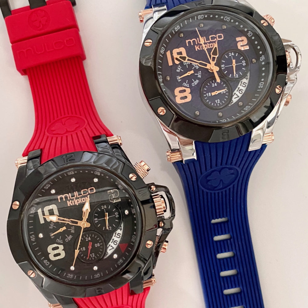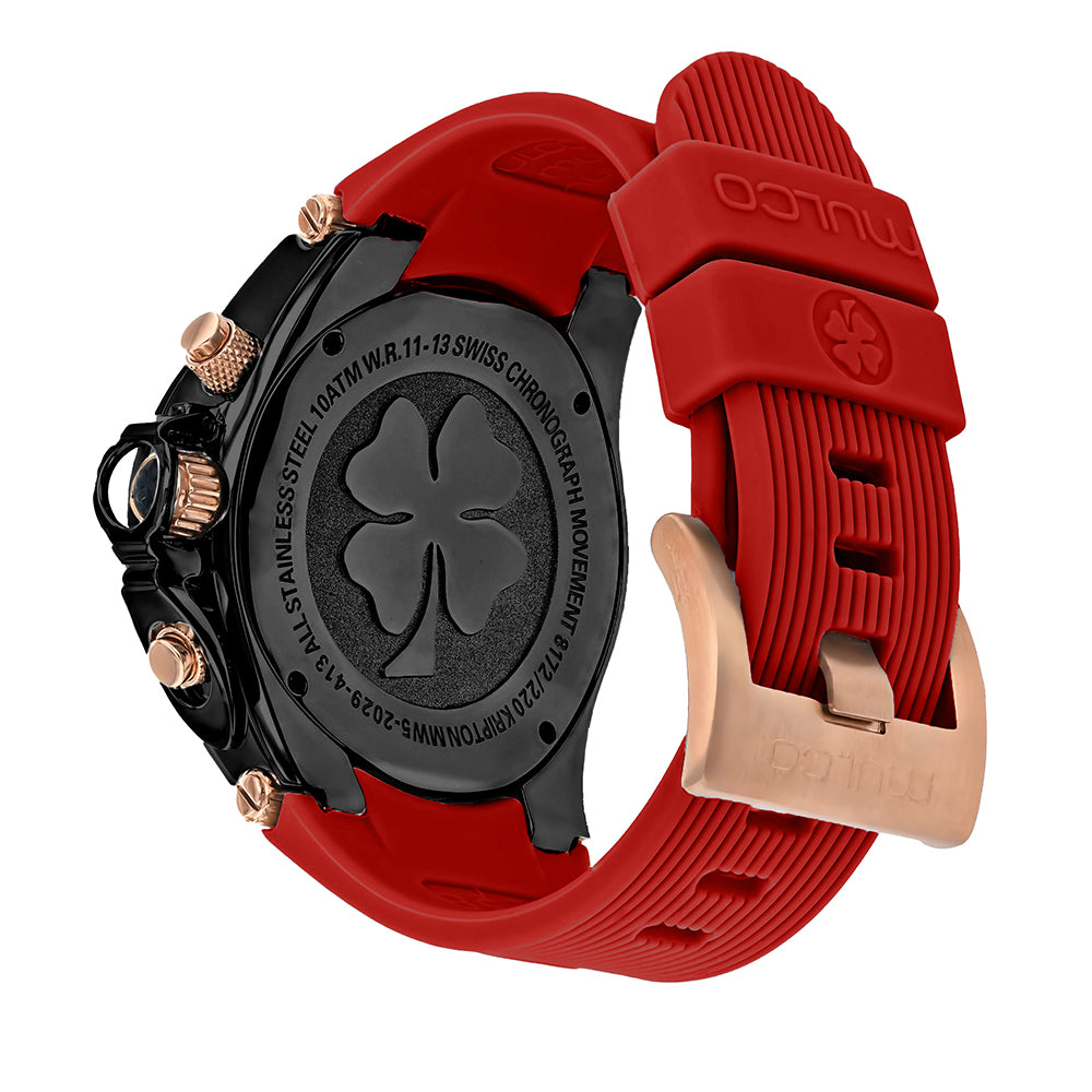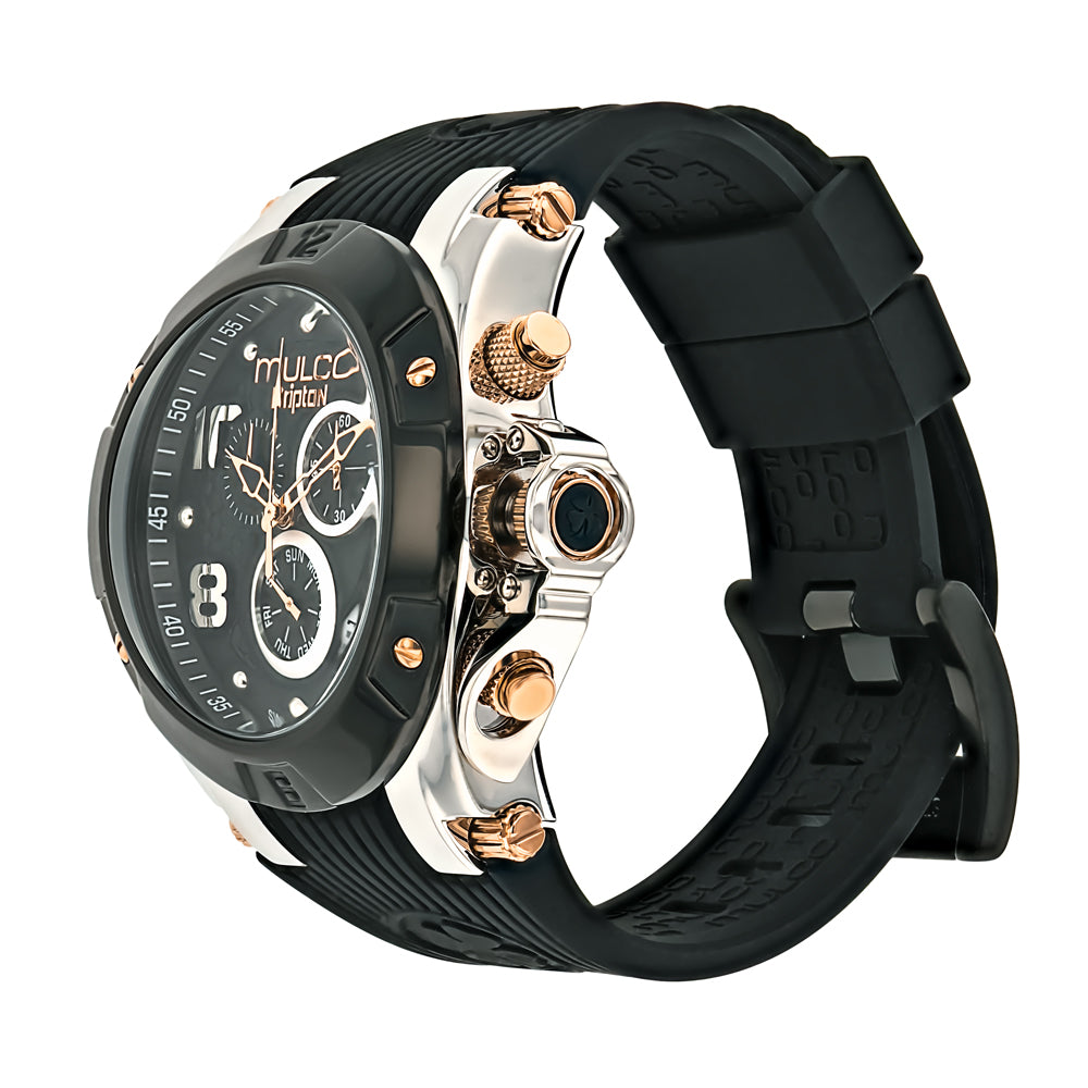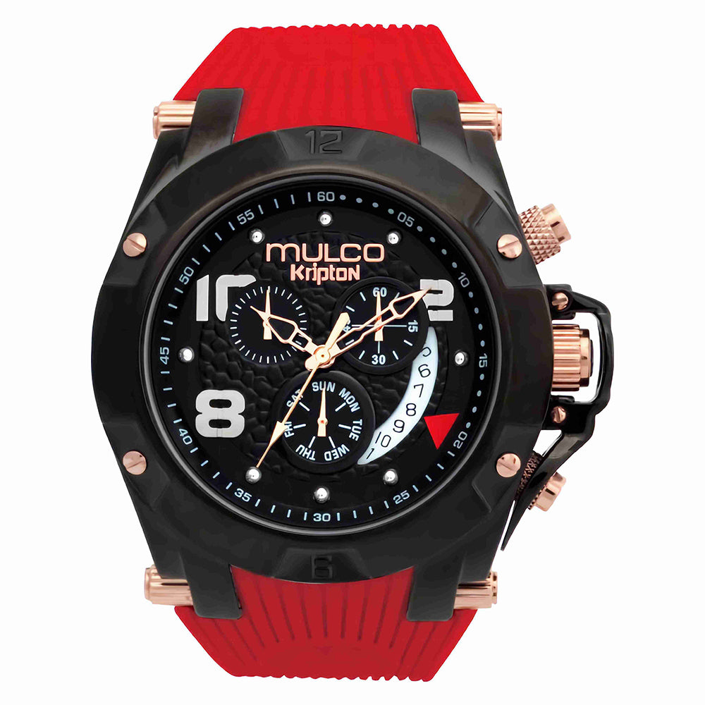 Mulco Krypton City is a highly calculated collection with unique interconnectivity between its elements. It features a clasp system, a semicircular date window, and a remarkably curved case. It is 100 meters water-resistant.