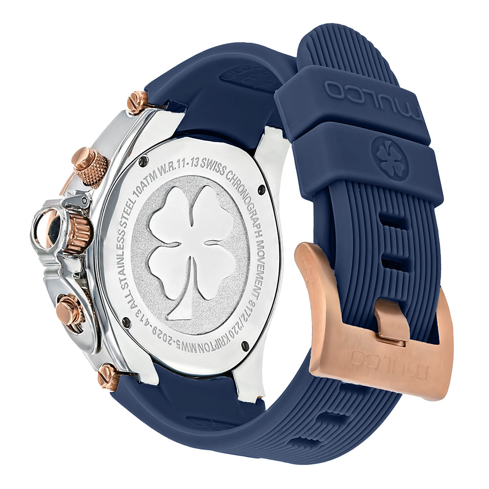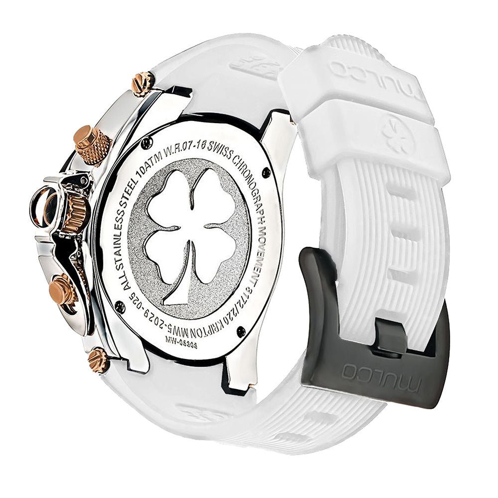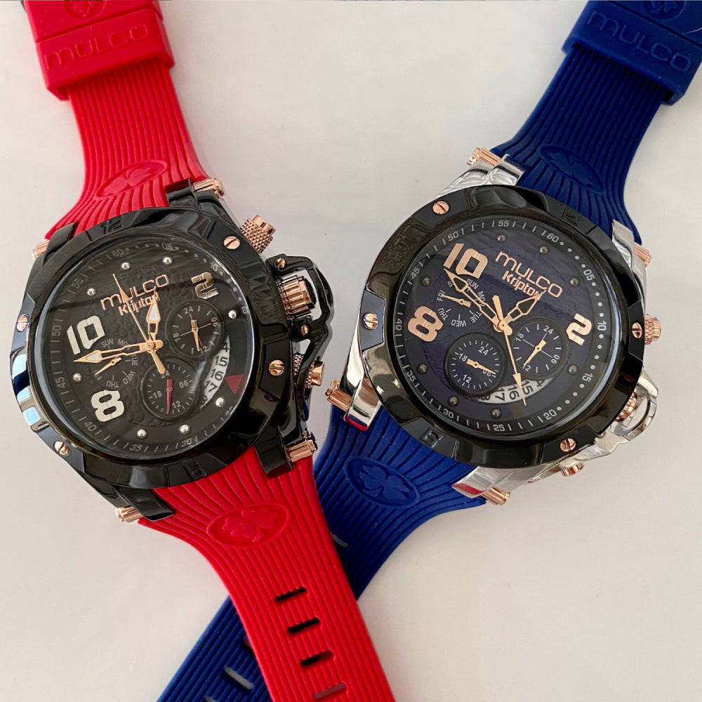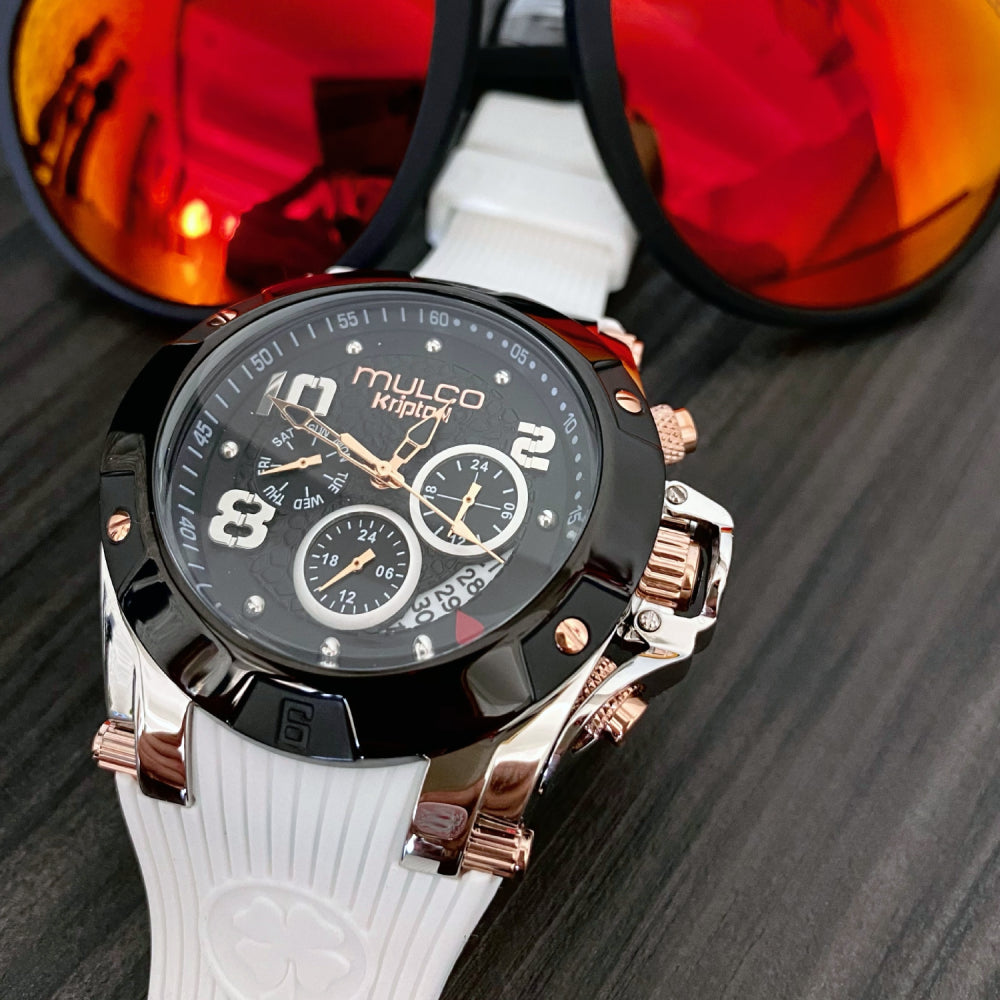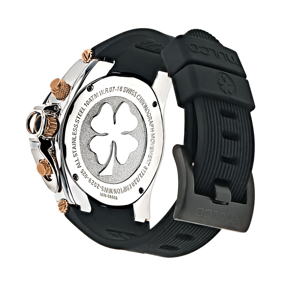 Mulco Krypton City is a highly calculated collection with unique interconnectivity between its elements. It features a clasp system, a semicircular date window, and a remarkably curved case. It is 100 meters water-resistant.