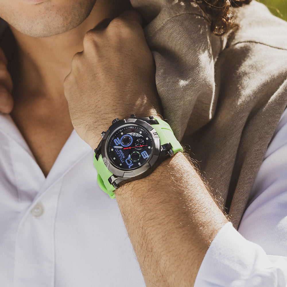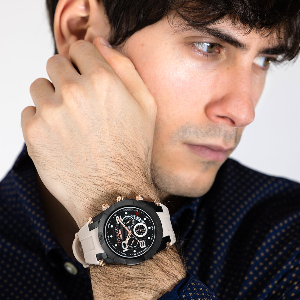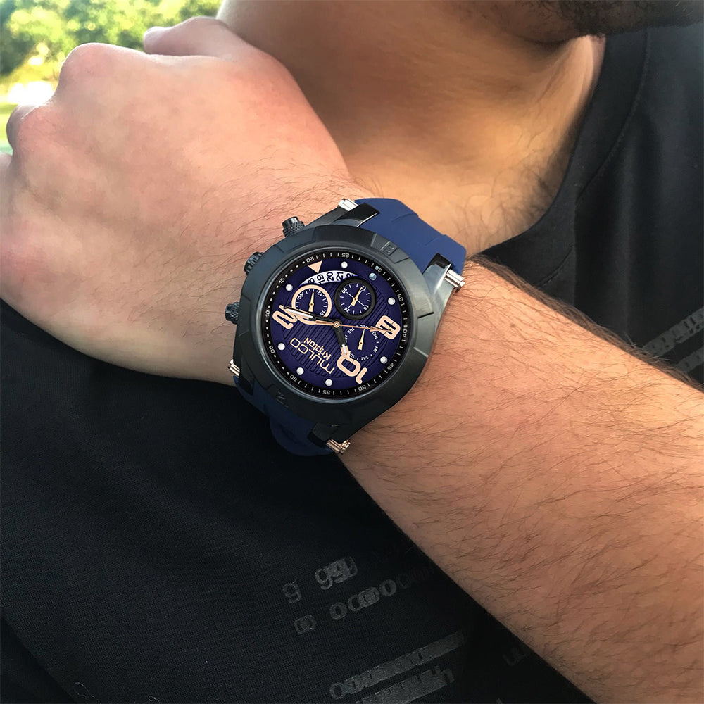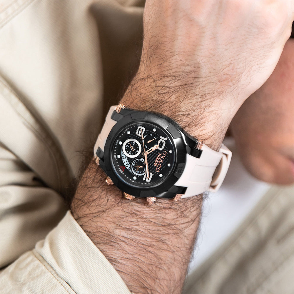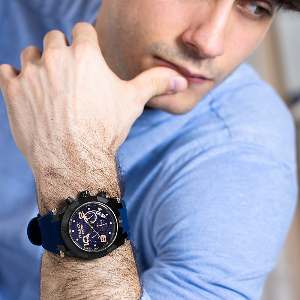 Mulco's Kripton Viper men's watch is high quality, water-resistant up to 100m, and features a semicircular date window and a curved case that fits comfortably on the wrist.
