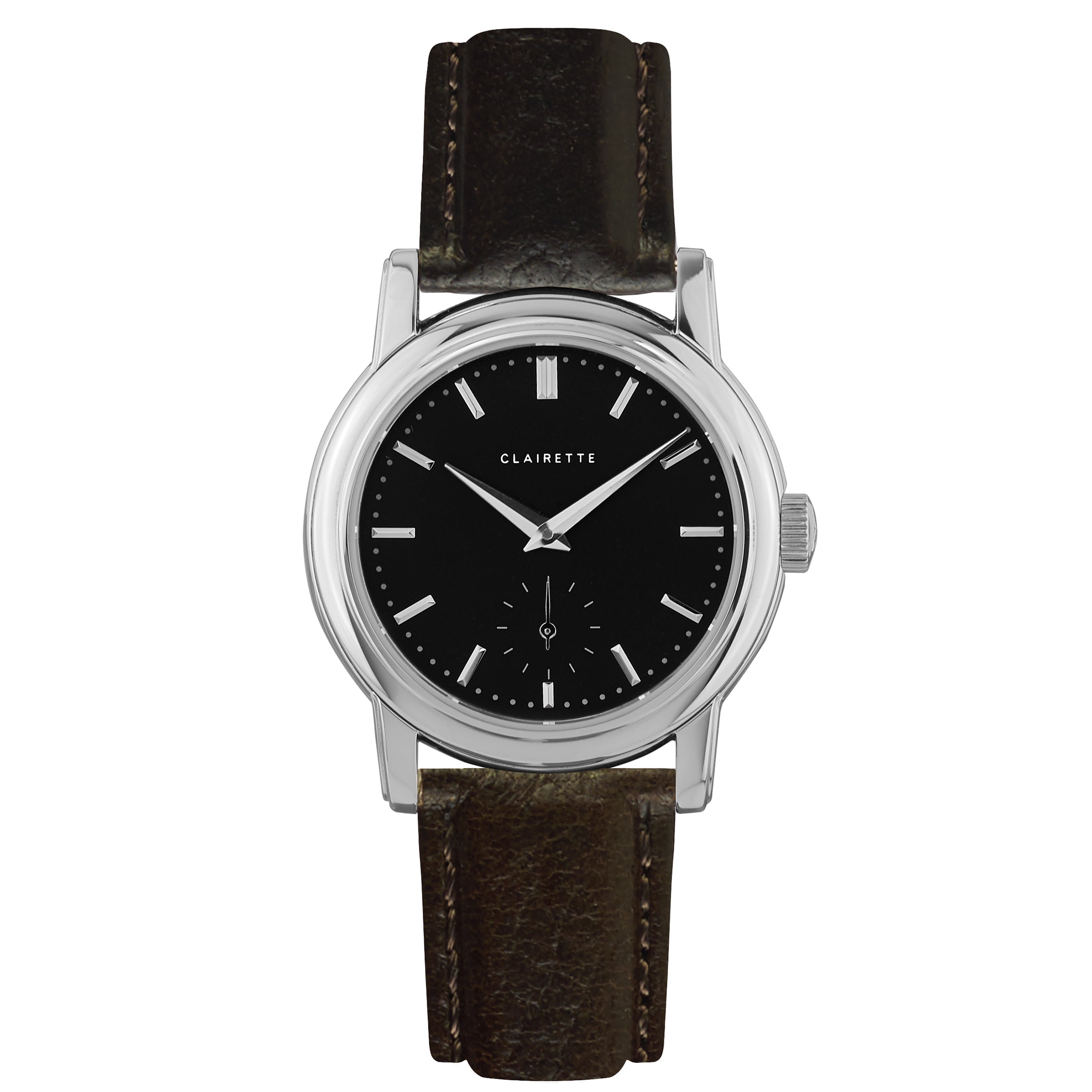 • Damklocka i rostfritt stål med svart urtavla och brunt läderarmband