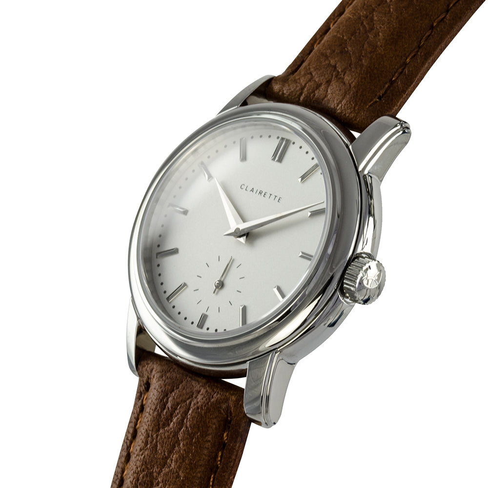 Klockan är inspirerad av designelement som du hittar i klockor från mitten av seklet, som ibland kallas klockdesignens belle époque. En lite mindre urtavla skapar tillsammans med de rundade kanterna en välbalanserad klocka för alla handledsstorlekar.