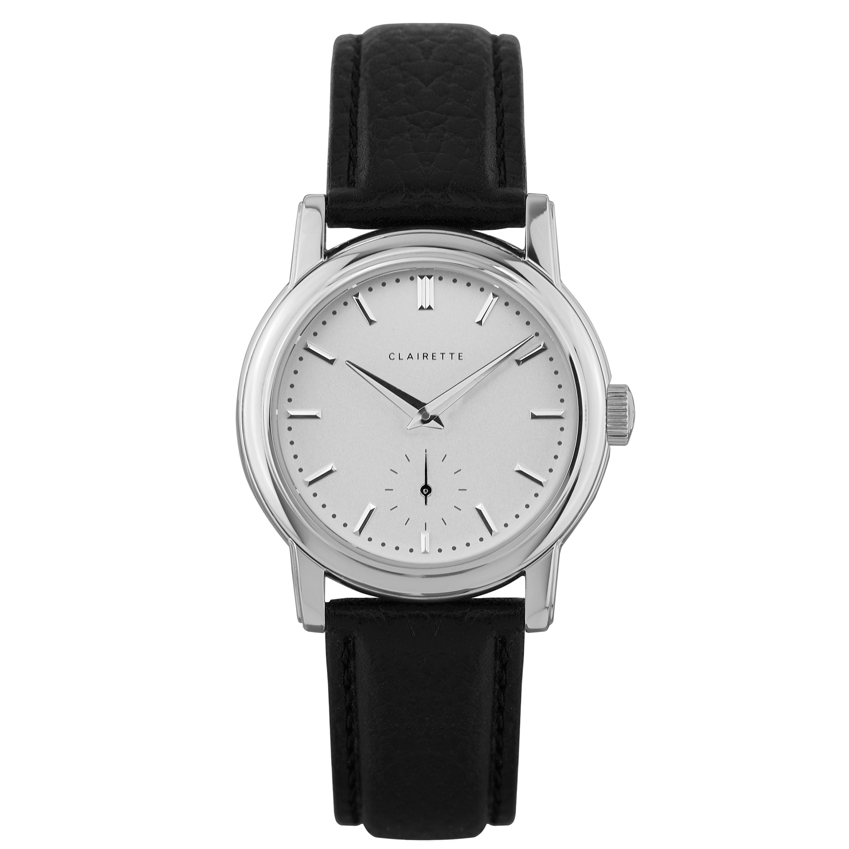 • Damklocka i rostfritt stål med vit urtavla och svart läderarmband