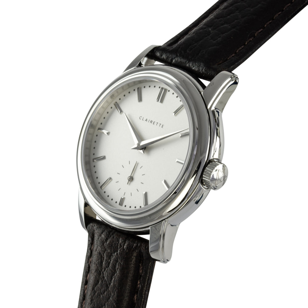Klockan är inspirerad av designelement som du hittar i klockor från mitten av seklet, som ibland kallas klockdesignens belle époque. En lite mindre urtavla skapar tillsammans med de rundade kanterna en välbalanserad klocka för alla handledsstorlekar.