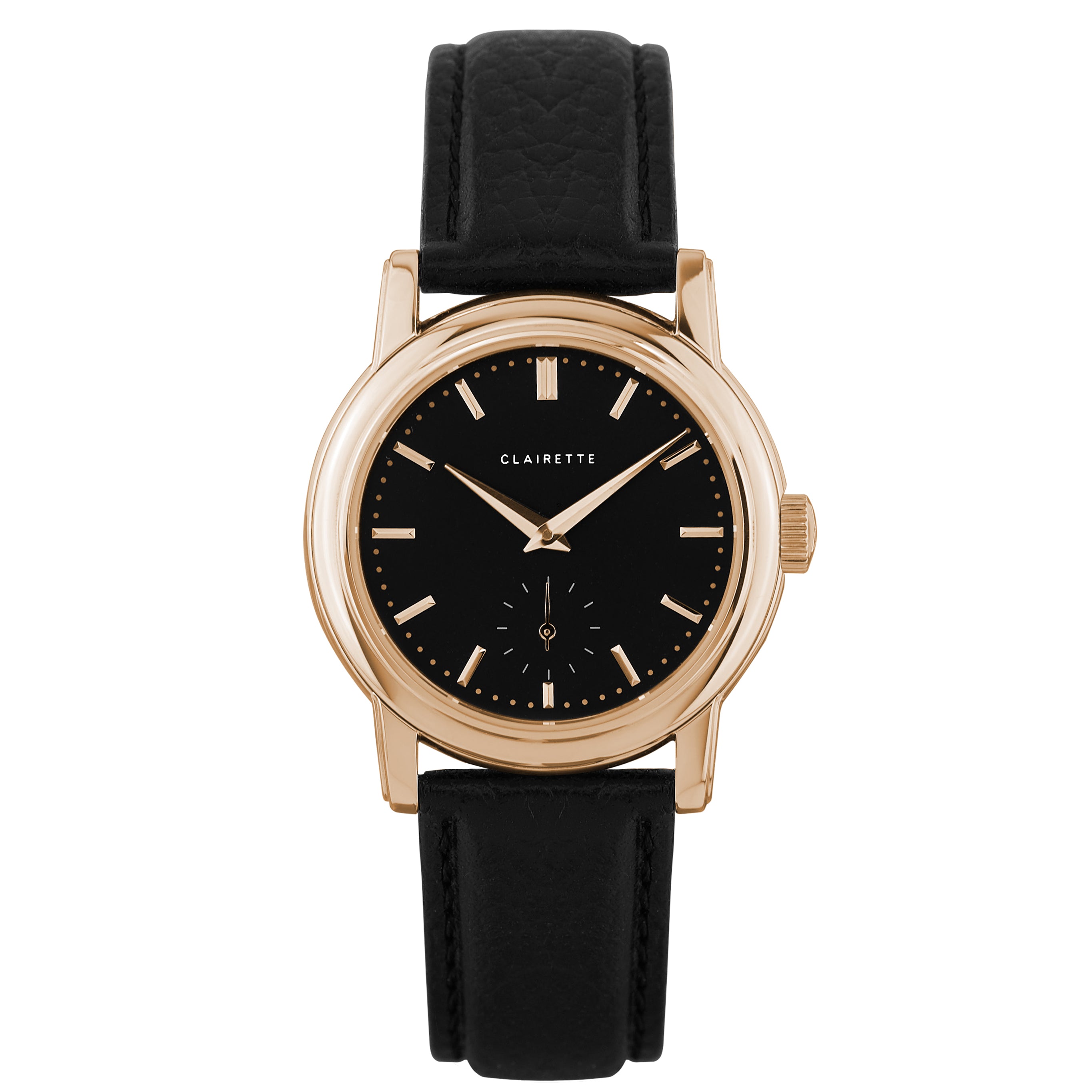 Damklocka i roséguld med svart urtavla och svart läderarmband