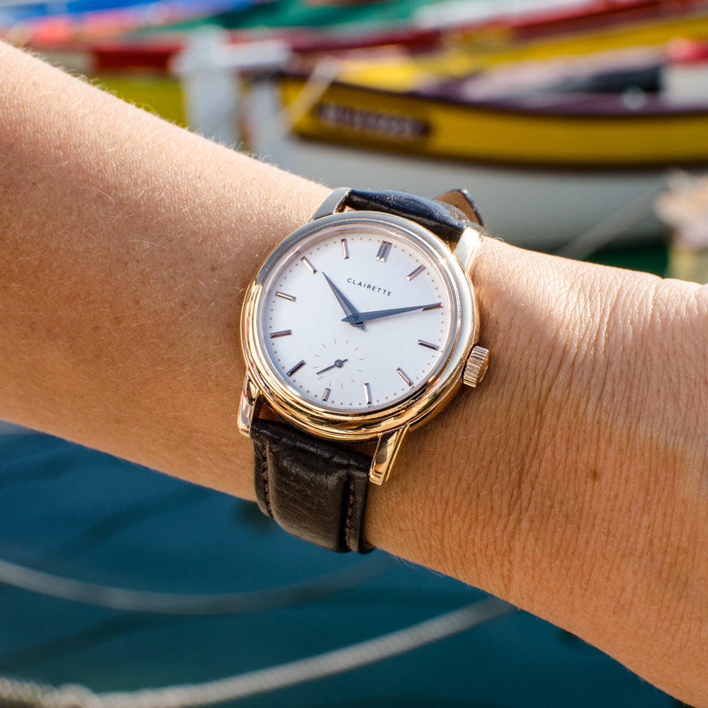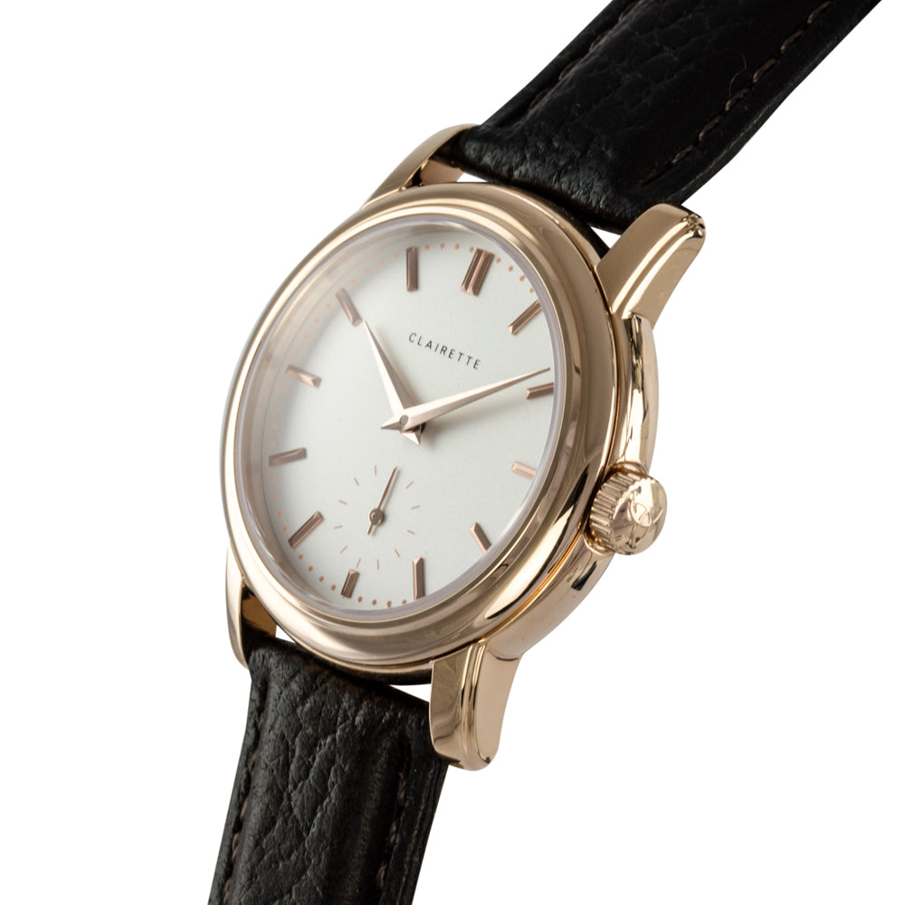 Klockan är inspirerad av designelement som du hittar i klockor från mitten av seklet, som ibland kallas klockdesignens belle époque. En lite mindre urtavla skapar tillsammans med de rundade kanterna en välbalanserad klocka för alla handledsstorlekar.