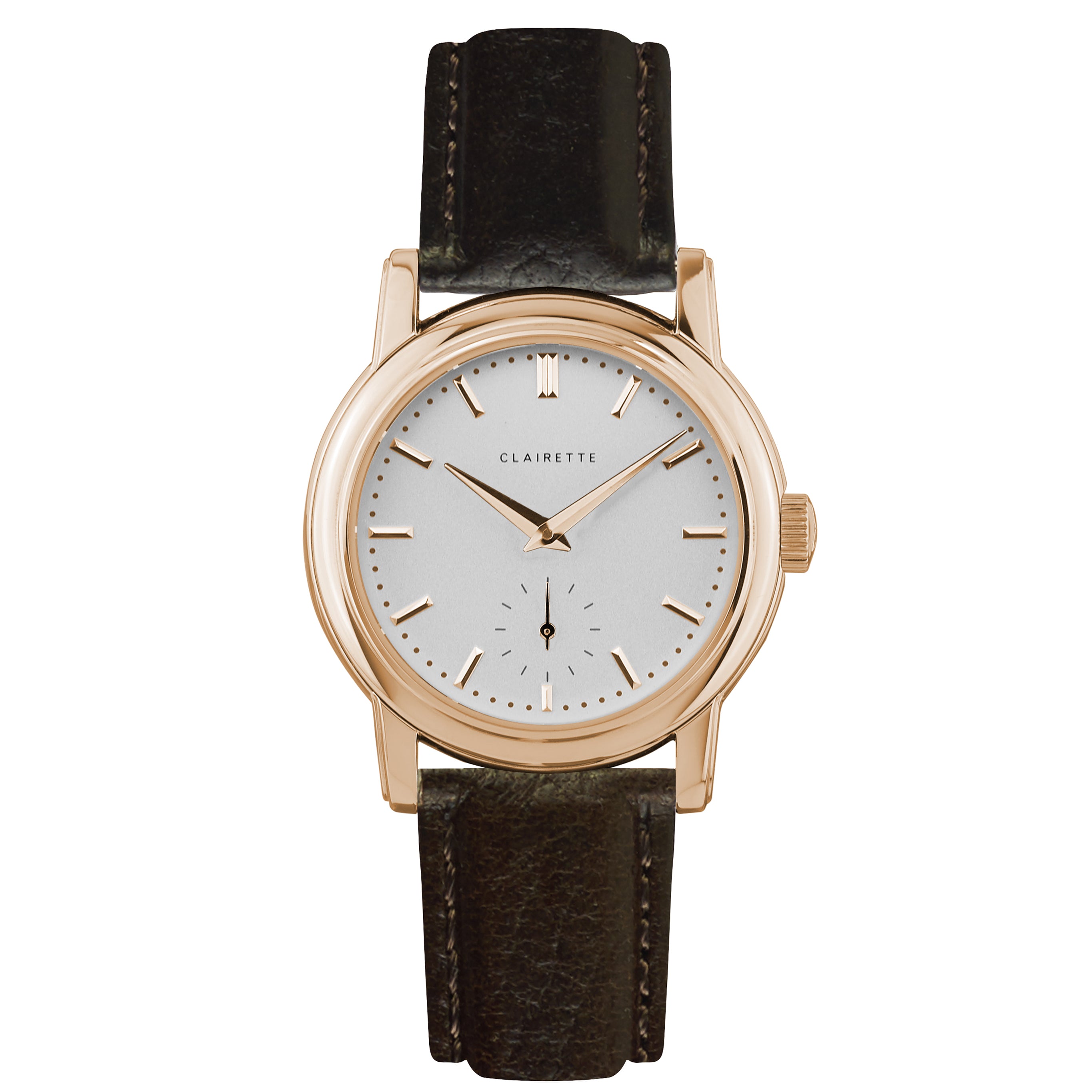 • Damklocka i roséguld med vit urtavla och brunt läderarmband