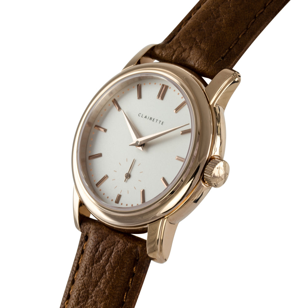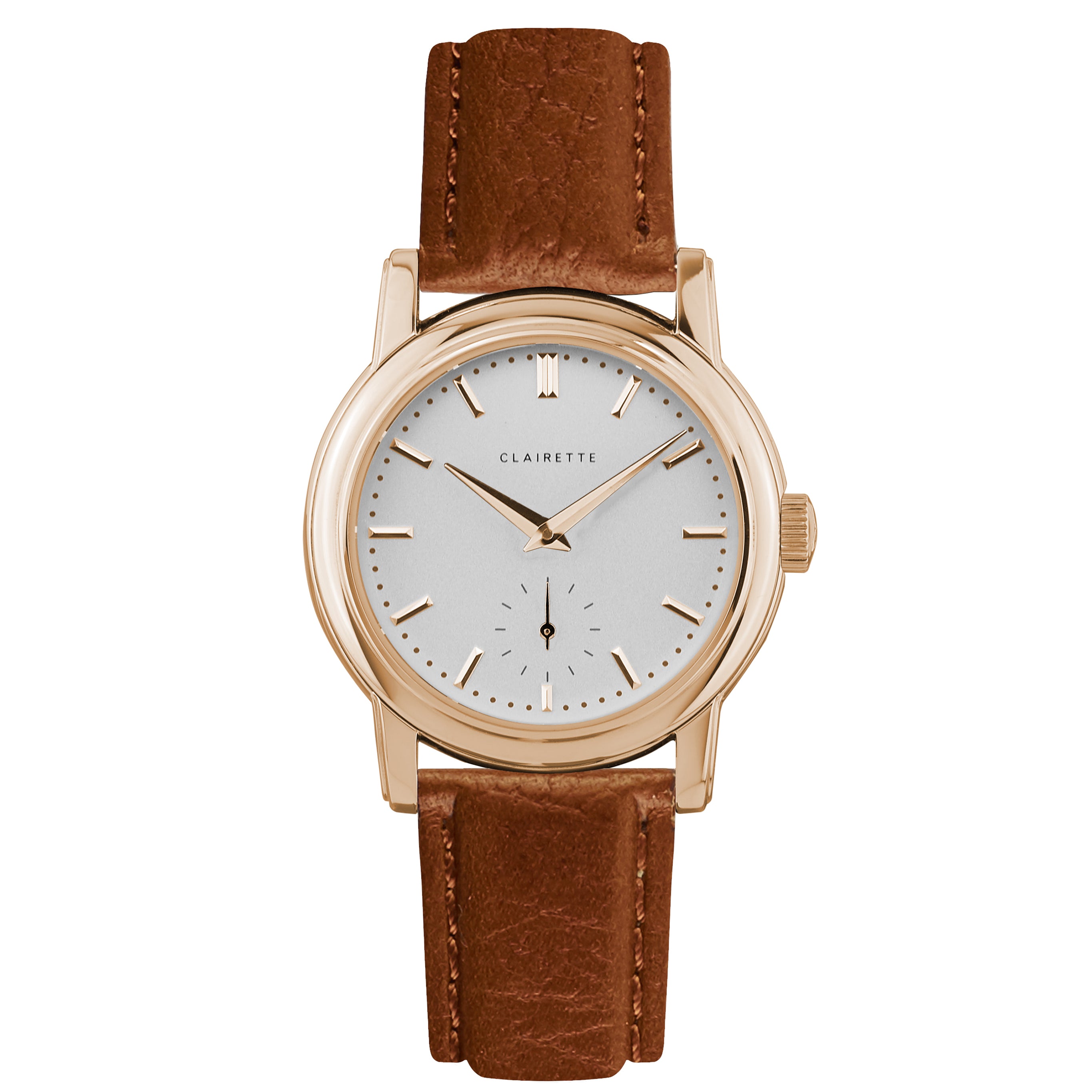 Damklocka i roséguld med vit urtavla och cognacarmband