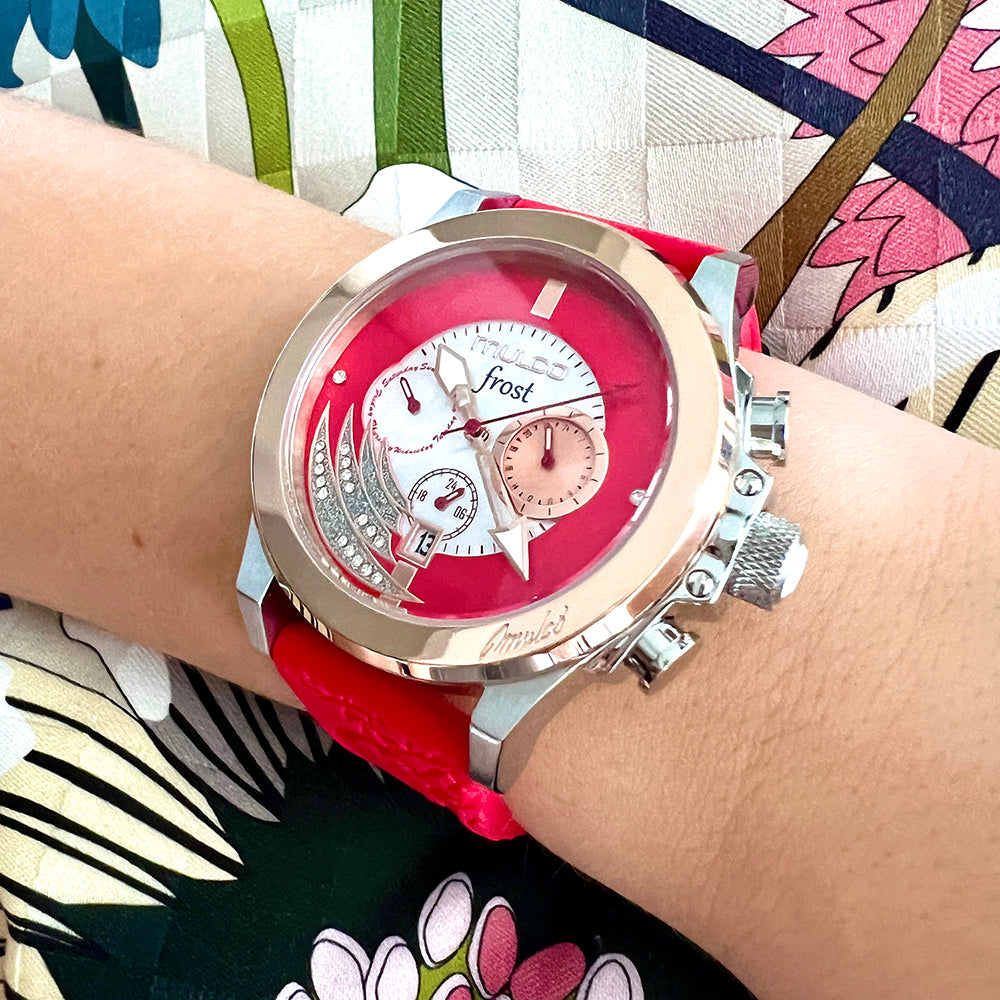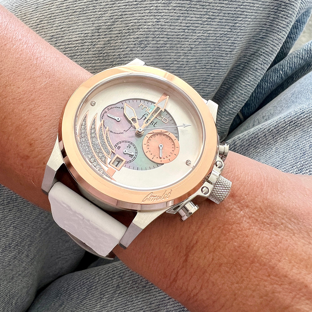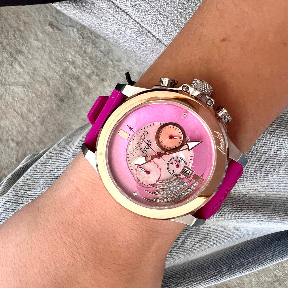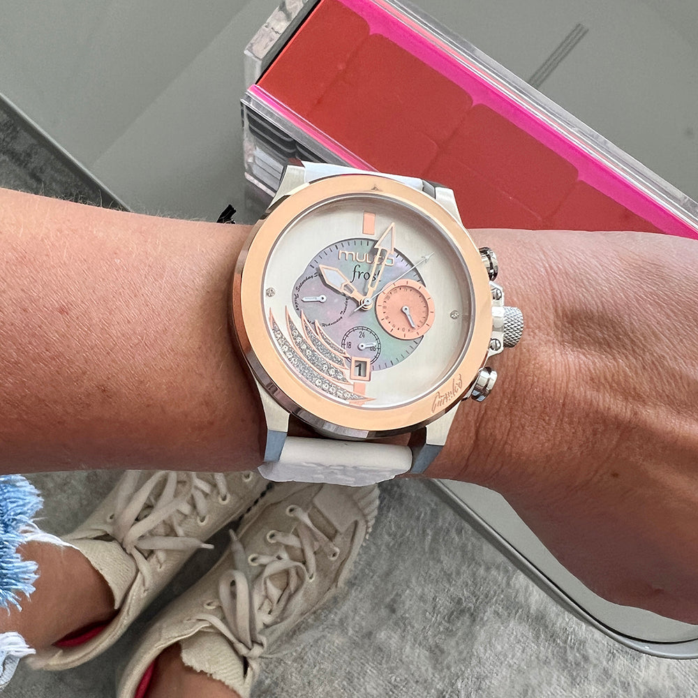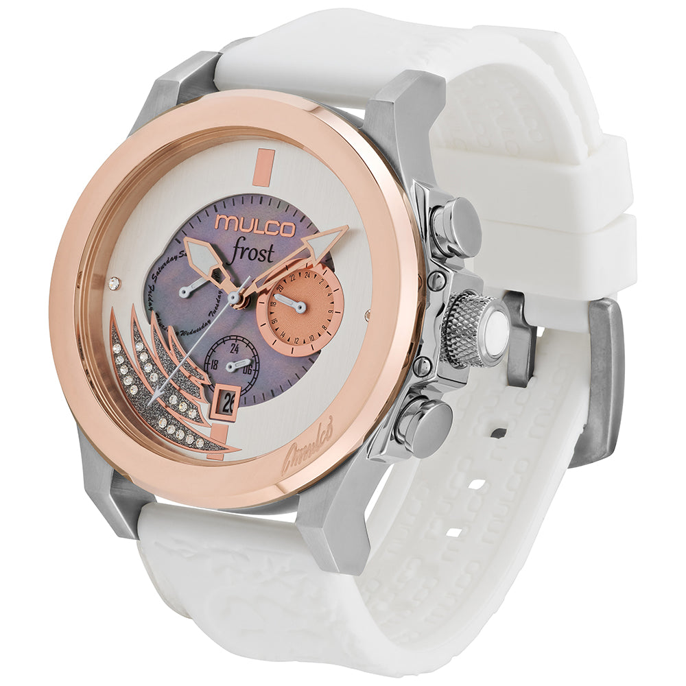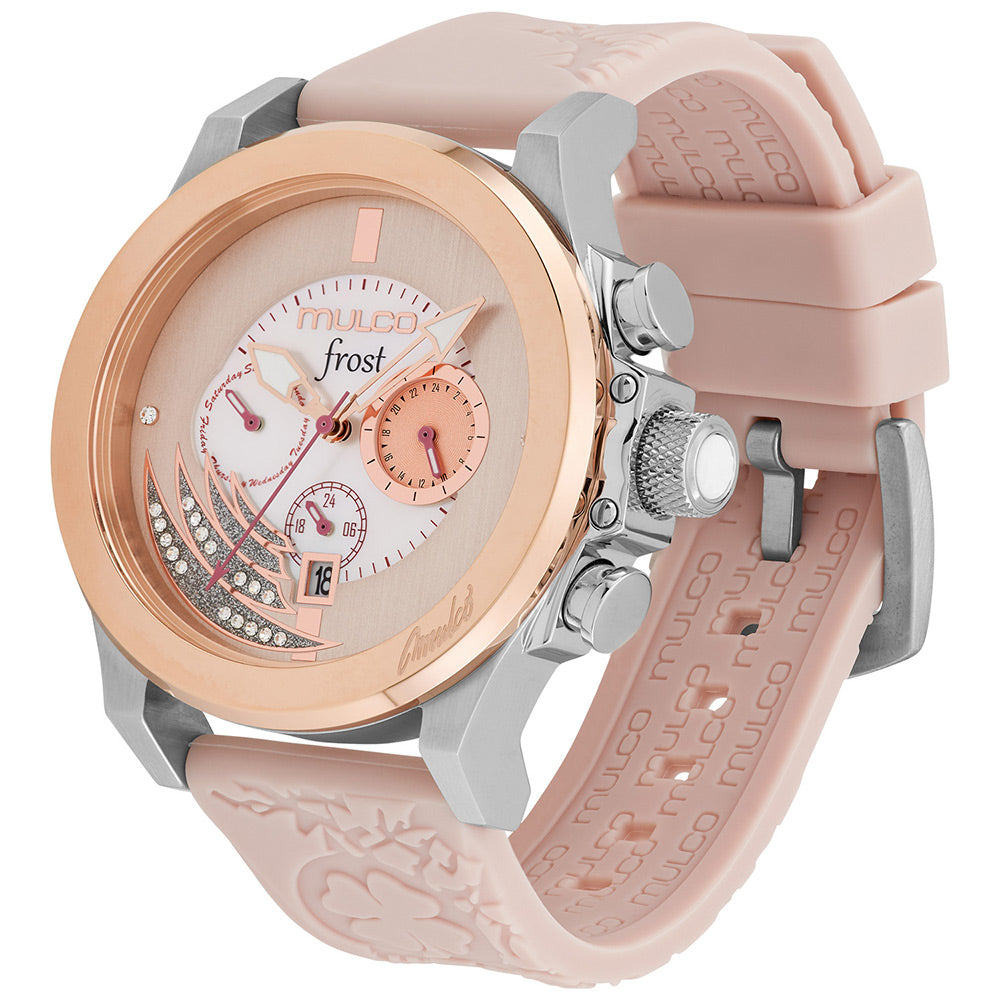 Mulco Frost Full Moon women's watch, with Swiss Chronograph Movement, mother-of-pearl and Swarovski stones, rose gold accents, and silicone band design.
