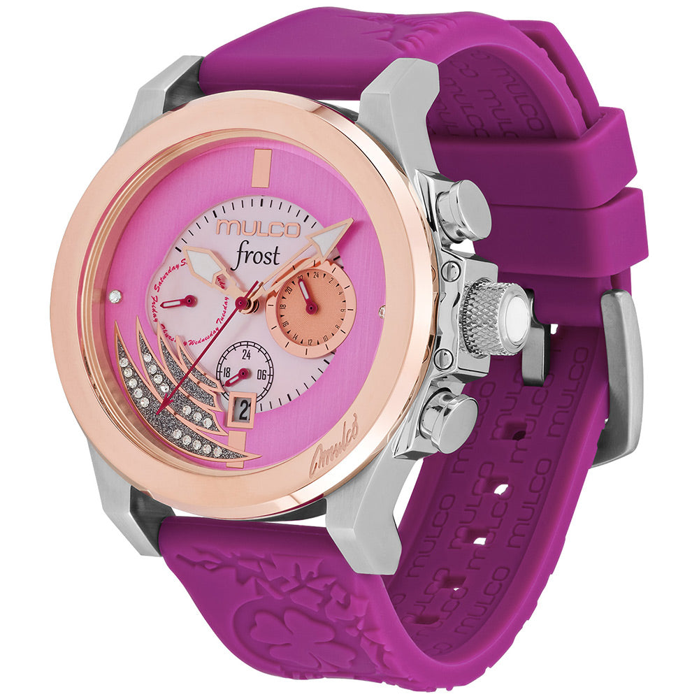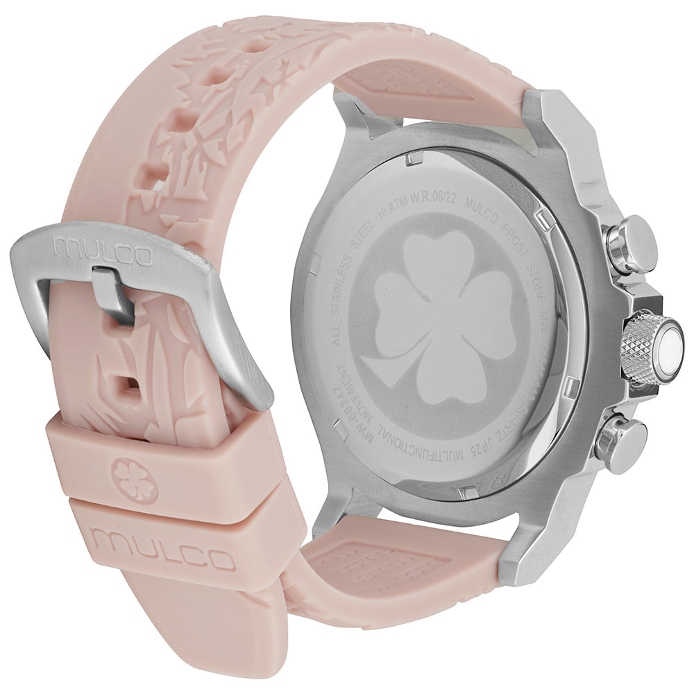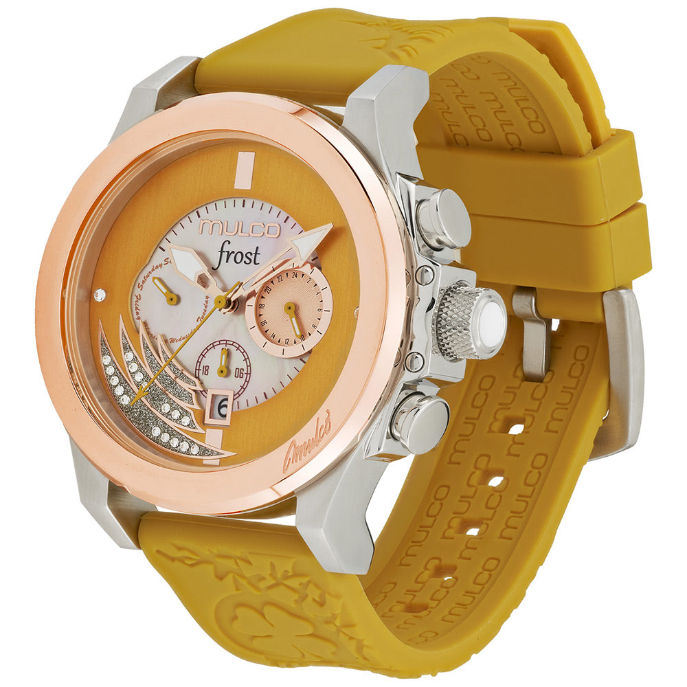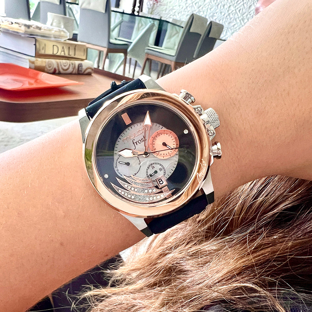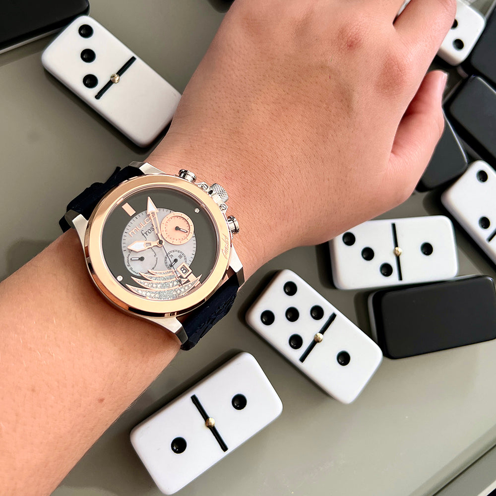 Mulco Frost Full Moon women's watch, with Swiss Chronograph Movement, mother-of-pearl and Swarovski stones, rose gold accents, and silicone band design.