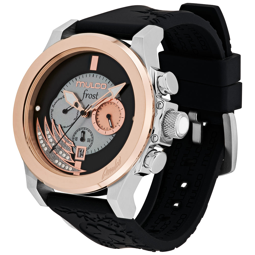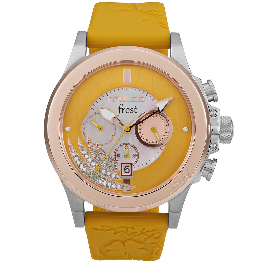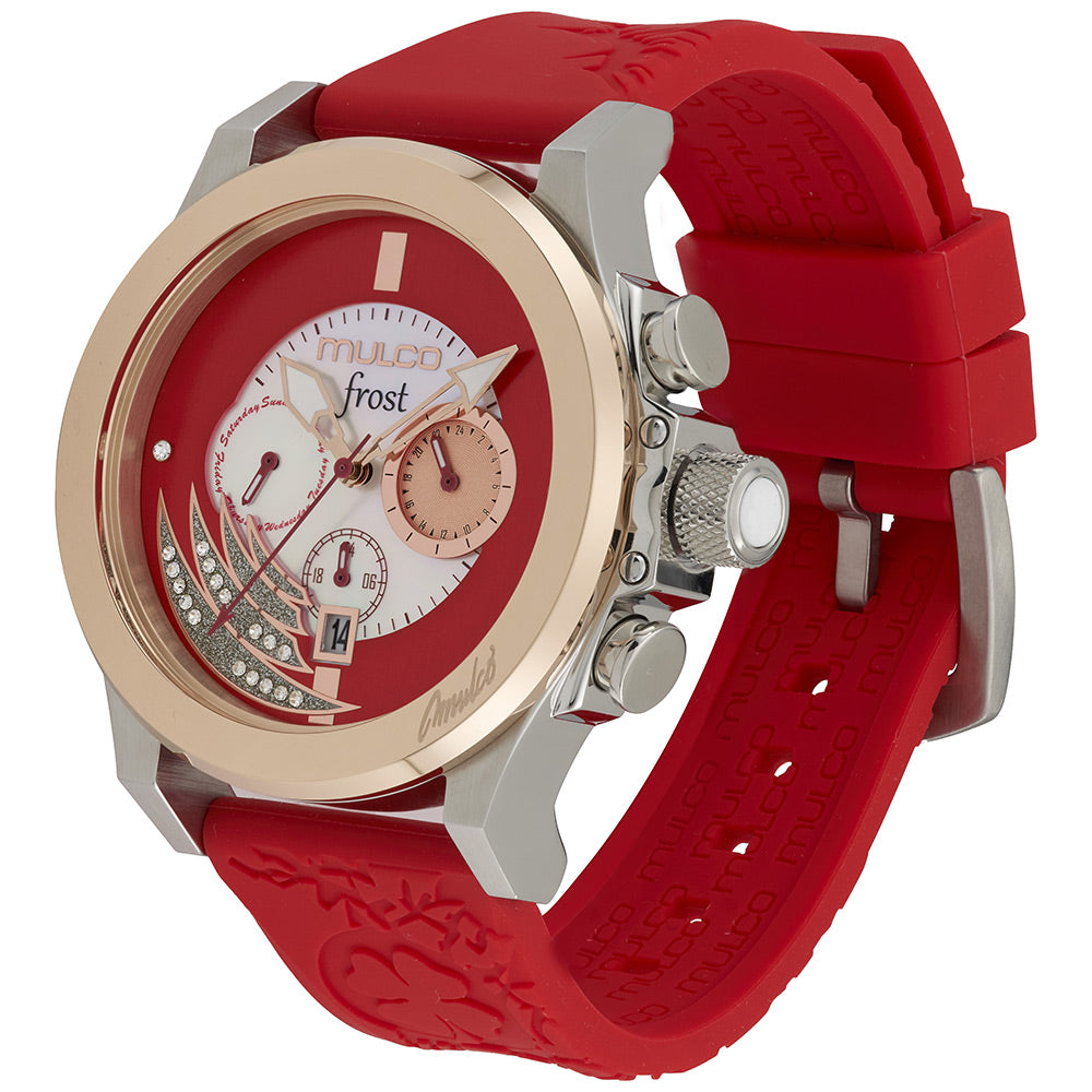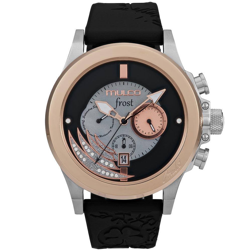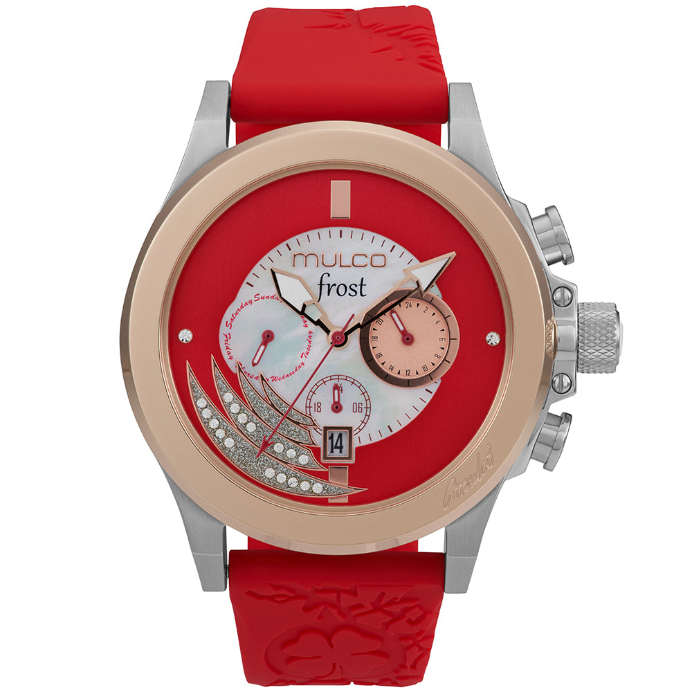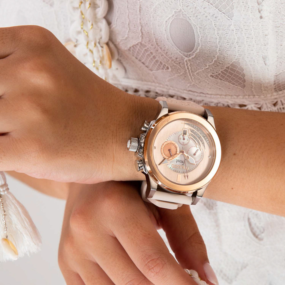 Mulco Frost Full Moon women's watch, with Swiss Chronograph Movement, mother-of-pearl and Swarovski stones, rose gold accents, and silicone band design.