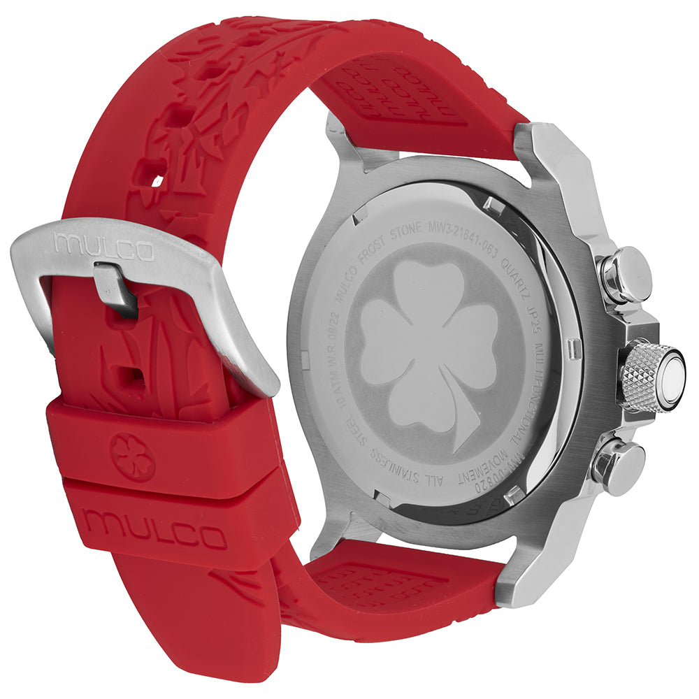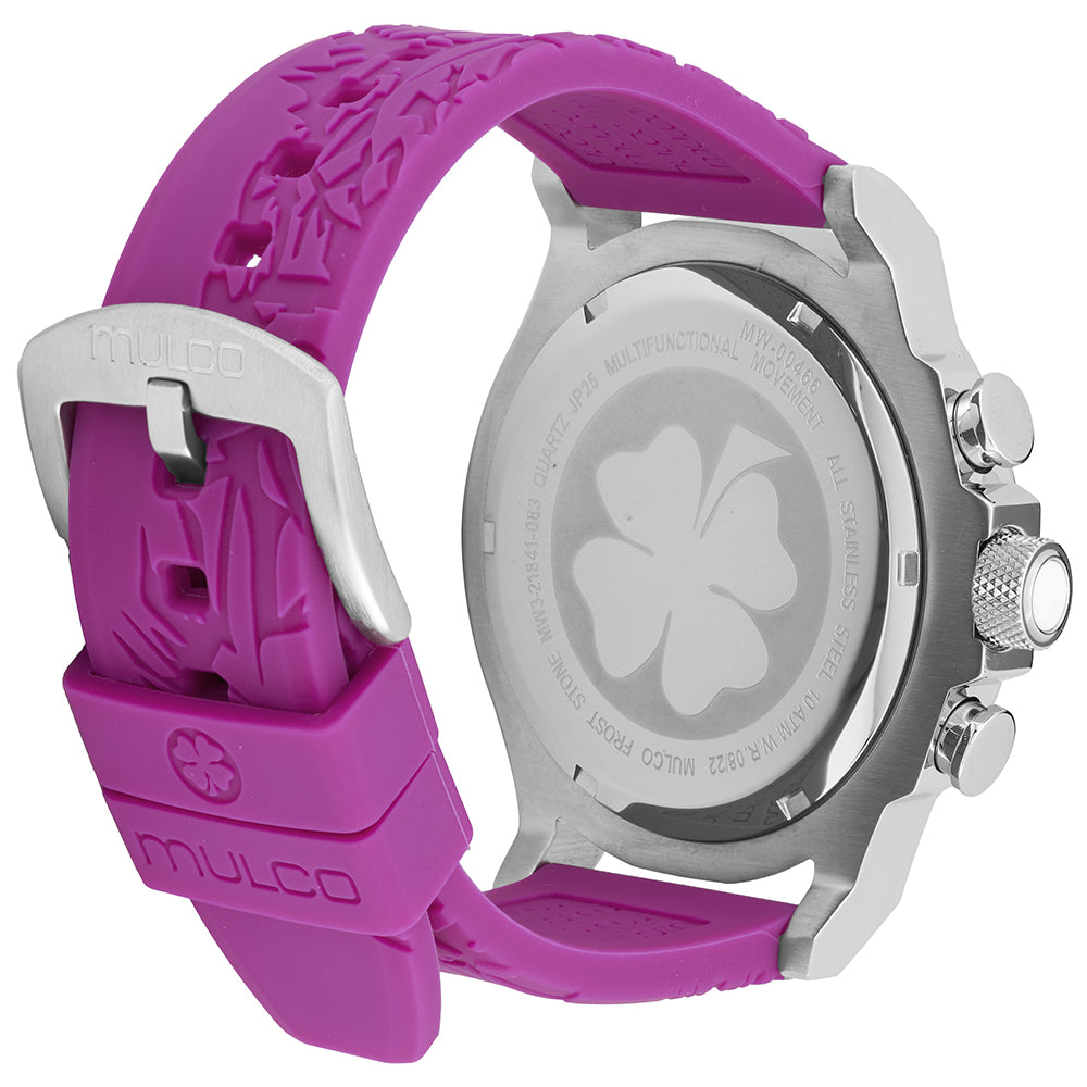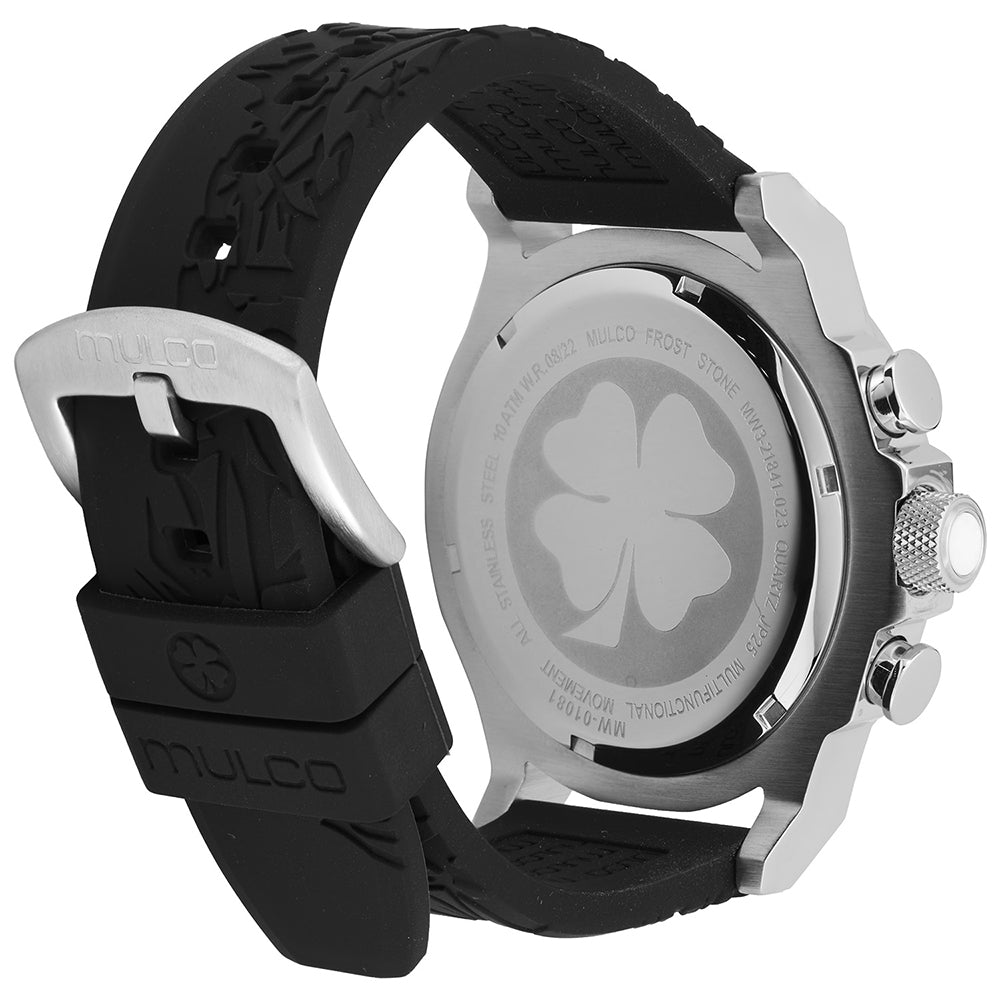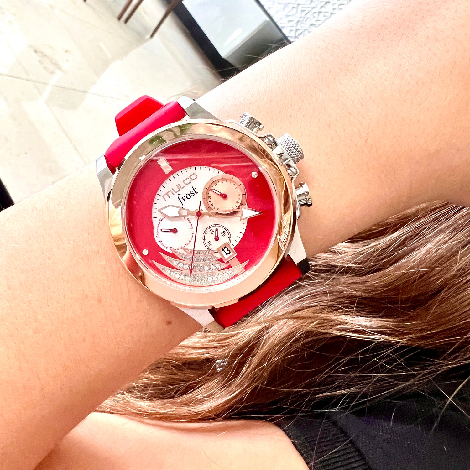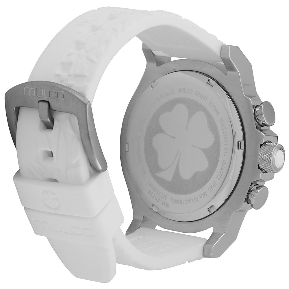 Mulco Frost Full Moon women's watch, with Swiss Chronograph Movement, mother-of-pearl and Swarovski stones, rose gold accents, and silicone band design.