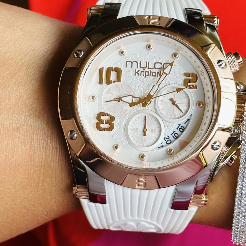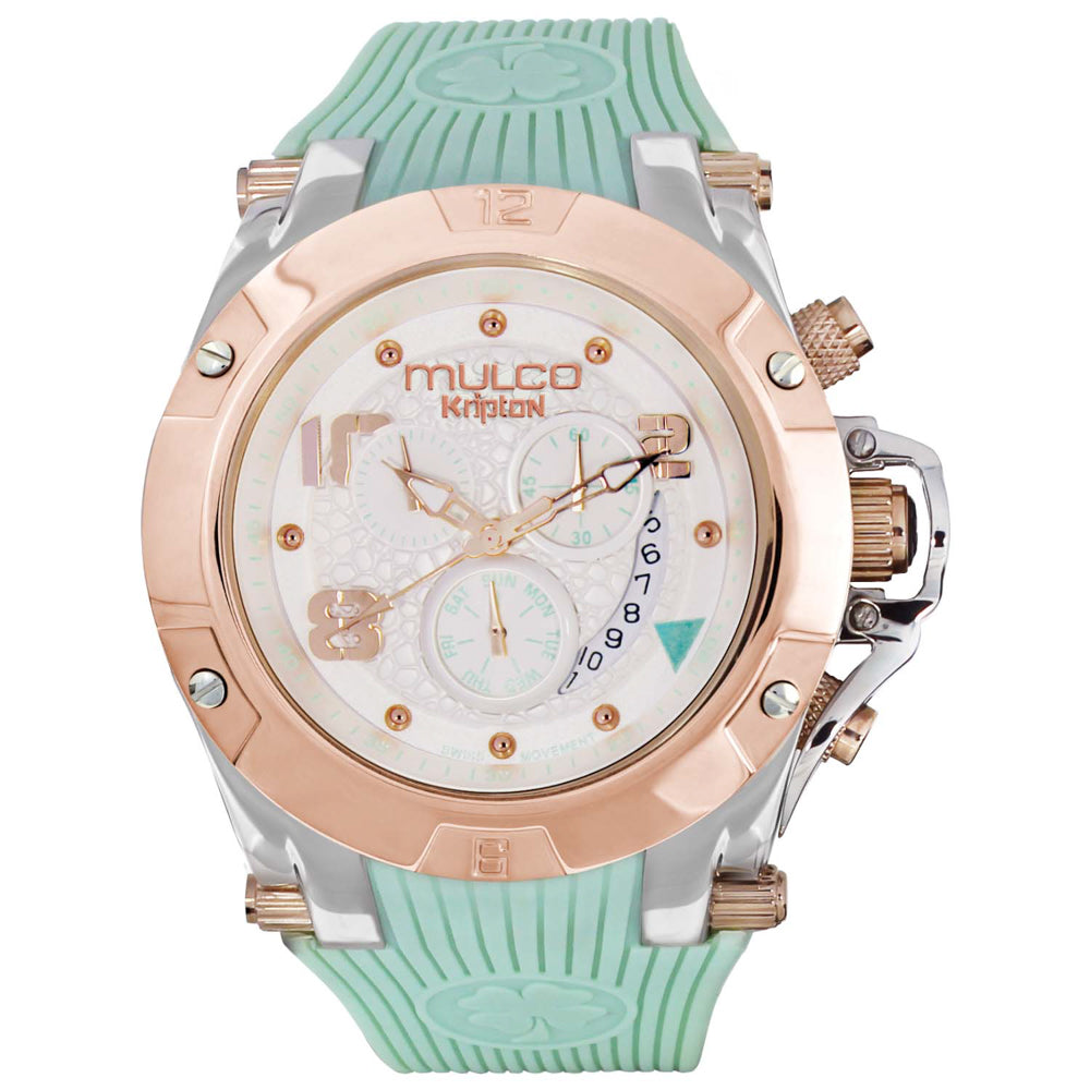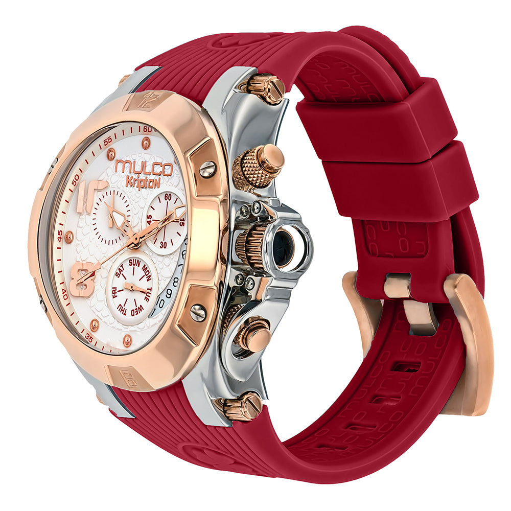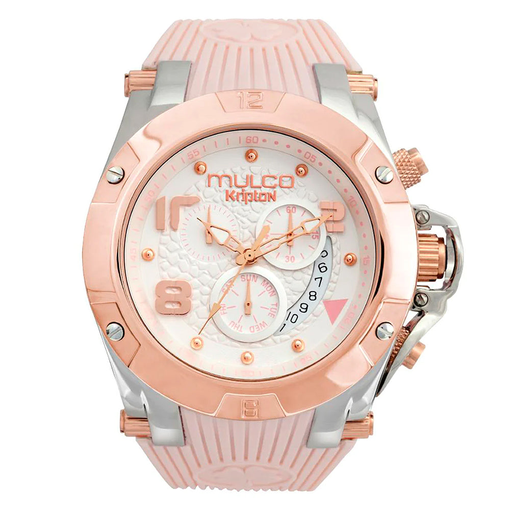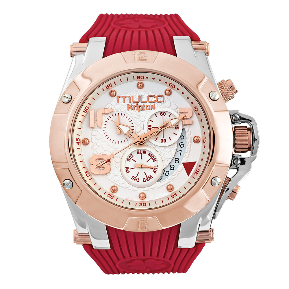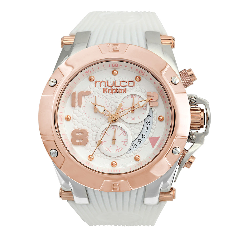 Unleash your inner superwoman with the Mulco Kripton Lady watch. Featuring a pearl finish sundial, rose gold accents, and ionized plating IP process, it is water-resistant and built to last. The silicone watchband is comfortable and perfect for daily wear.