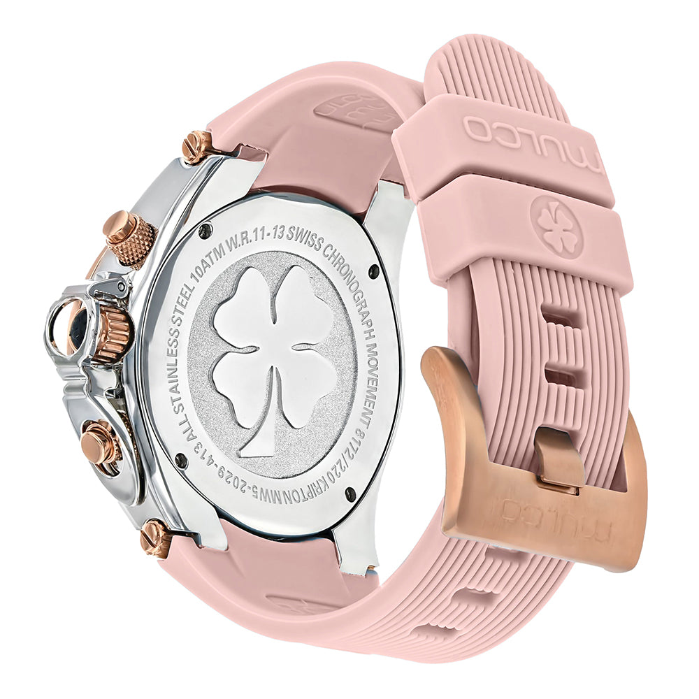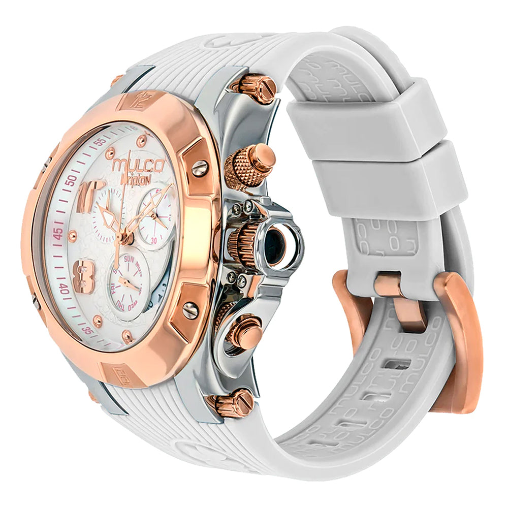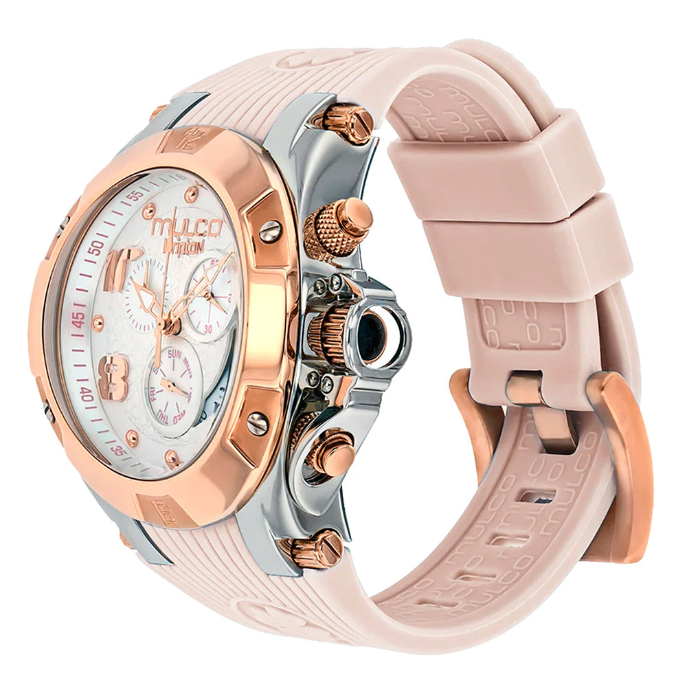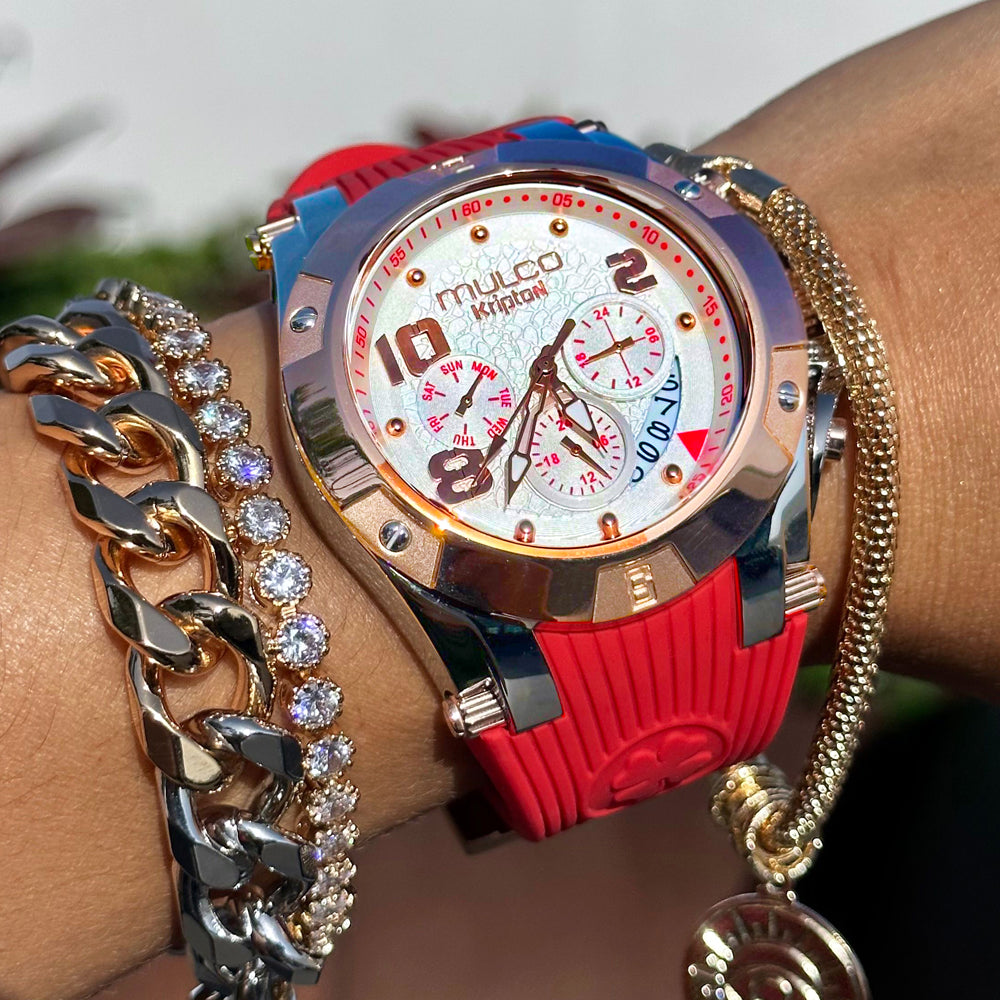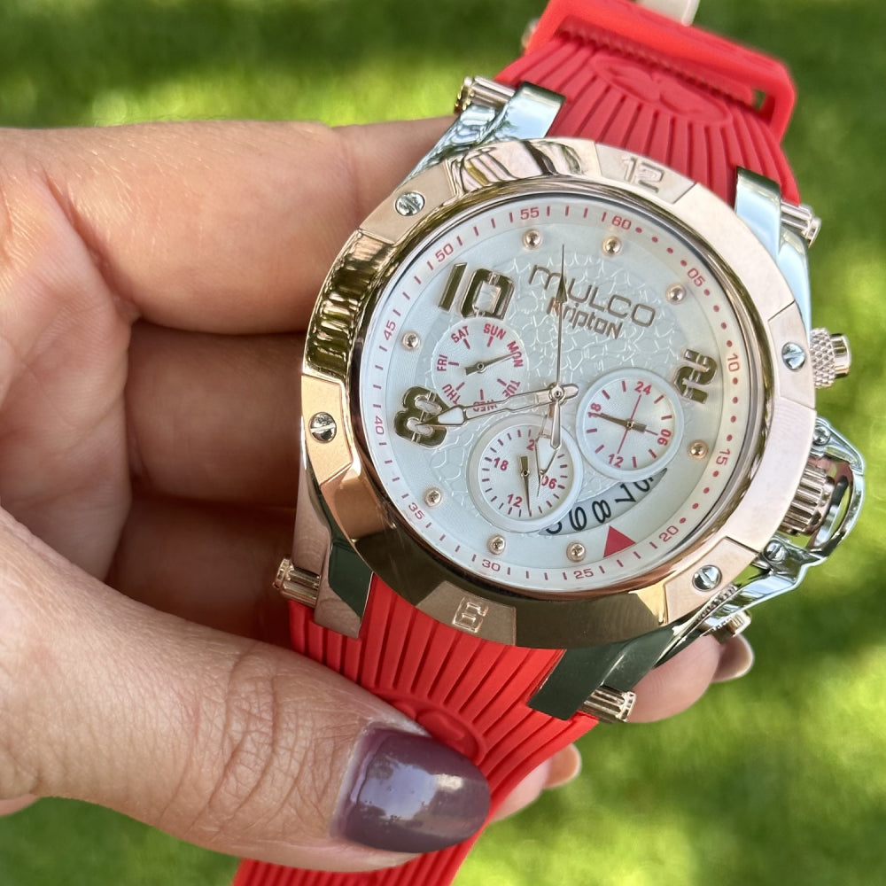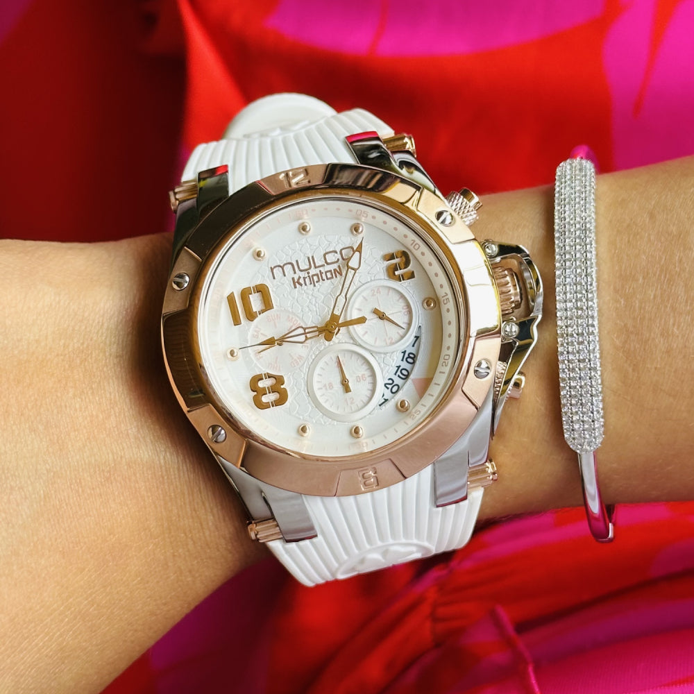 Unleash your inner superwoman with the Mulco Kripton Lady watch. Featuring a pearl finish sundial, rose gold accents, and ionized plating IP process, it is water-resistant and built to last. The silicone watchband is comfortable and perfect for daily wear.