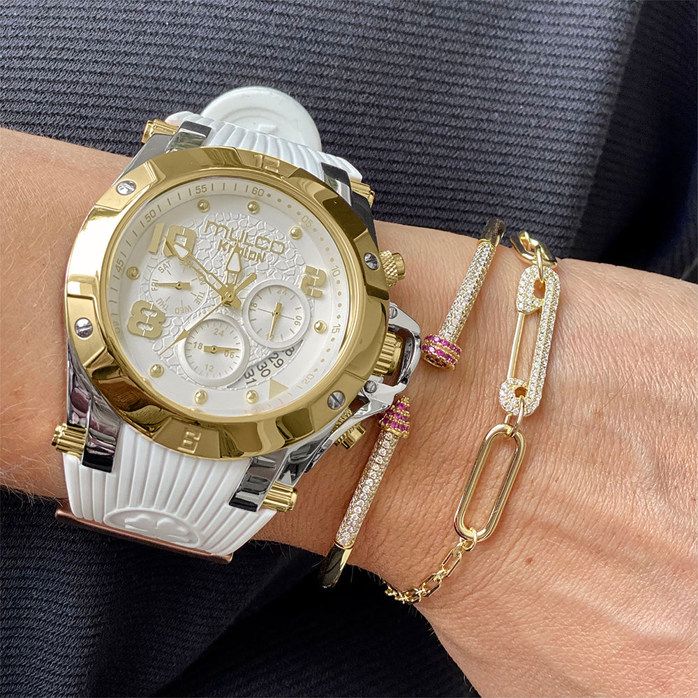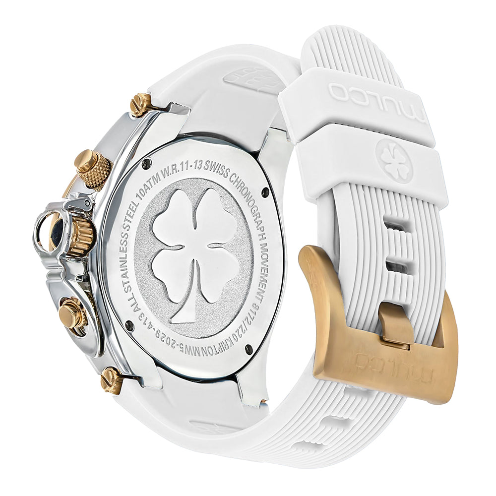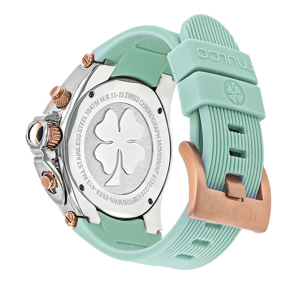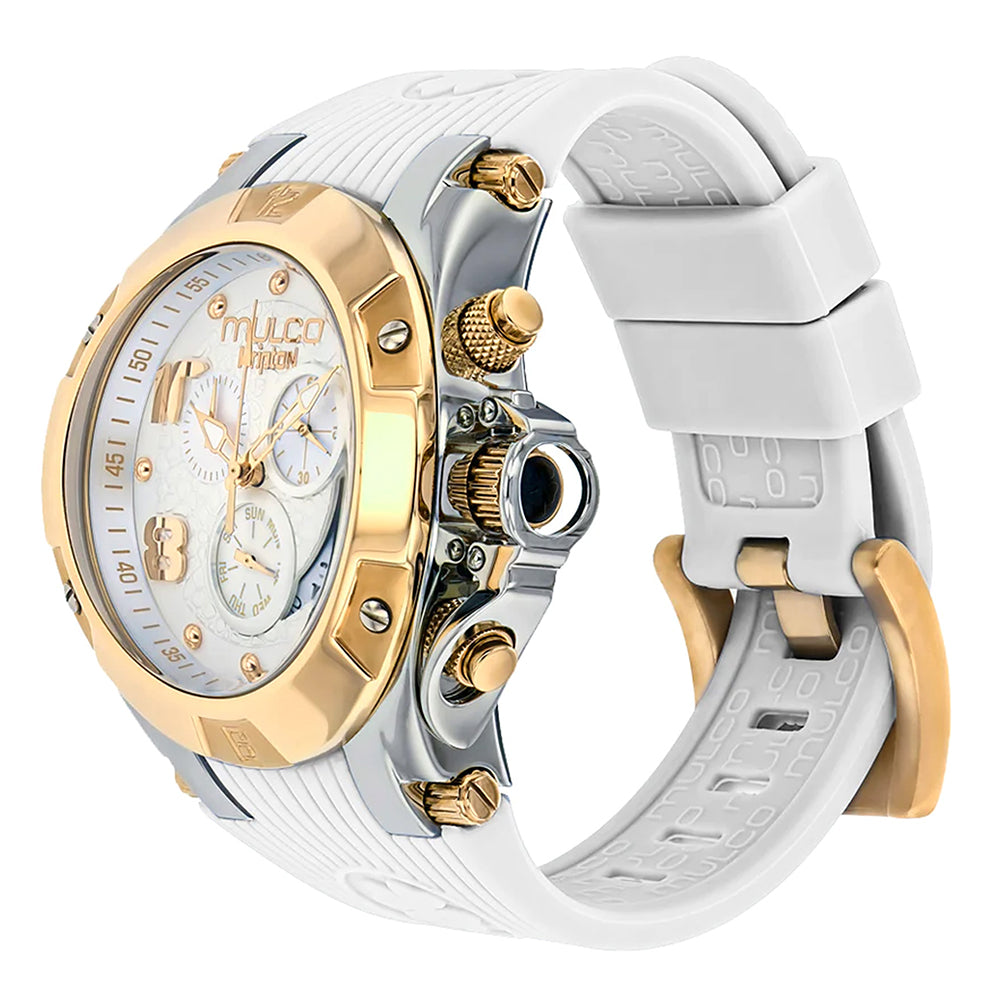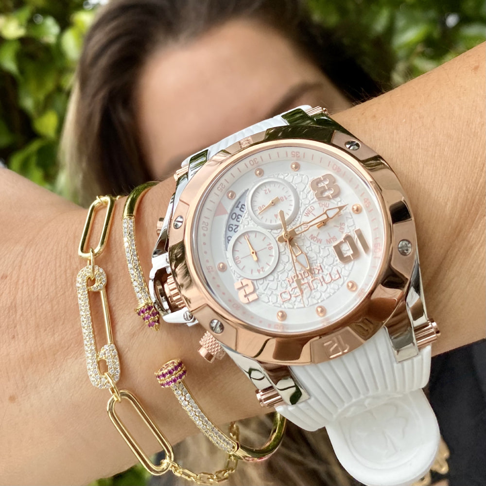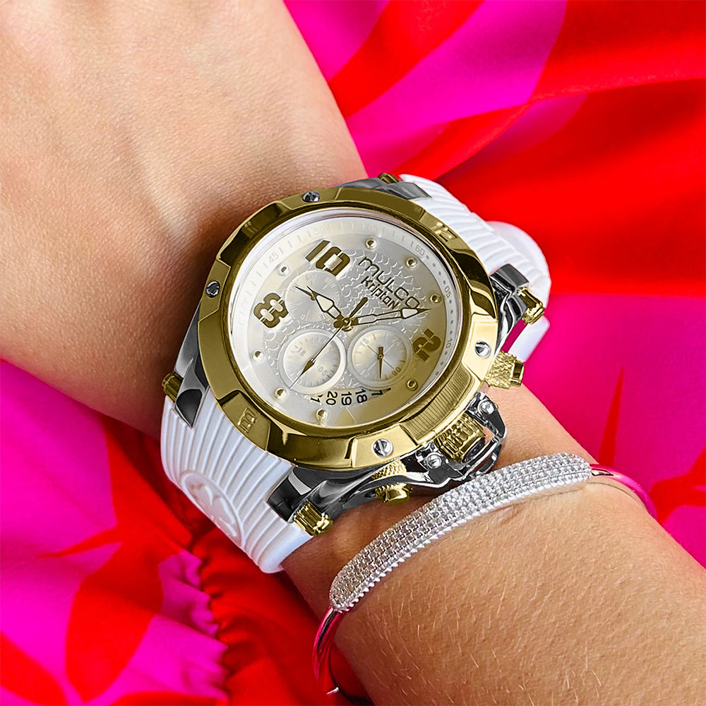 Unleash your inner superwoman with the Mulco Kripton Lady watch. Featuring a pearl finish sundial, rose gold accents, and ionized plating IP process, it is water-resistant and built to last. The silicone watchband is comfortable and perfect for daily wear.
