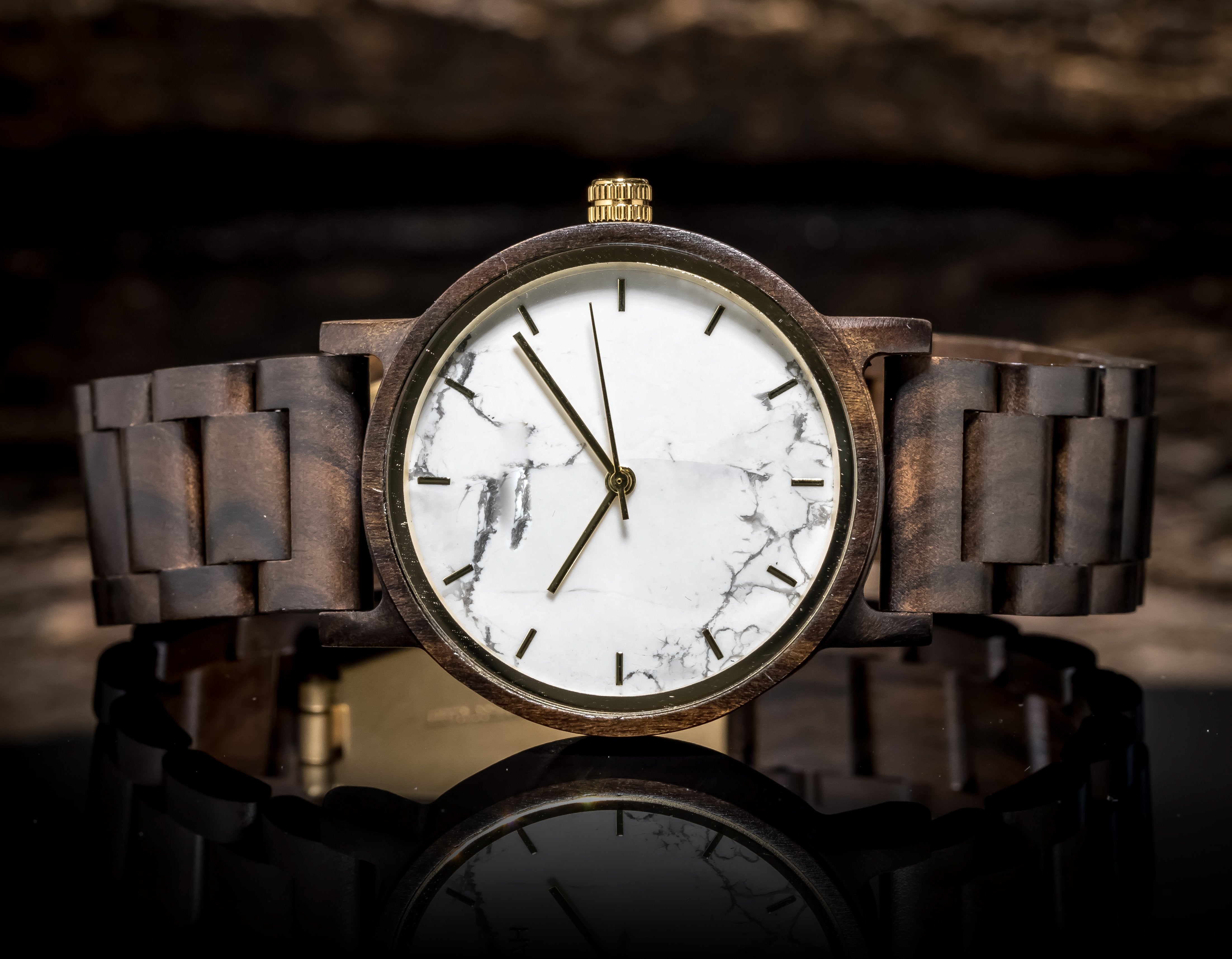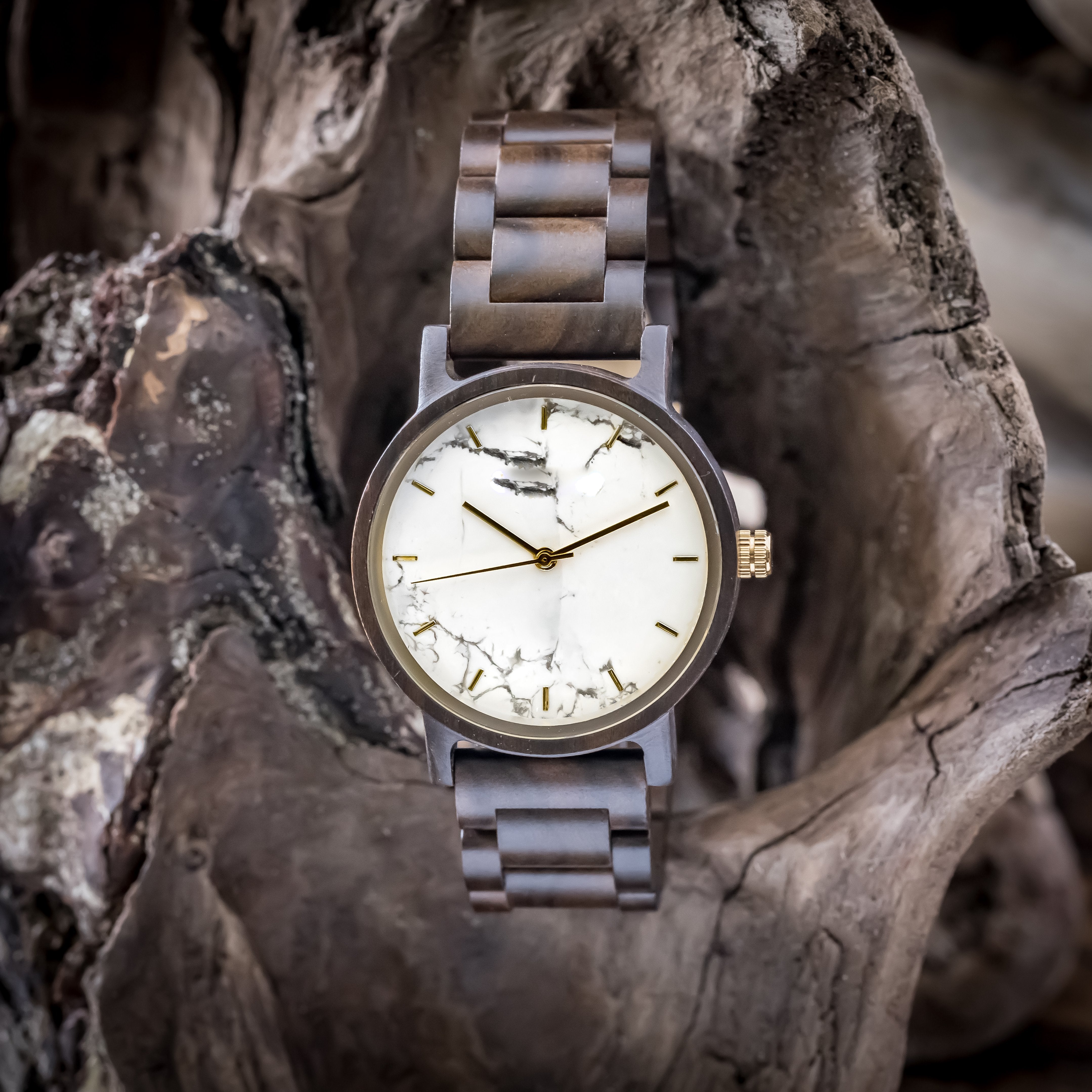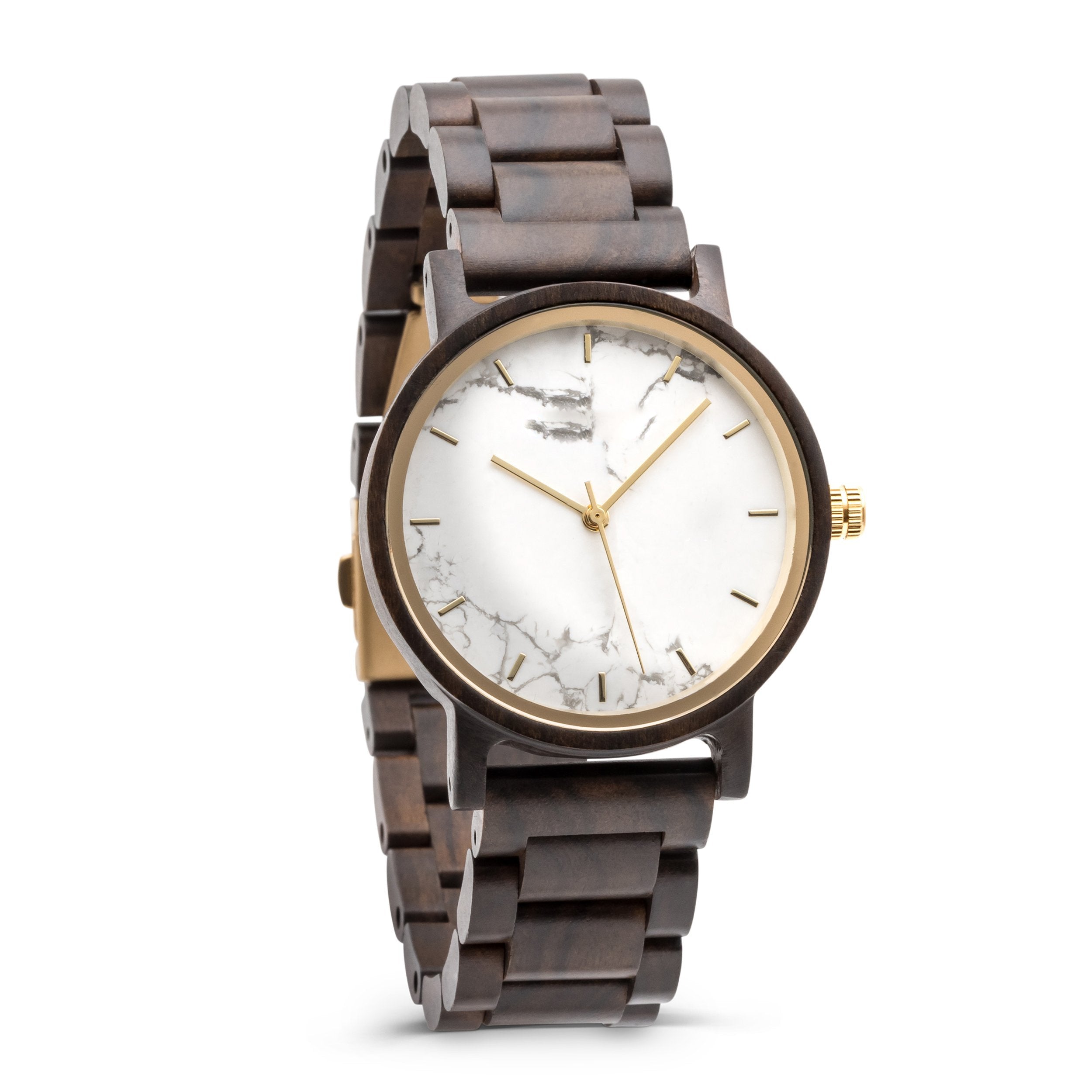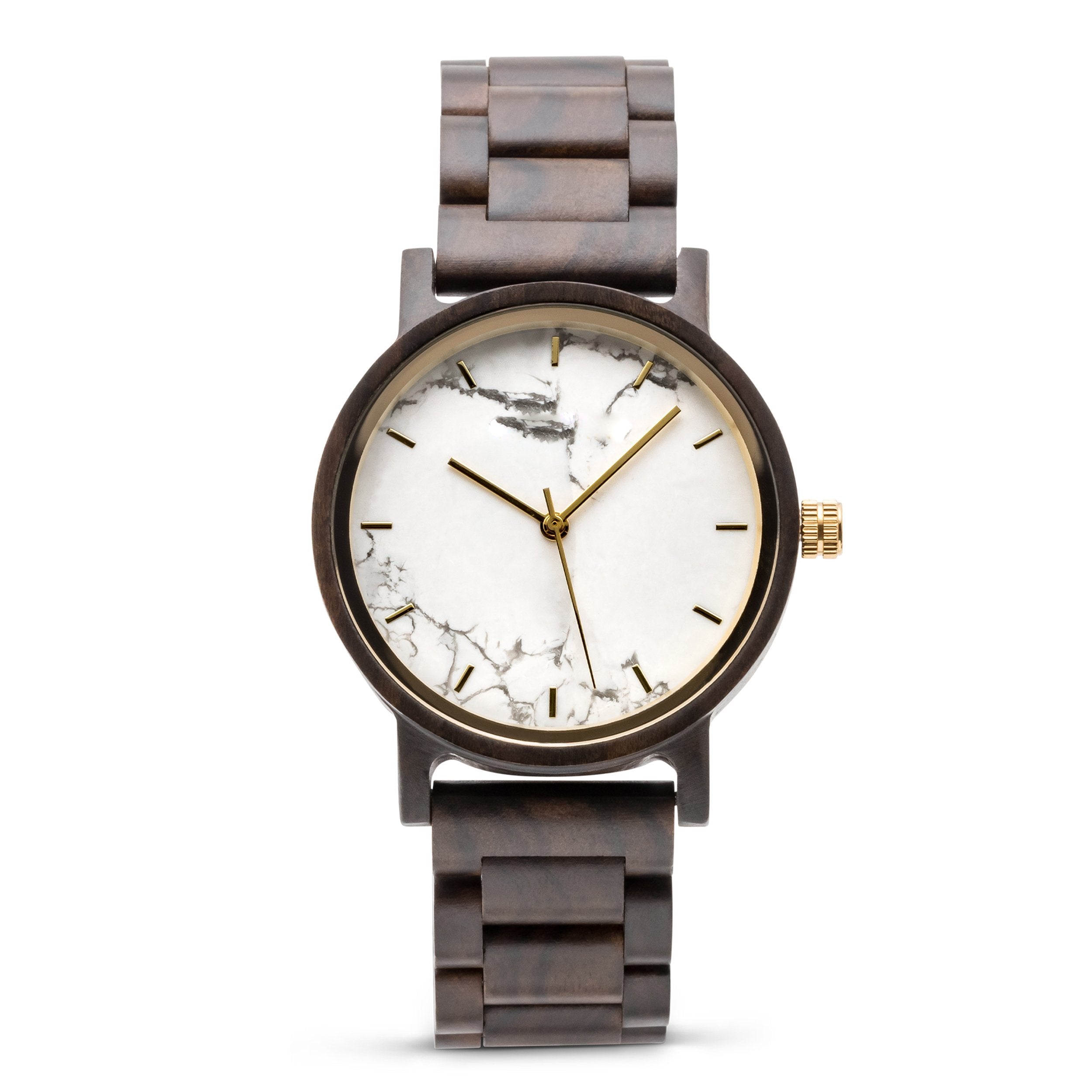 The Chiseled Ebony Sandalwood watch mixes natural wooden texture with a timeless white marble watch face. This impeccable design features a wooden watch case and matching wood link wristband made from genuine black sandalwood. Its style-forward design is matched by superior function: reliable quartz movement and gold notch dial markers are built for elite performance. Add custom engraving to your Chiseled watch to create the perfect gift for any occasion. For added impact, upload a photo of your handwritten message to make your gift truly unique.