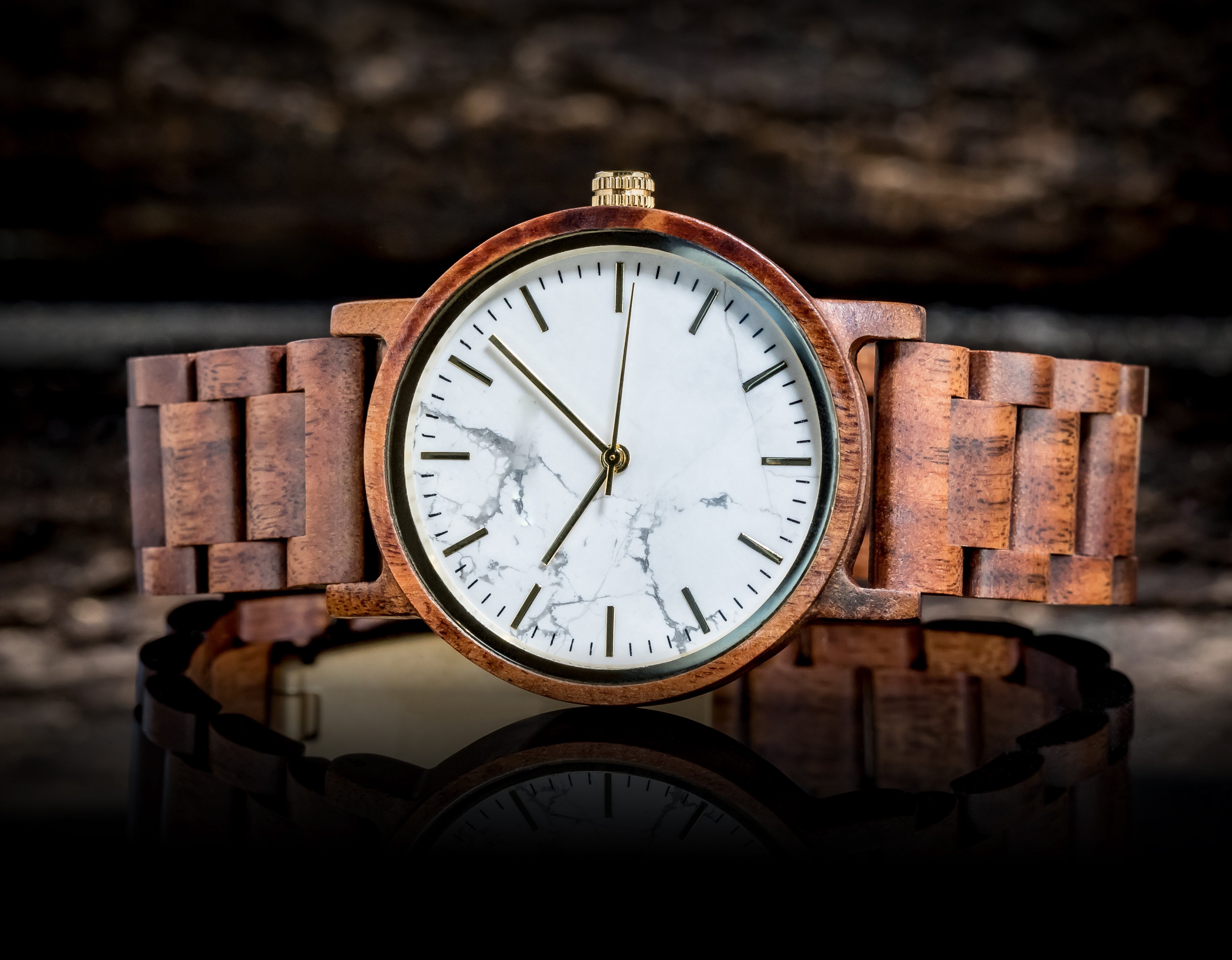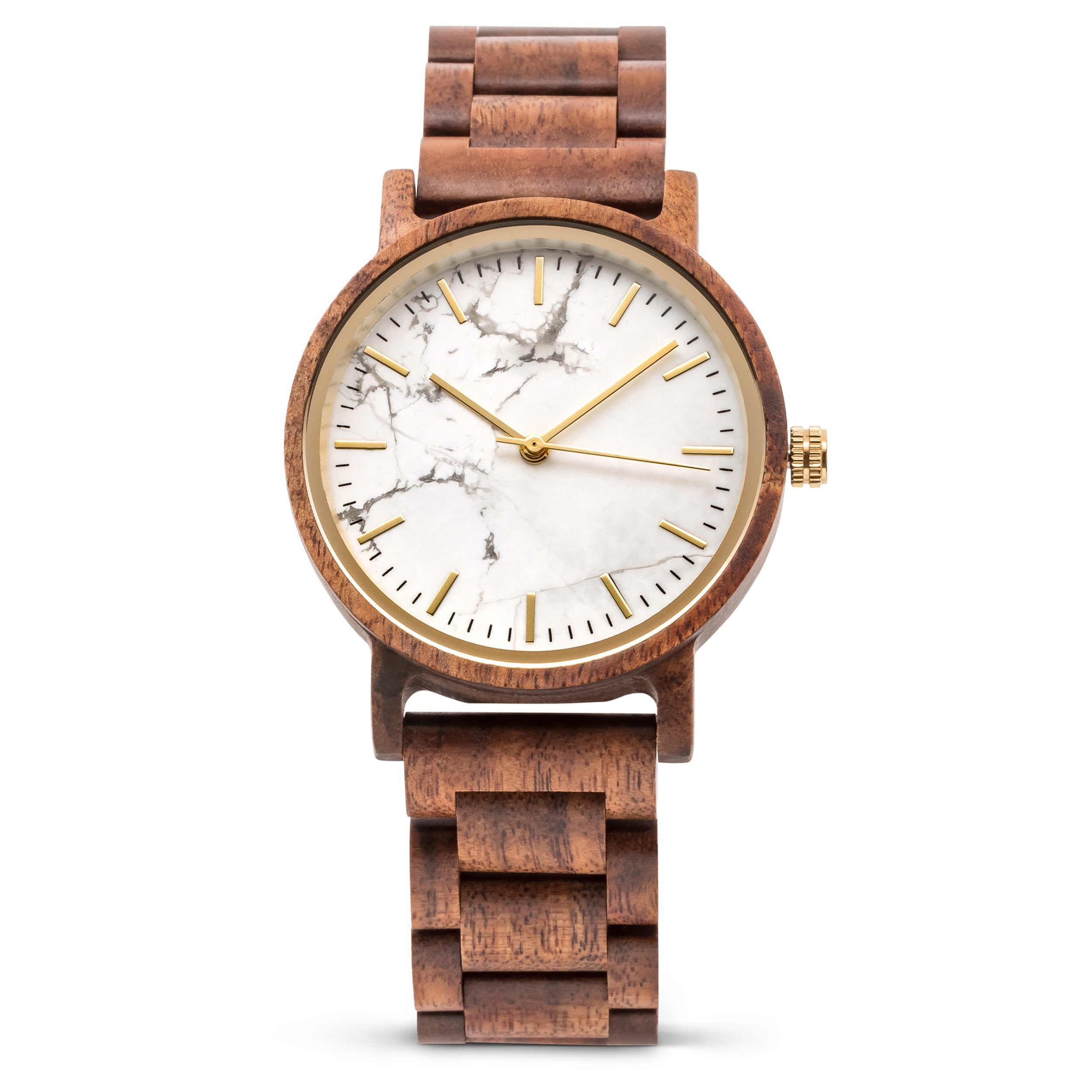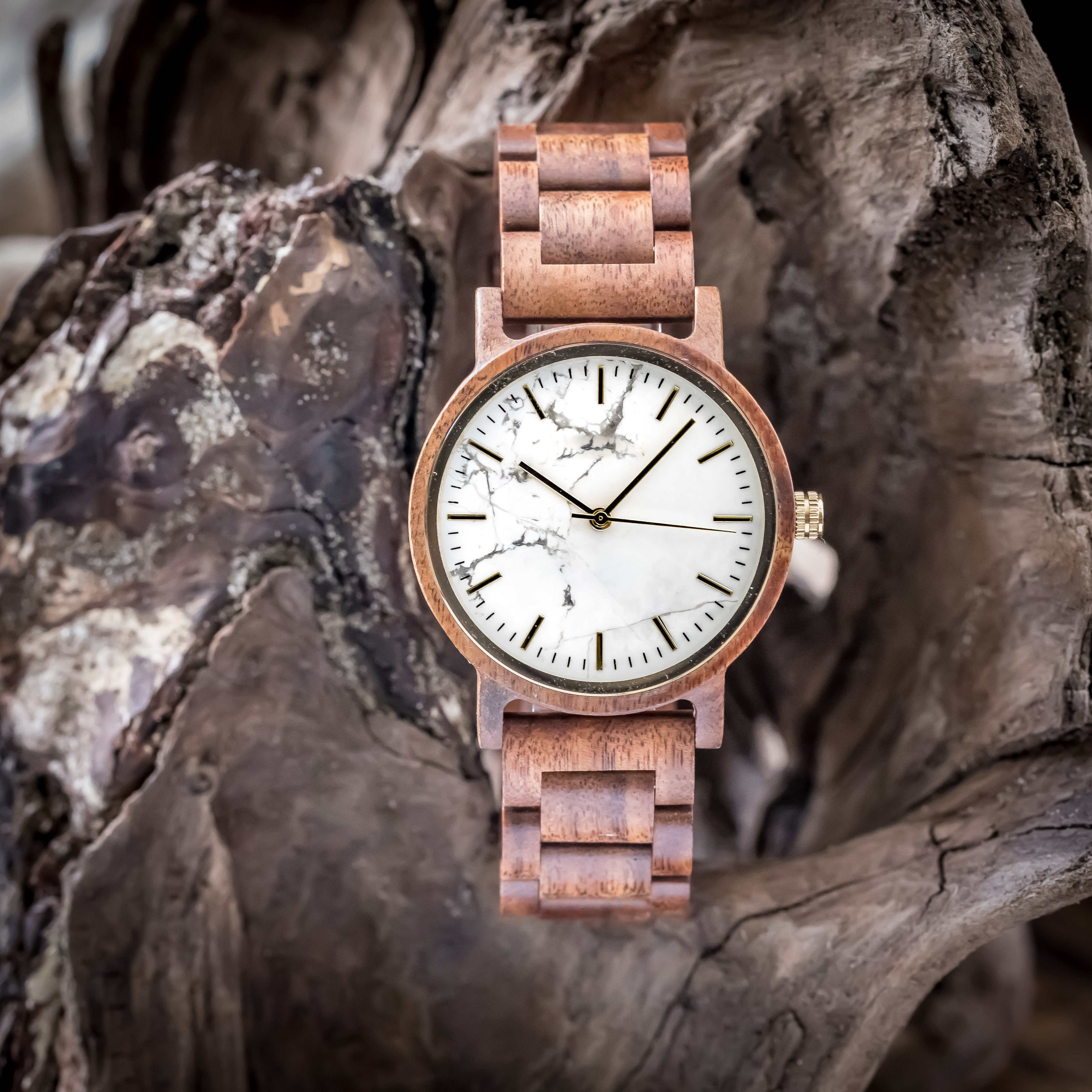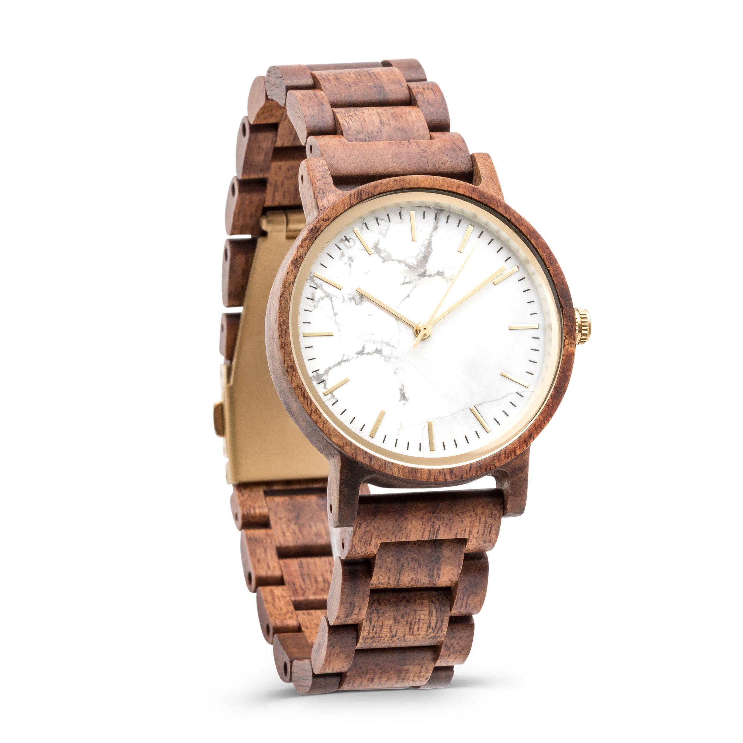 The Chiseled Koa watch mixes natural wooden texture with a timeless white marble watch face. This impeccable design features a wooden watch case and matching wood link wristband made from genuine Koa wood. Its style-forward design is matched by superior function: reliable quartz movement and gold notch dial markers are built for elite performance. Add custom engraving to your Chiseled watch to create the perfect gift for any occasion. For added impact, upload a photo of your handwritten message to make your gift truly unique.