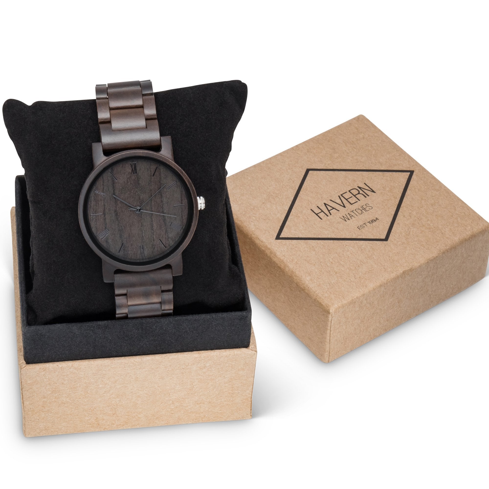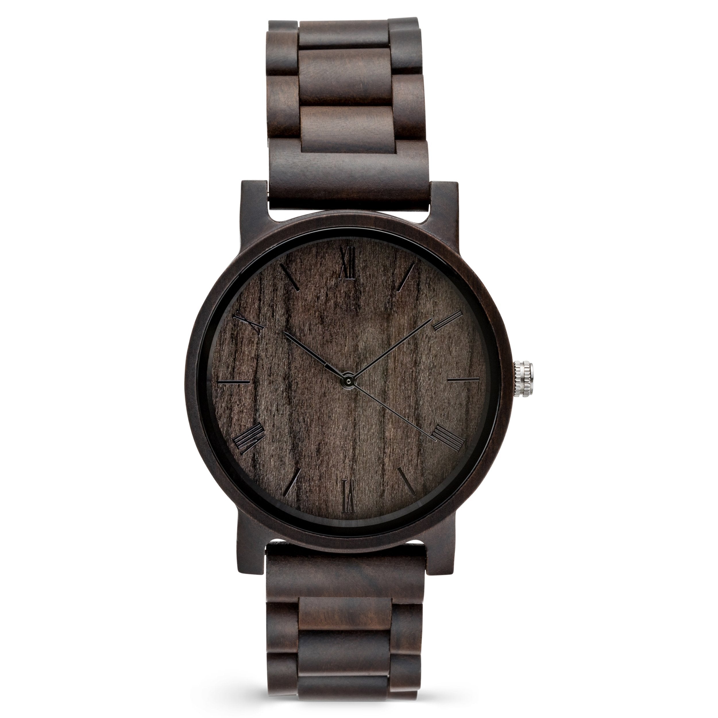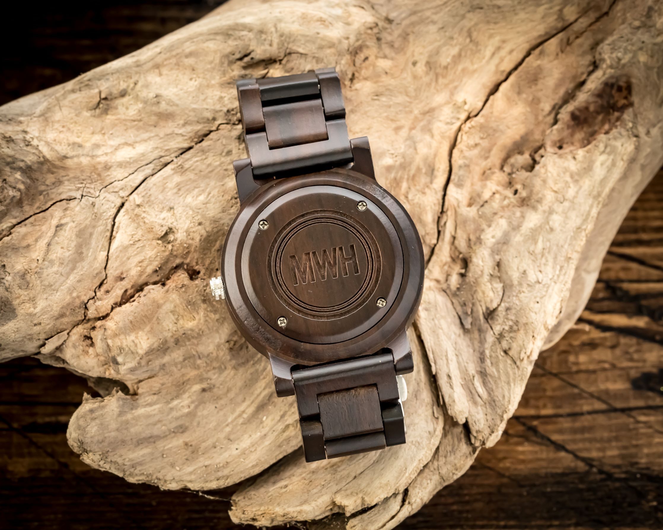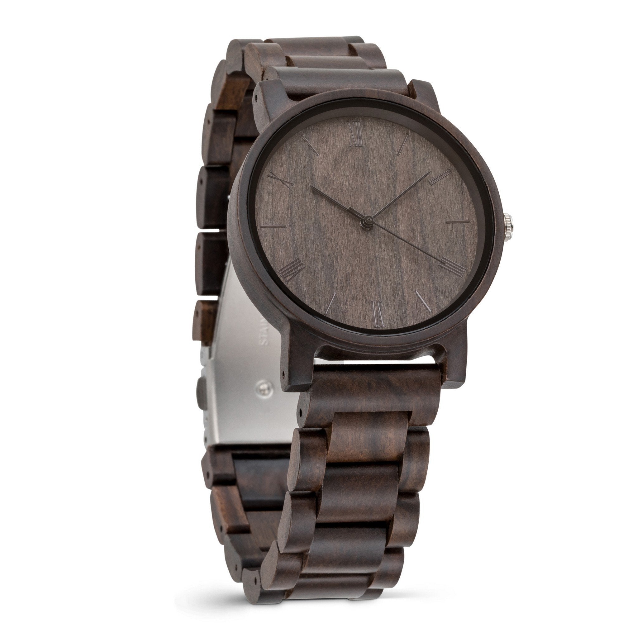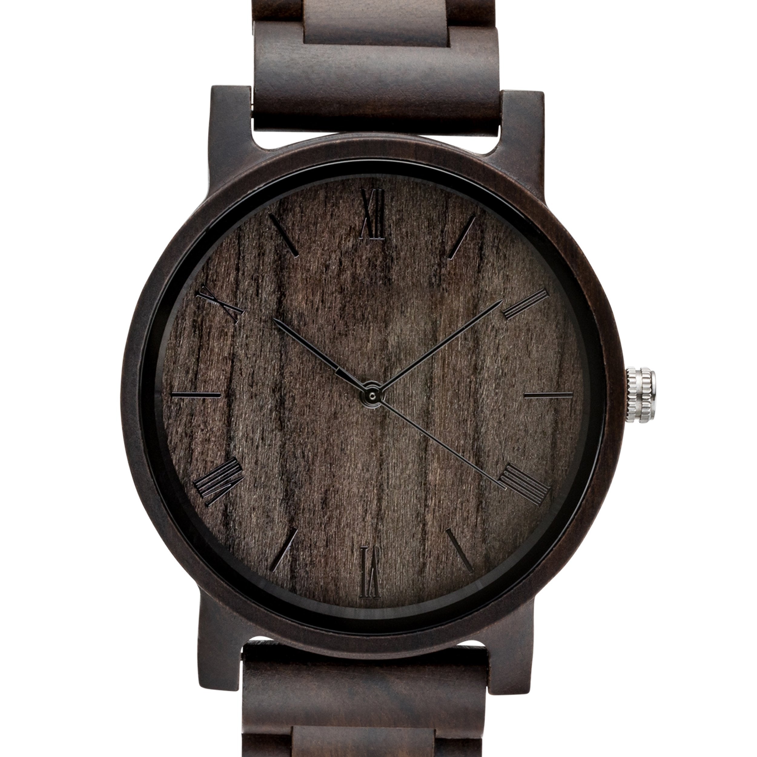 The Curtis Ebony wooden watch fuses classic timepiece style with natural tones and textures. This elemental monotone design features a wooden watch case and matching wood link wristband made from genuine black sandalwood. Its style-forward design is matched by superior function: reliable quartz movement and roman numeral dial markers are built for elite performance. Add custom engraving to your Curtis watch to create the perfect gift for any occasion. For added impact, upload a photo of your handwritten message to make your gift truly unique.