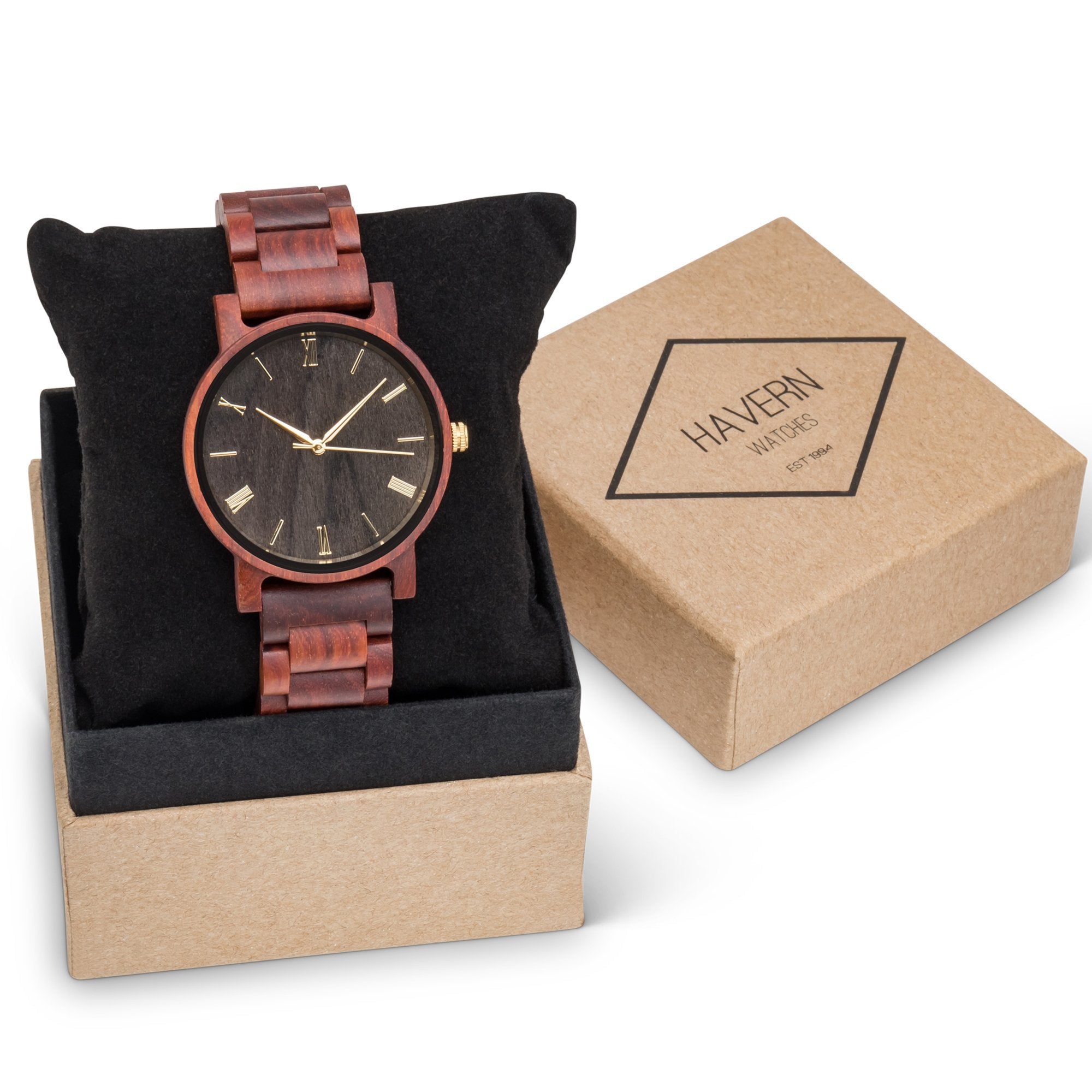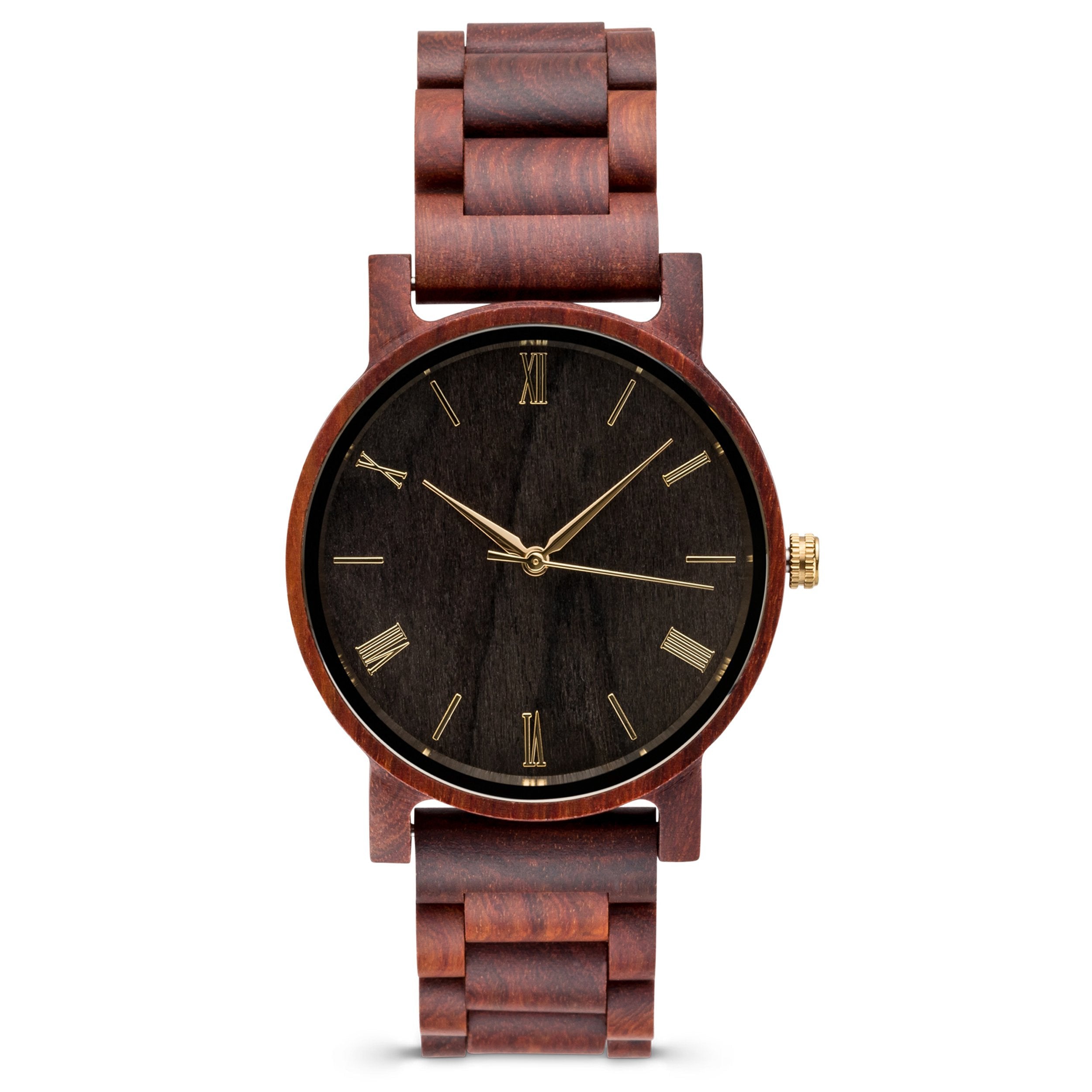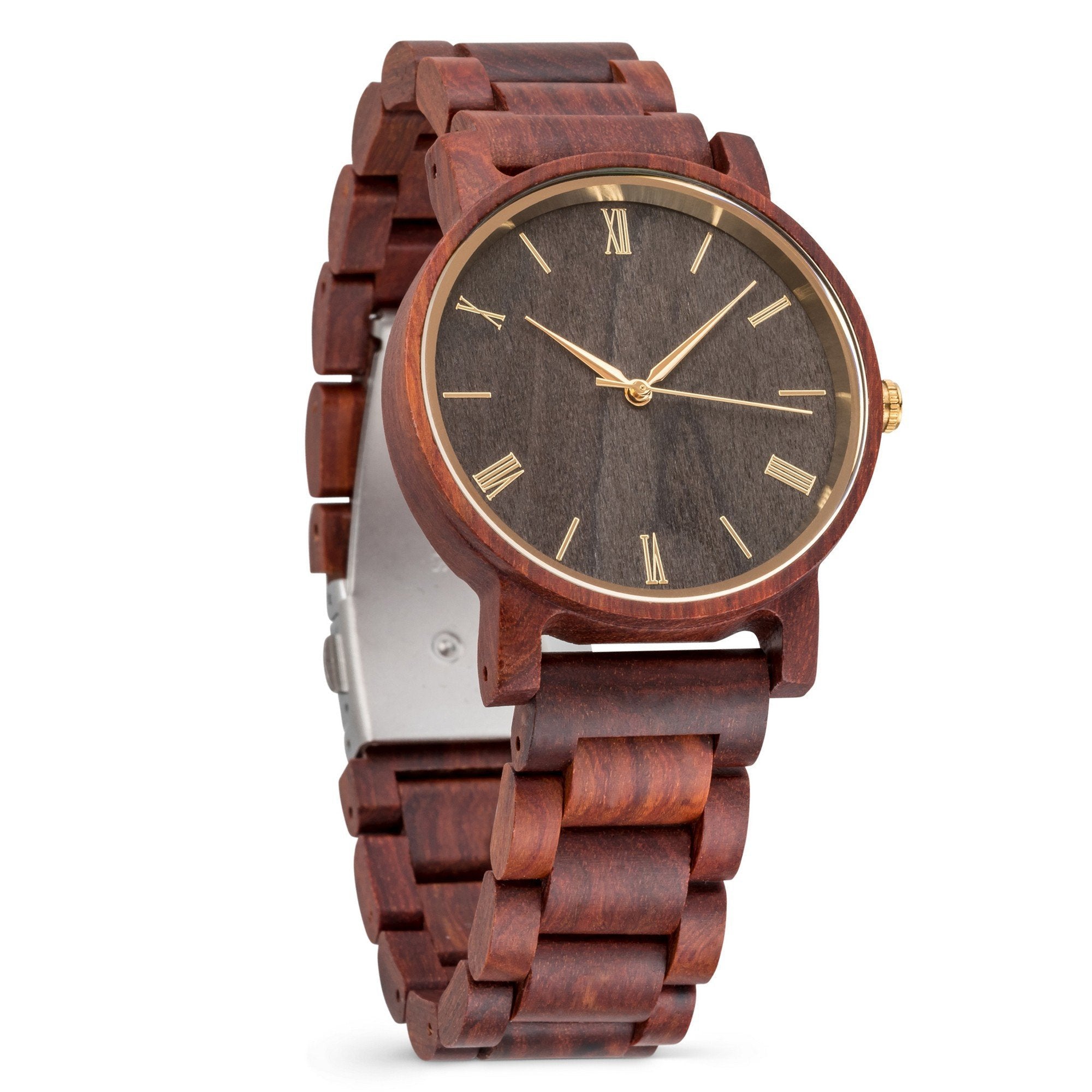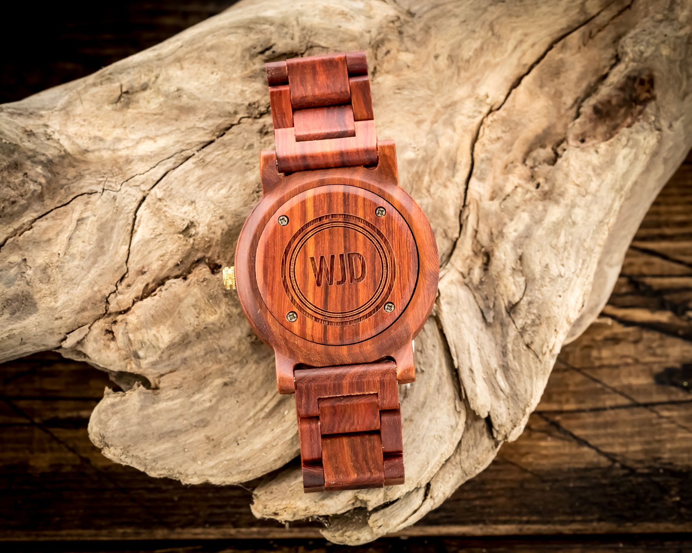 The Curtis Sandalwood watch fuses classic timepiece style with elevated design details. This impeccable design features a wooden watch case and matching wood link wristband made from genuine red sandalwood. Its style-forward design is matched by superior function: reliable quartz movement and gold roman numeral dial markers are built for elite performance. Add custom engraving to your Curtis watch to create the perfect gift for any occasion. For added impact, upload a photo of your handwritten message to make your gift truly unique.