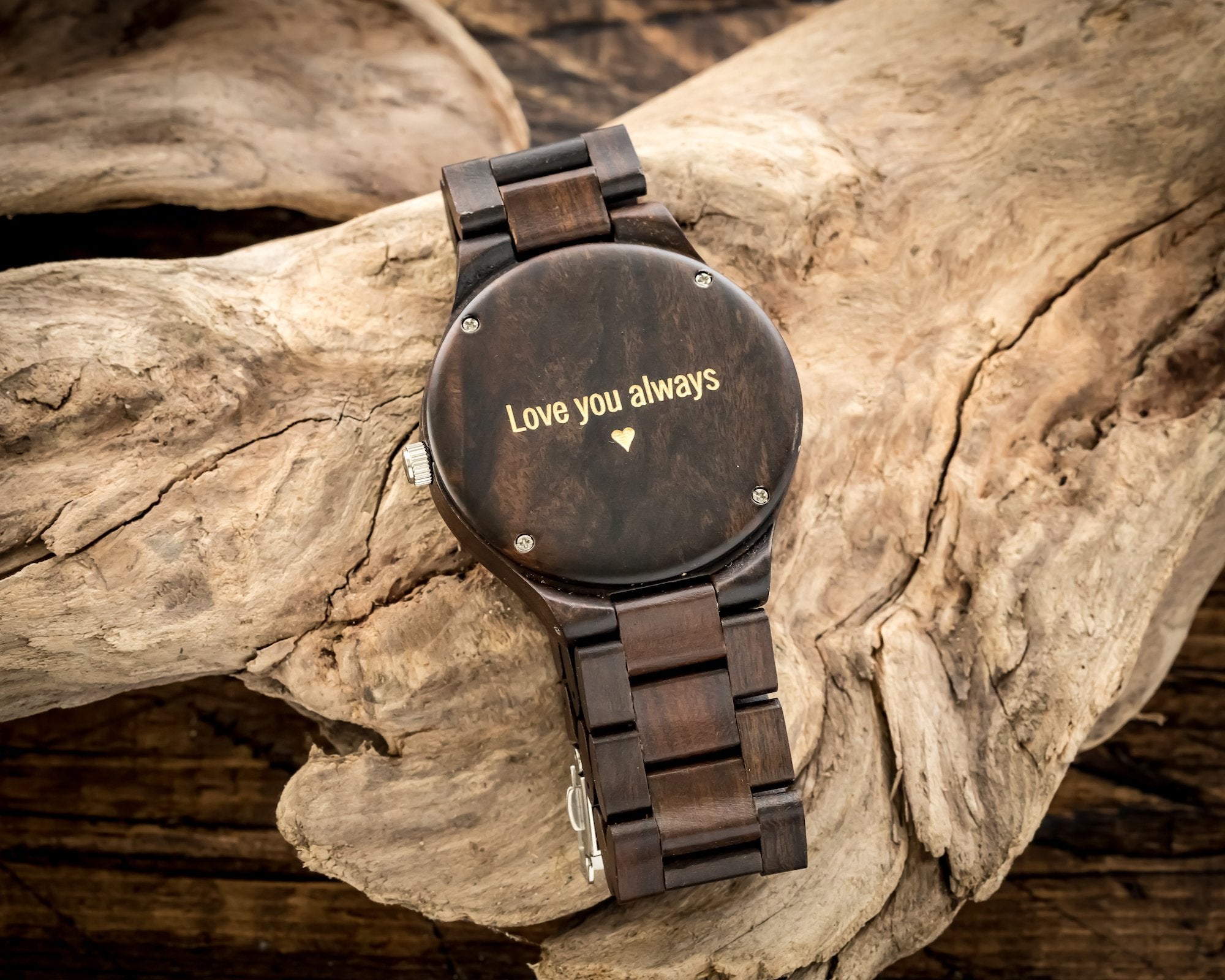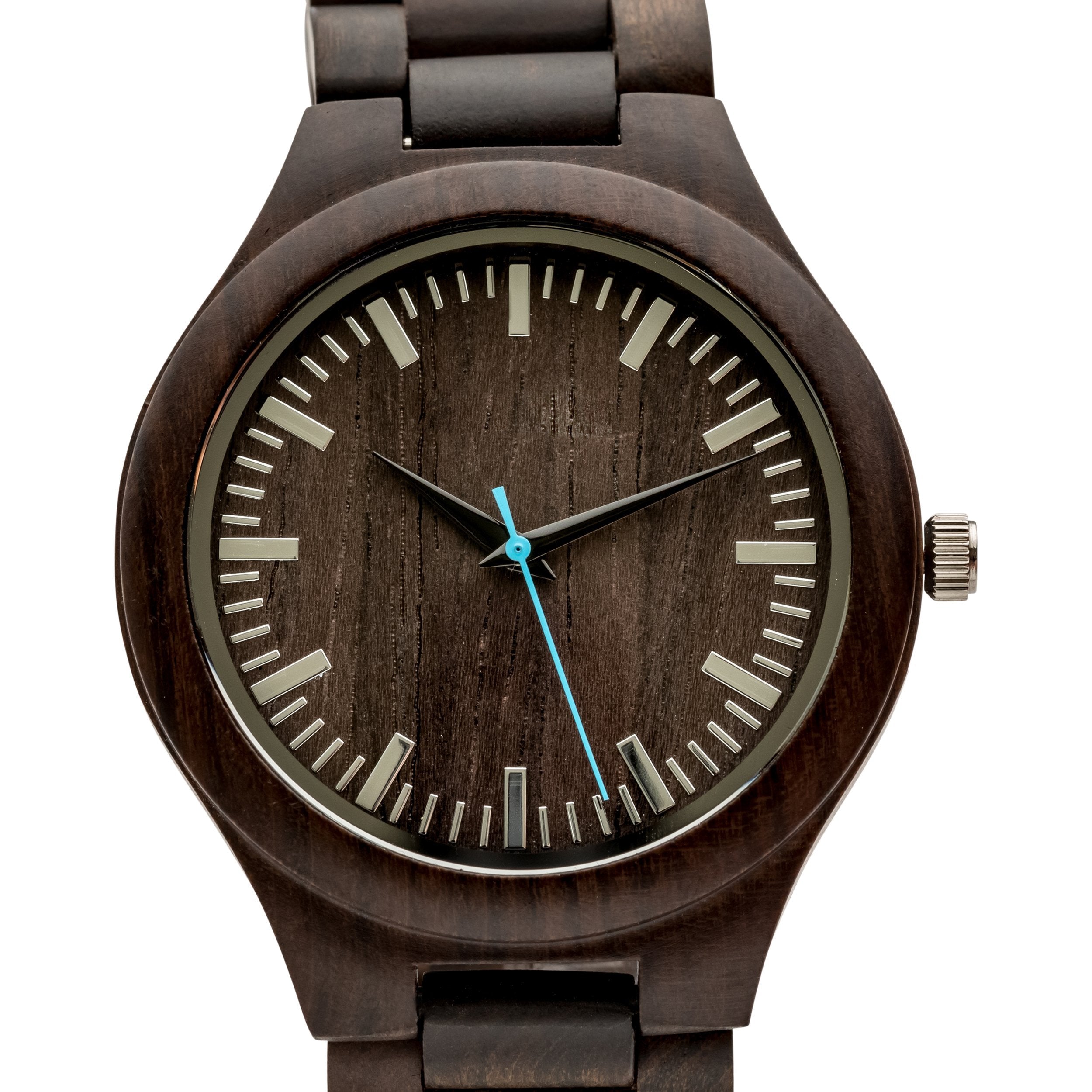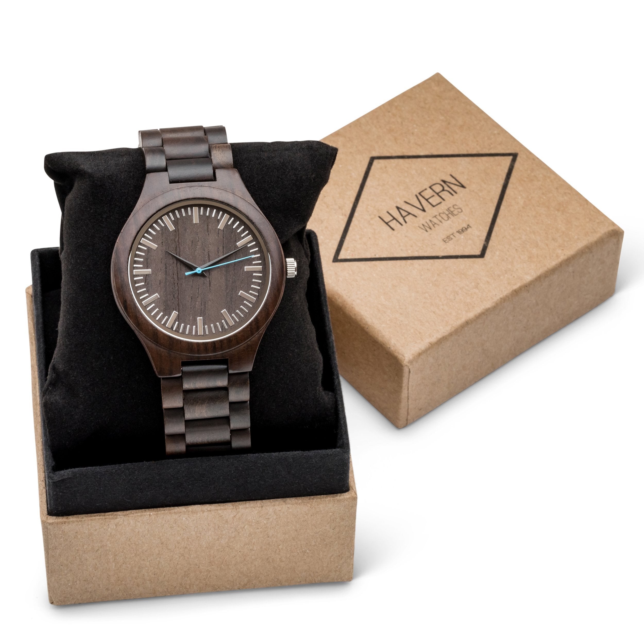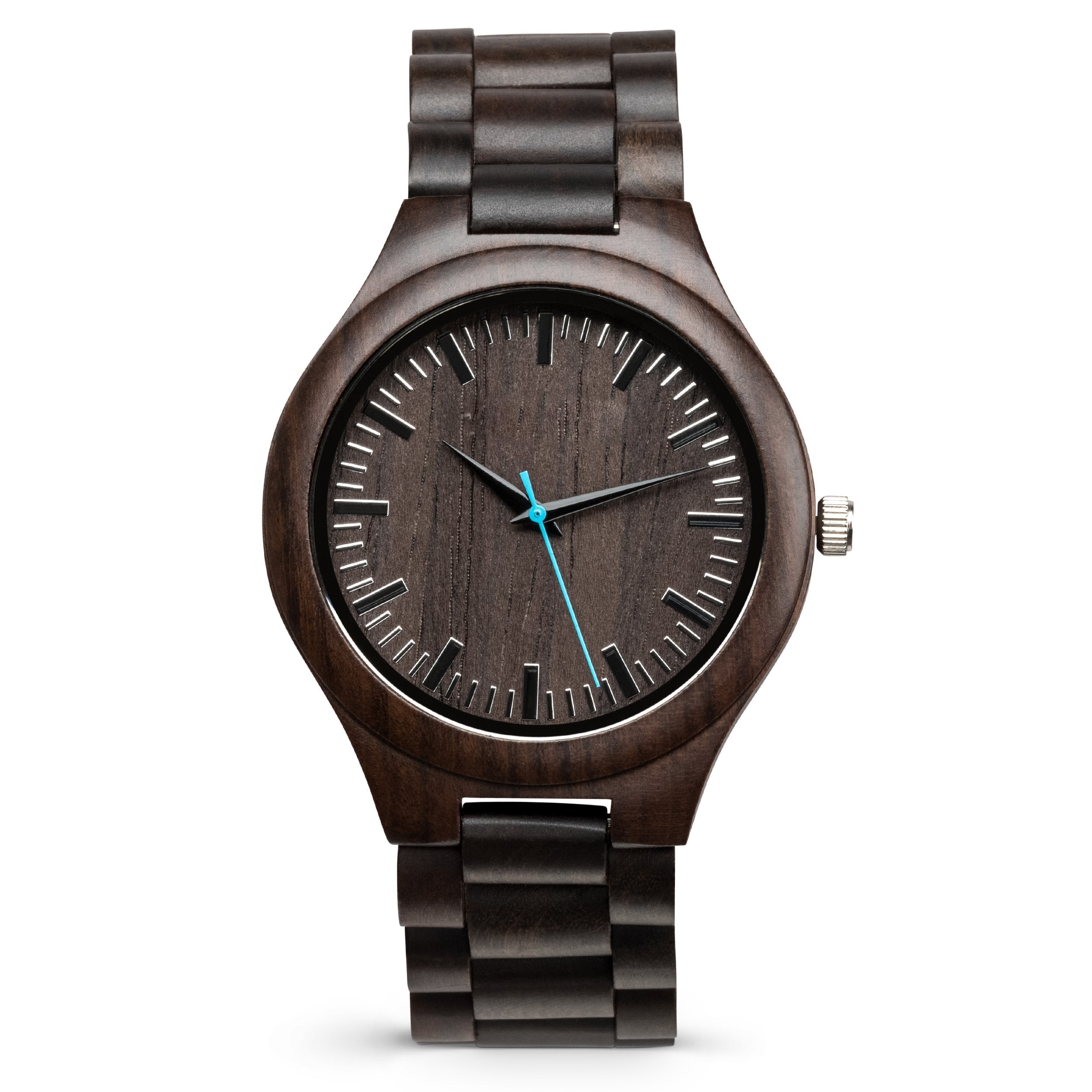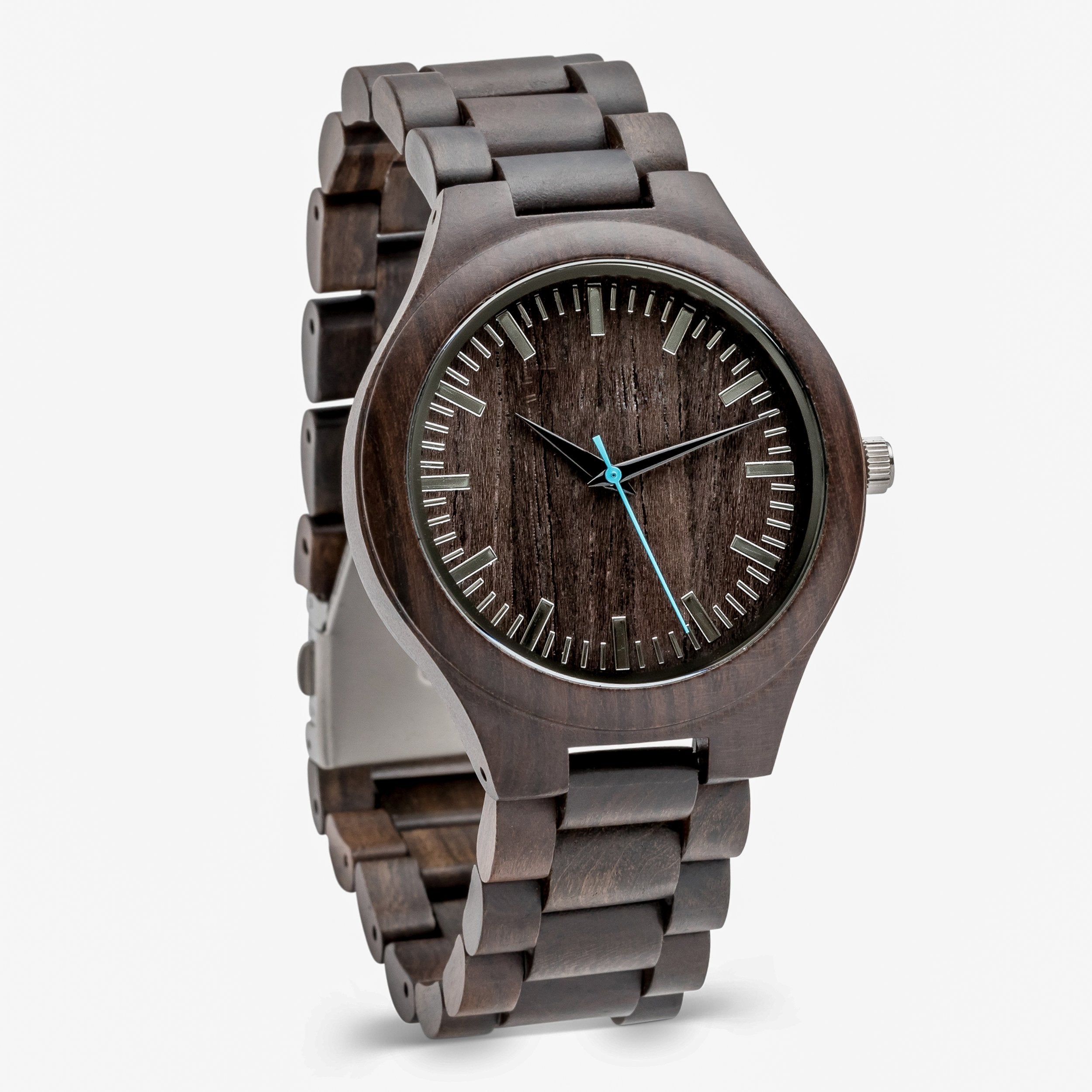 The Douglas Ebony wooden watch adds a modern twist to this timeless design. Perfect for everyday wear, this watch features a wooden watch case and matching wood link wristband made from genuine black sandalwood. Its style-forward design is matched by superior function: reliable quartz movement and numerical dial markers are built for elite performance. Add custom engraving to your Douglas watch to create the perfect gift for any occasion. For added impact, upload a photo of your handwritten message to make your gift truly unique.