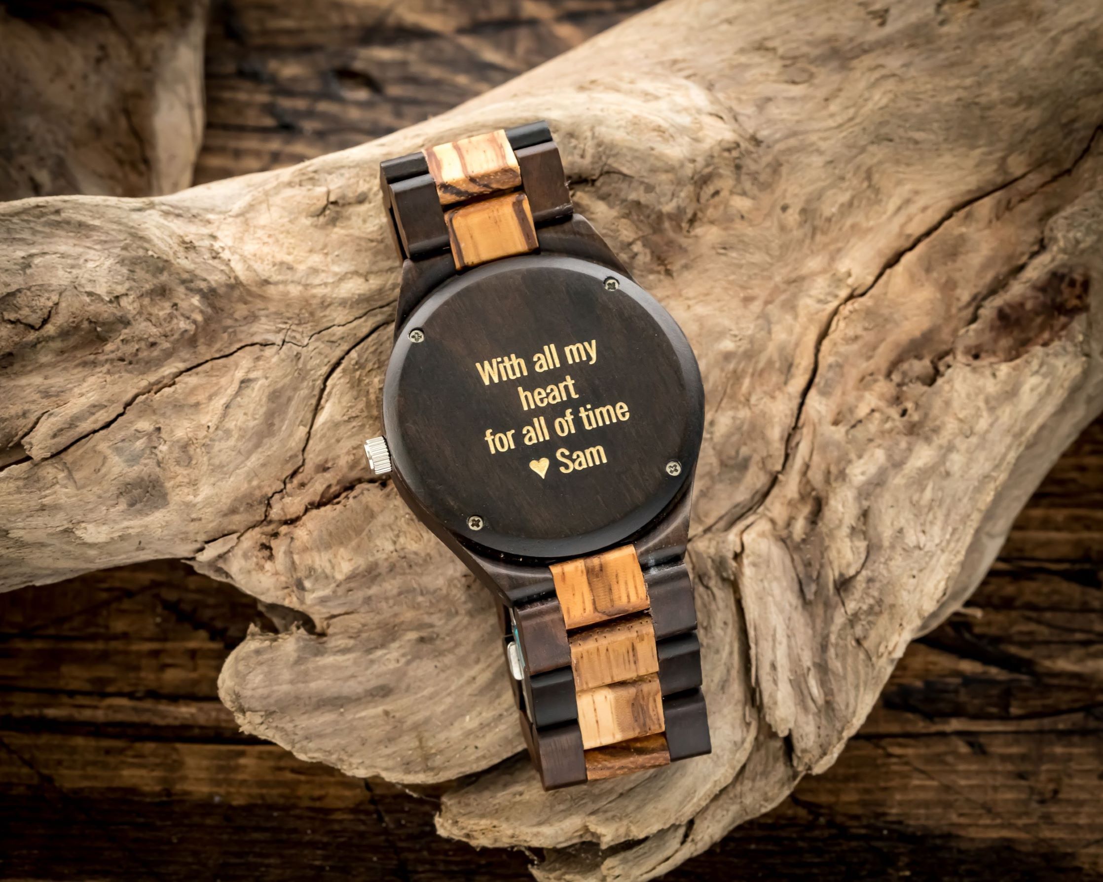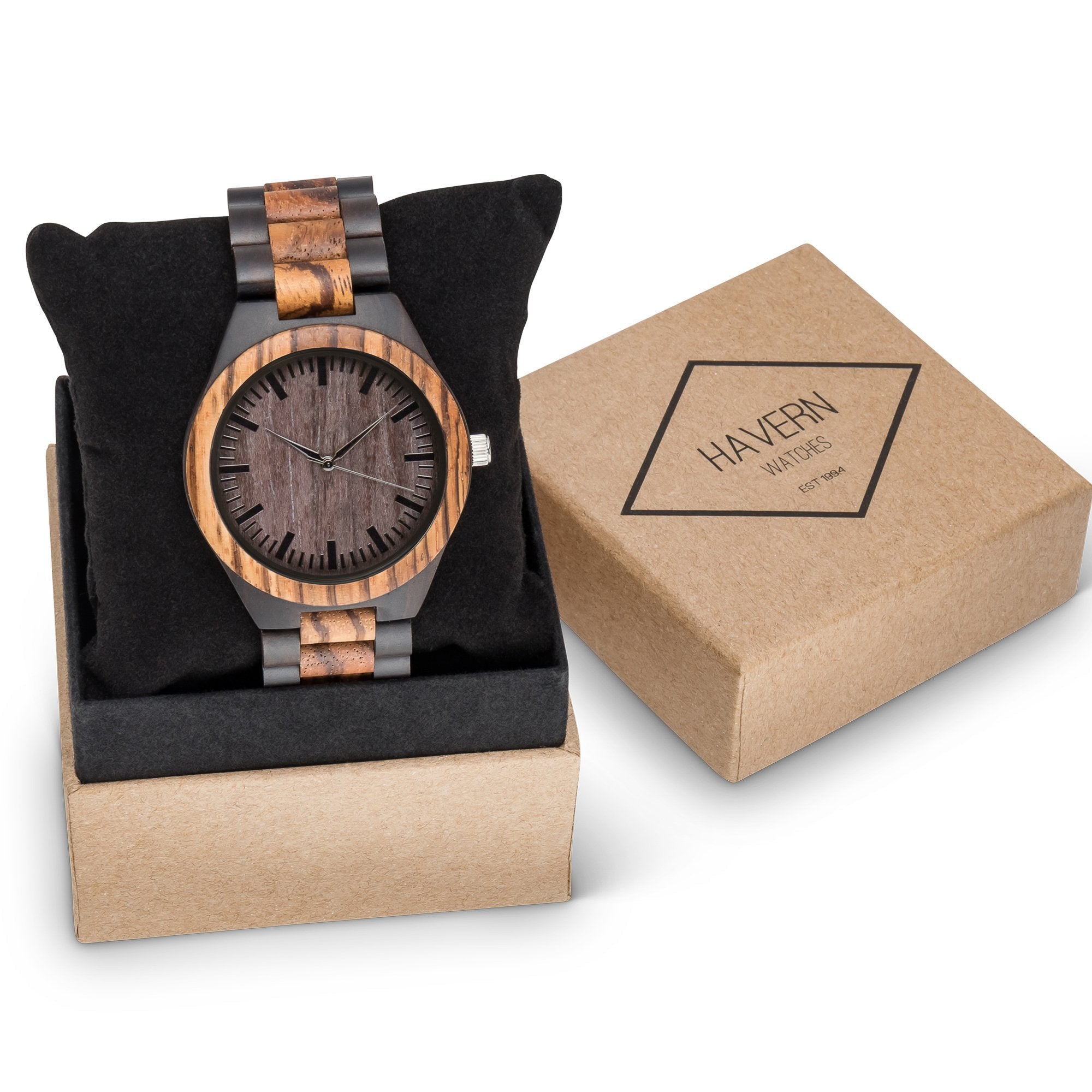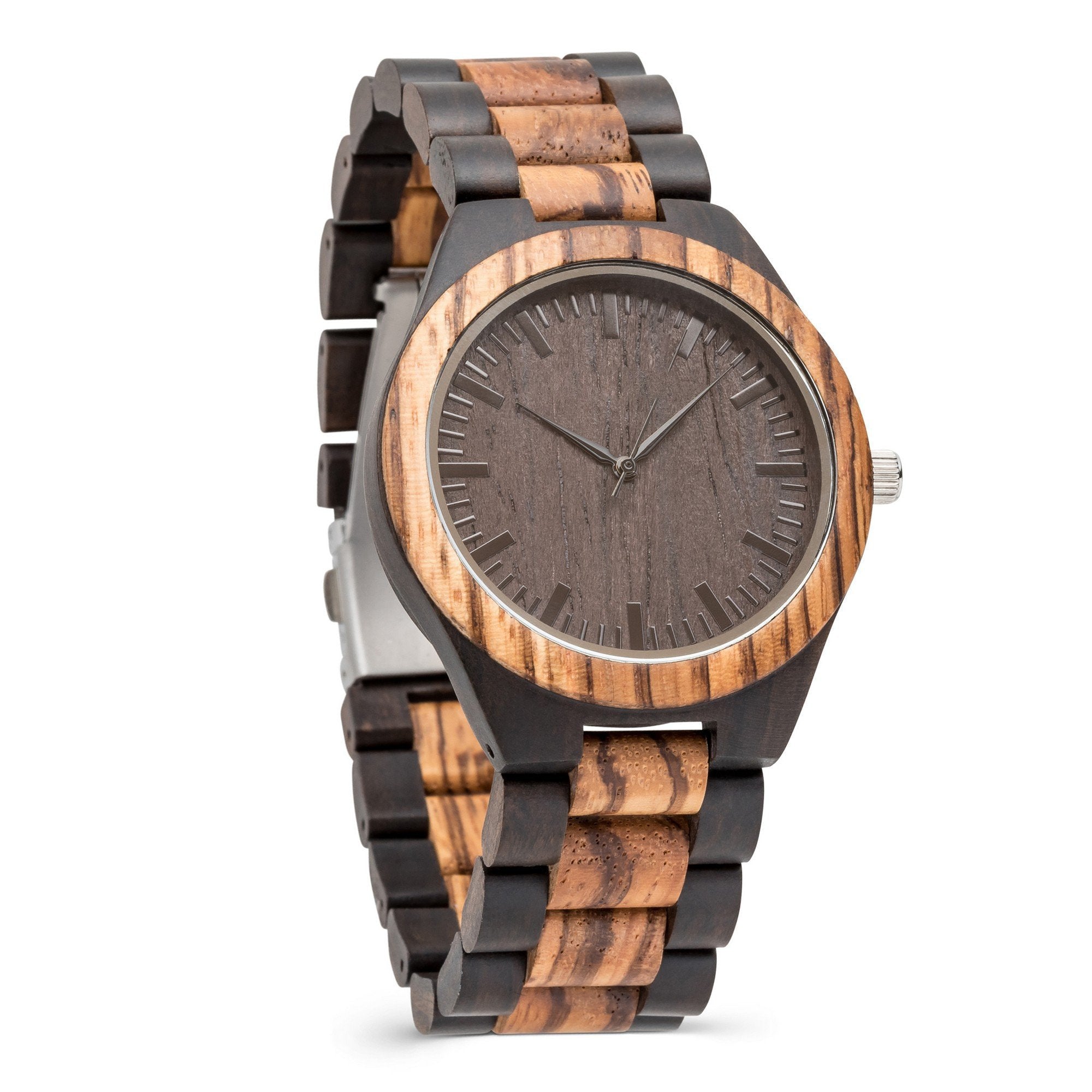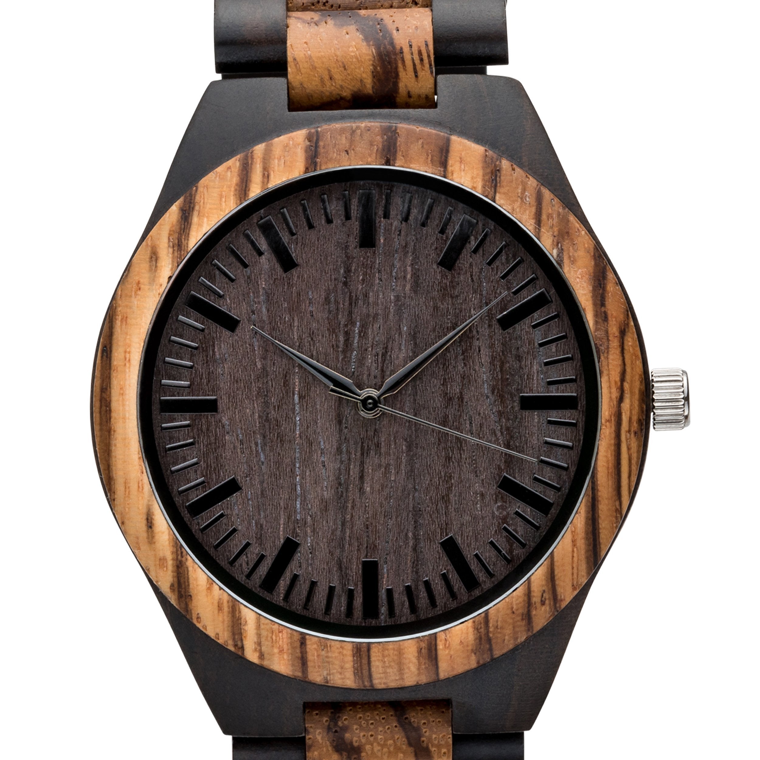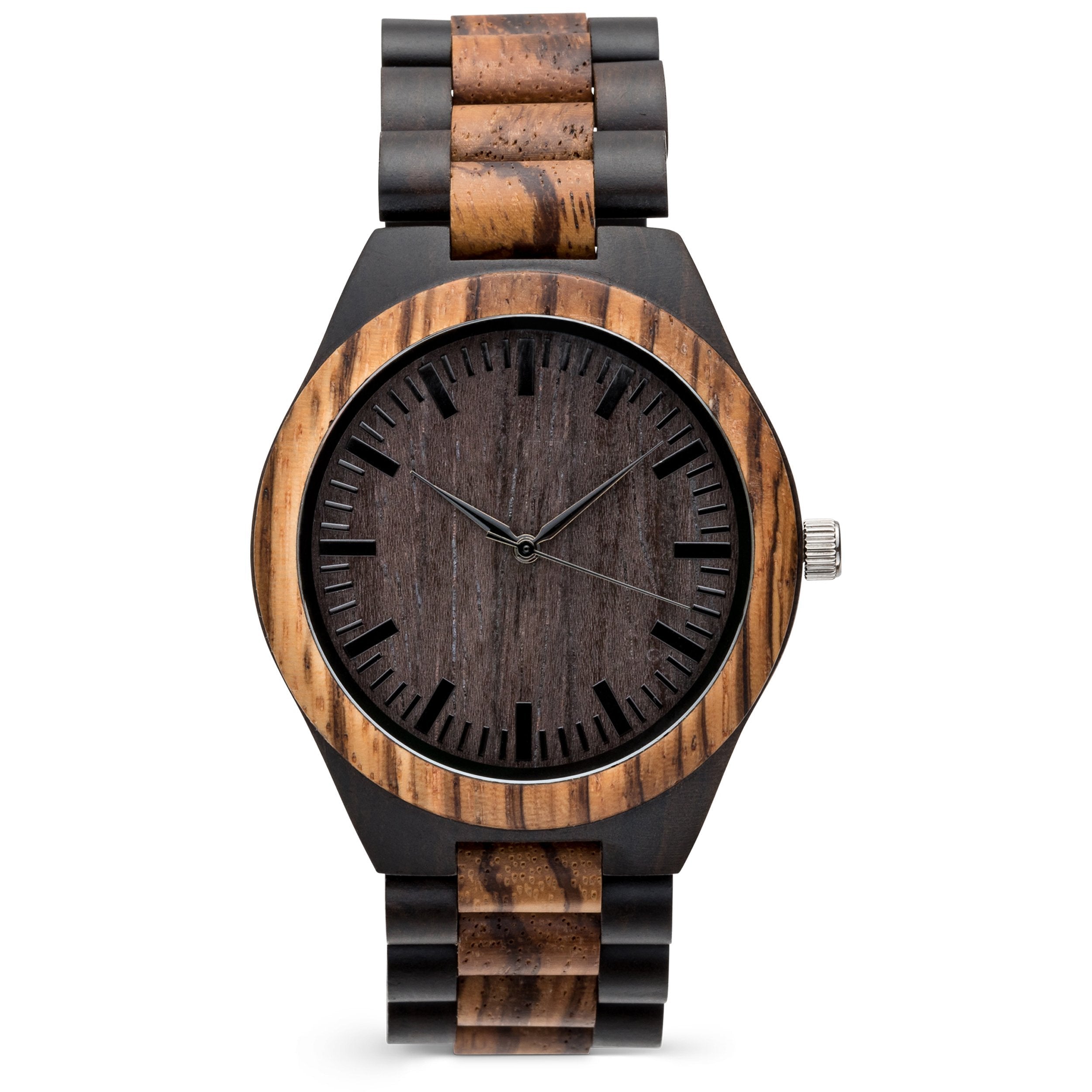 The Gavin Zebrawood and Ebony wooden watch brings rich natural materials to modern timepiece design. This two-toned piece features a watch case and matching wood link wristband made from genuine Zebrawood and framed by contrasting black sandalwood. Its style-forward design is matched by superior function: reliable quartz movement and simple dial markers are built for elite performance. Add custom engraving to your Gavin watch to create the perfect gift for any occasion. For added impact, upload a photo of your handwritten message to make your gift truly unique.