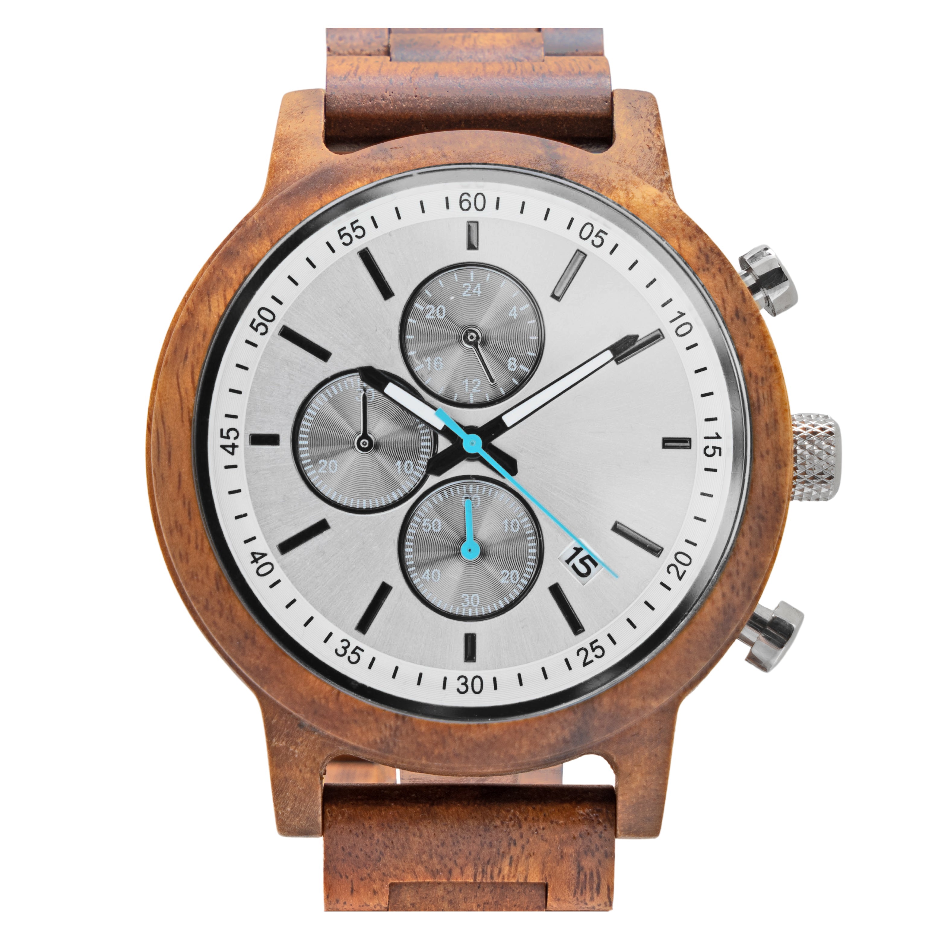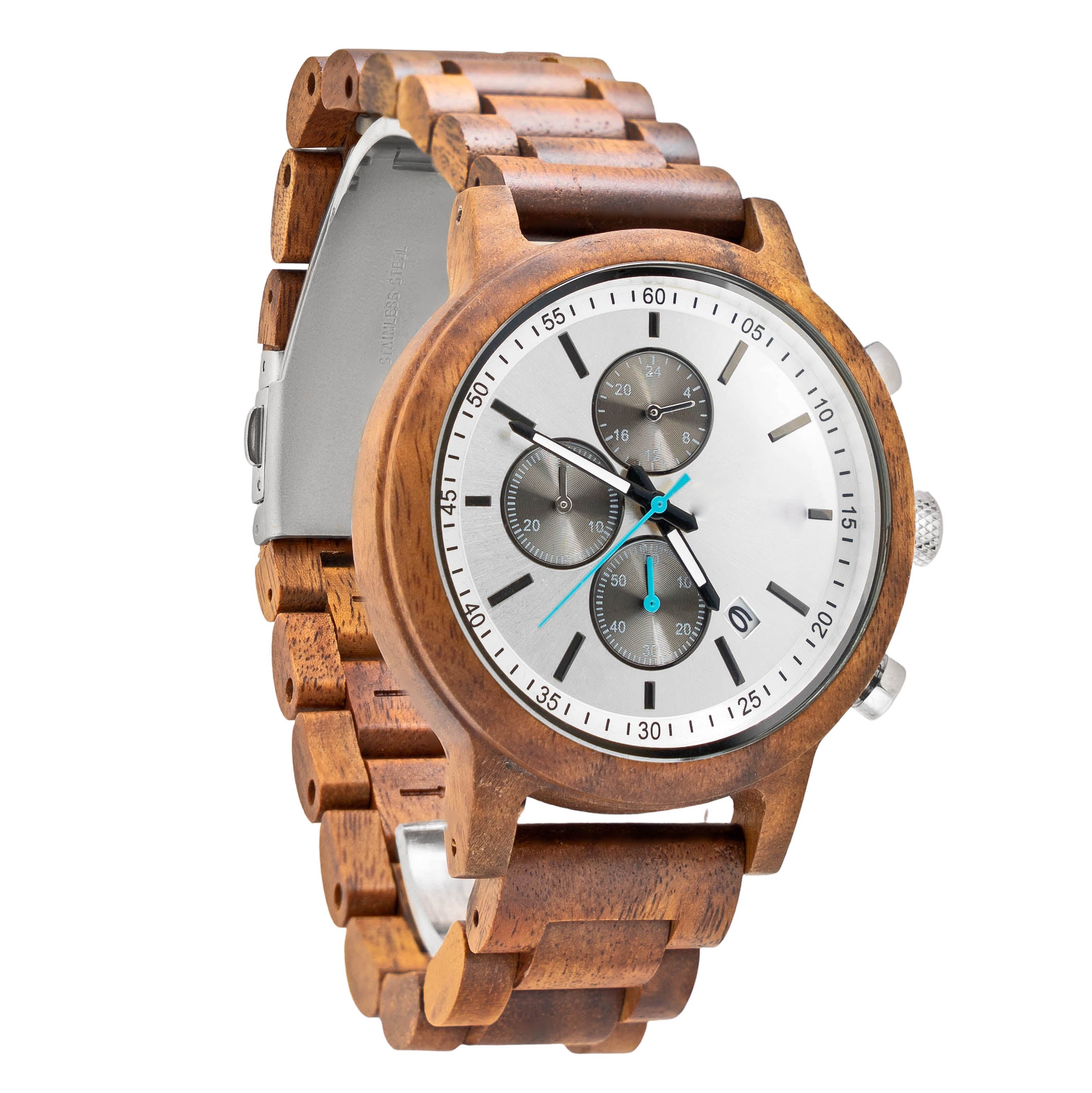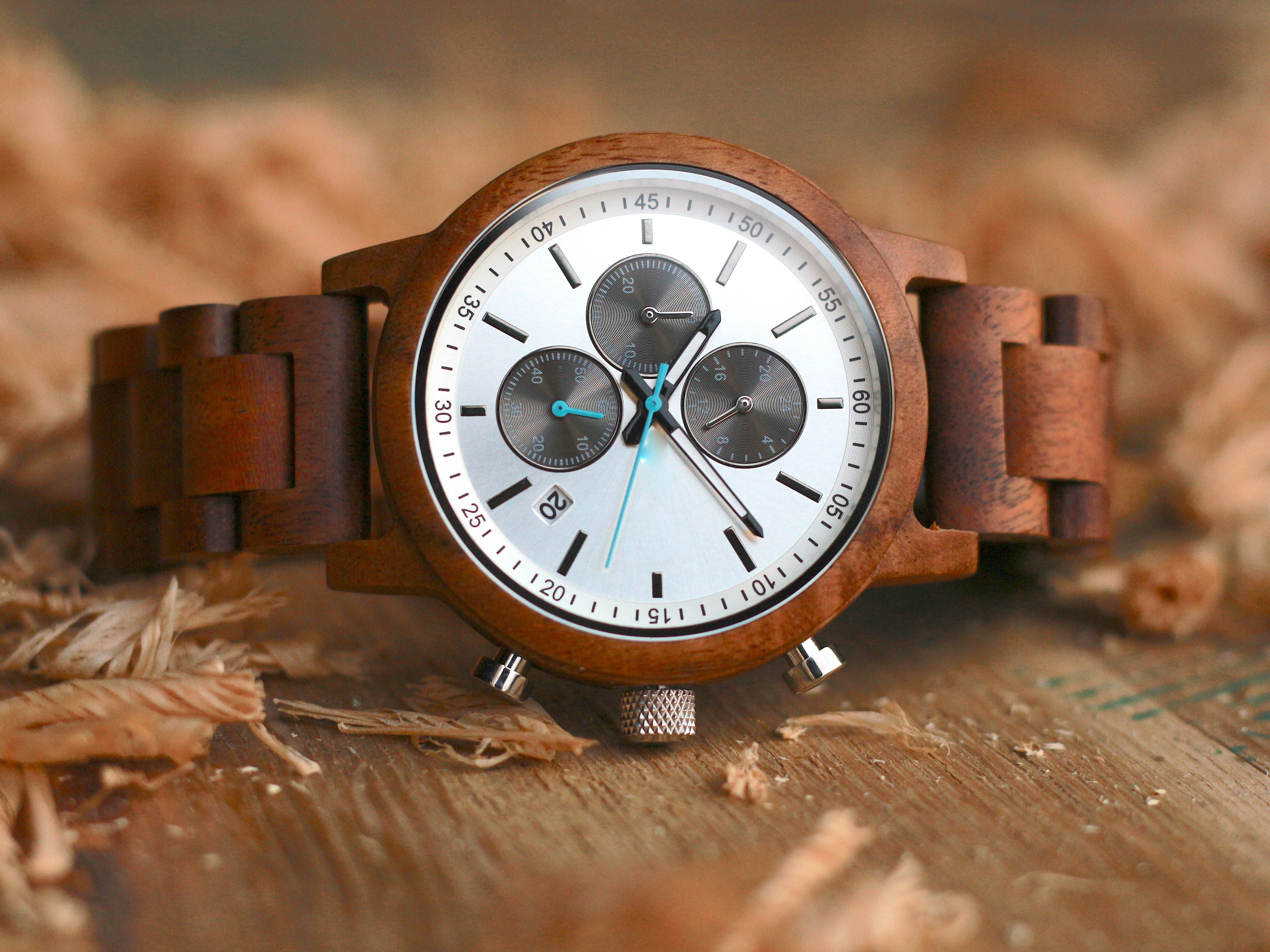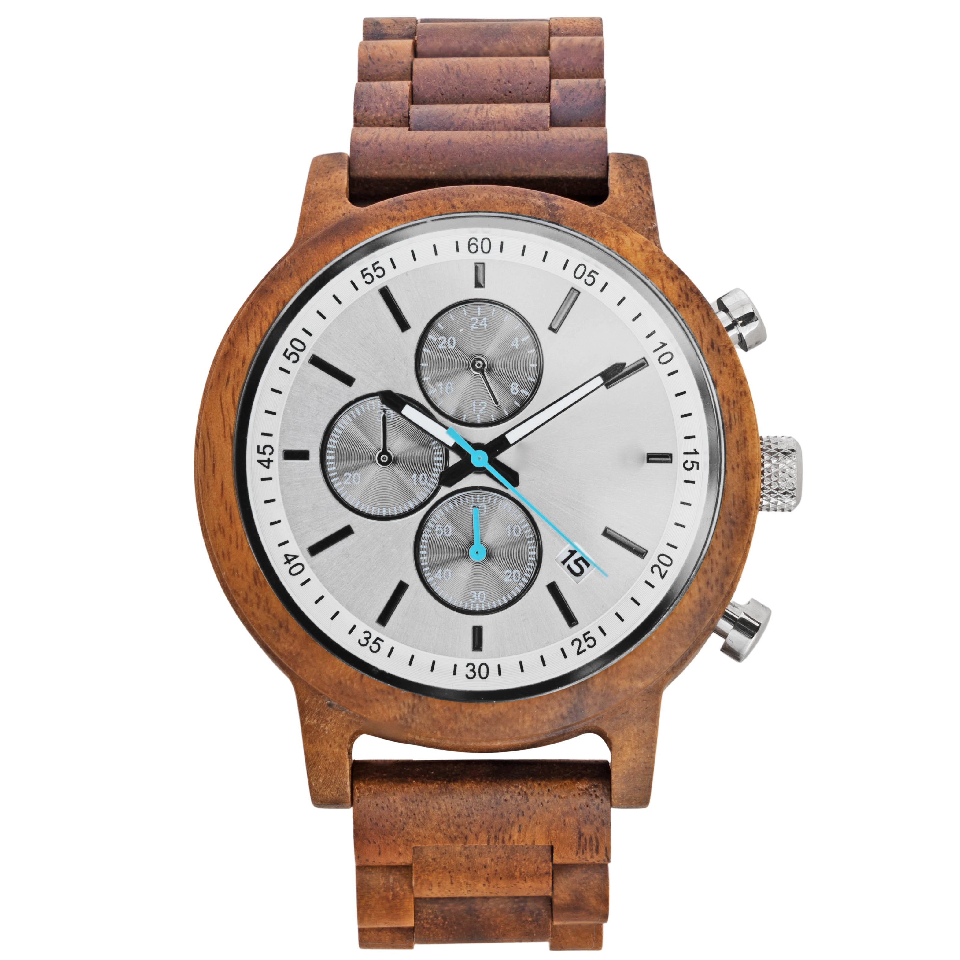 The Orion Koa wooden watch mixes the functionality of a stopwatch with the sleek design of a gentleman's timepiece. Our newest design features a Koa 1.75” casing and matching wooden link watchband made from reliably sourced Koa. The style-forward design is matched by its functionality. A reliable Miyota JS15 movement, simple notch dial indicators, three sub-dials, and a calendar card are built for everyday wear.