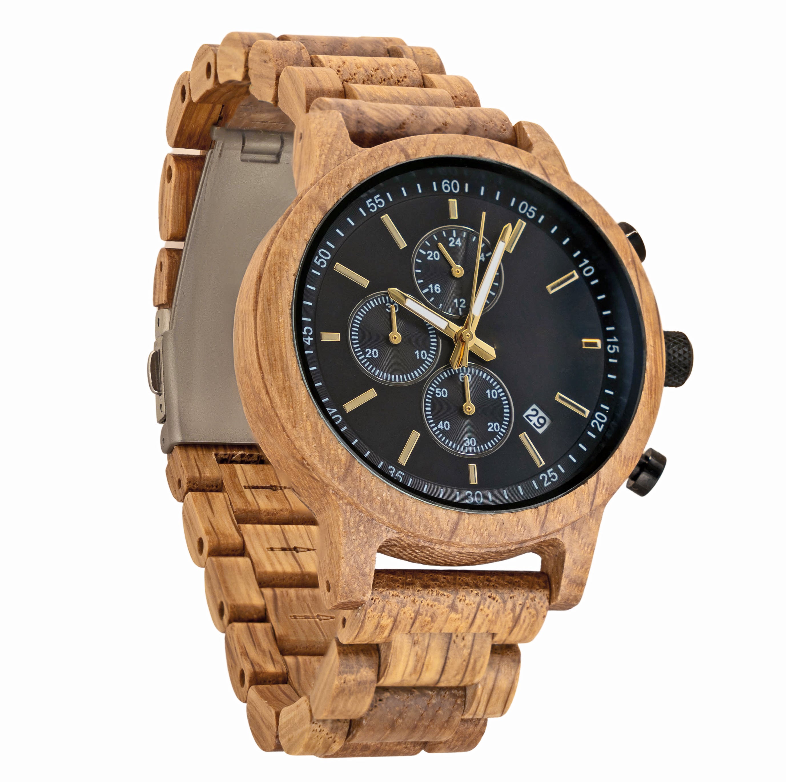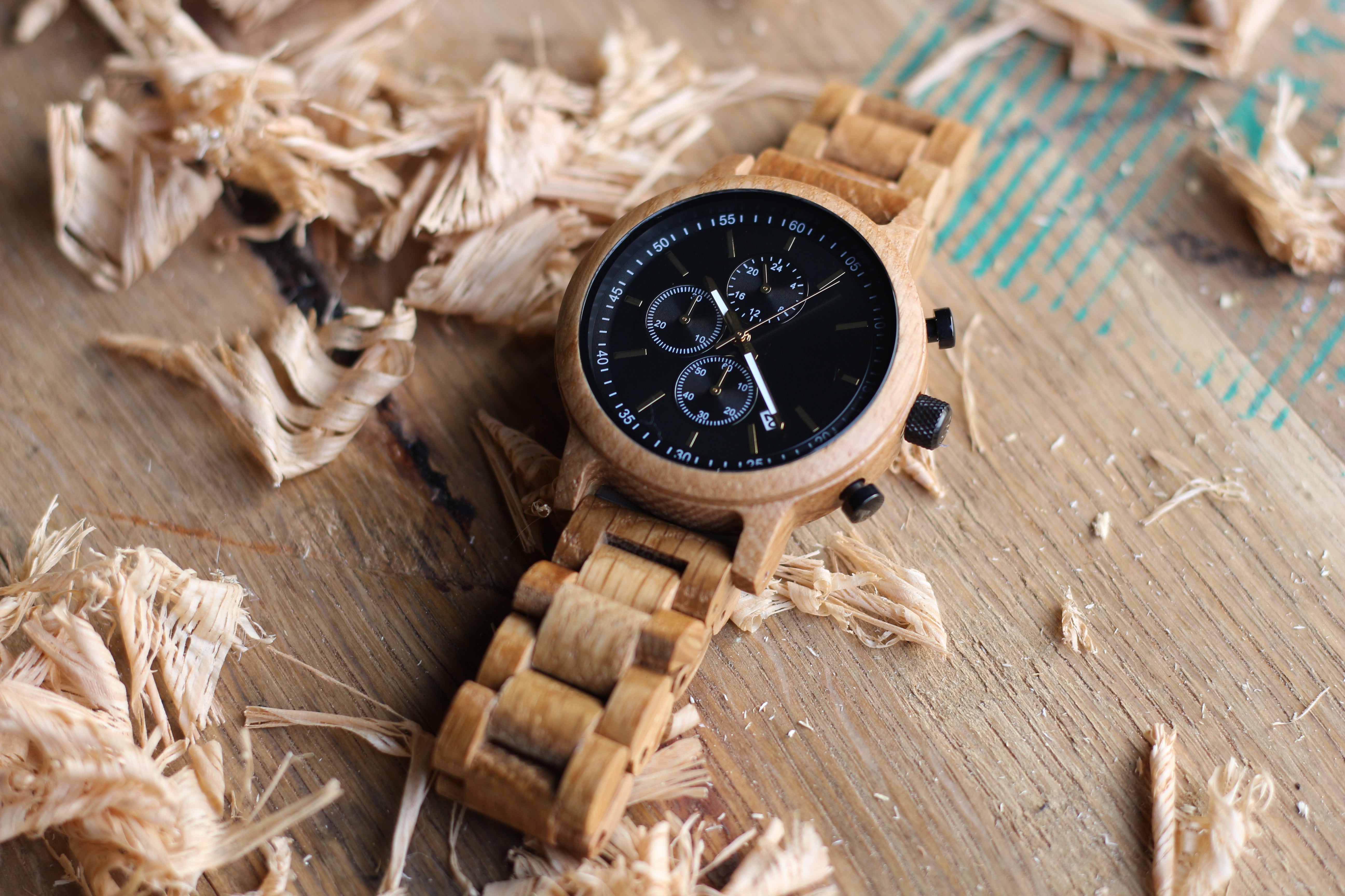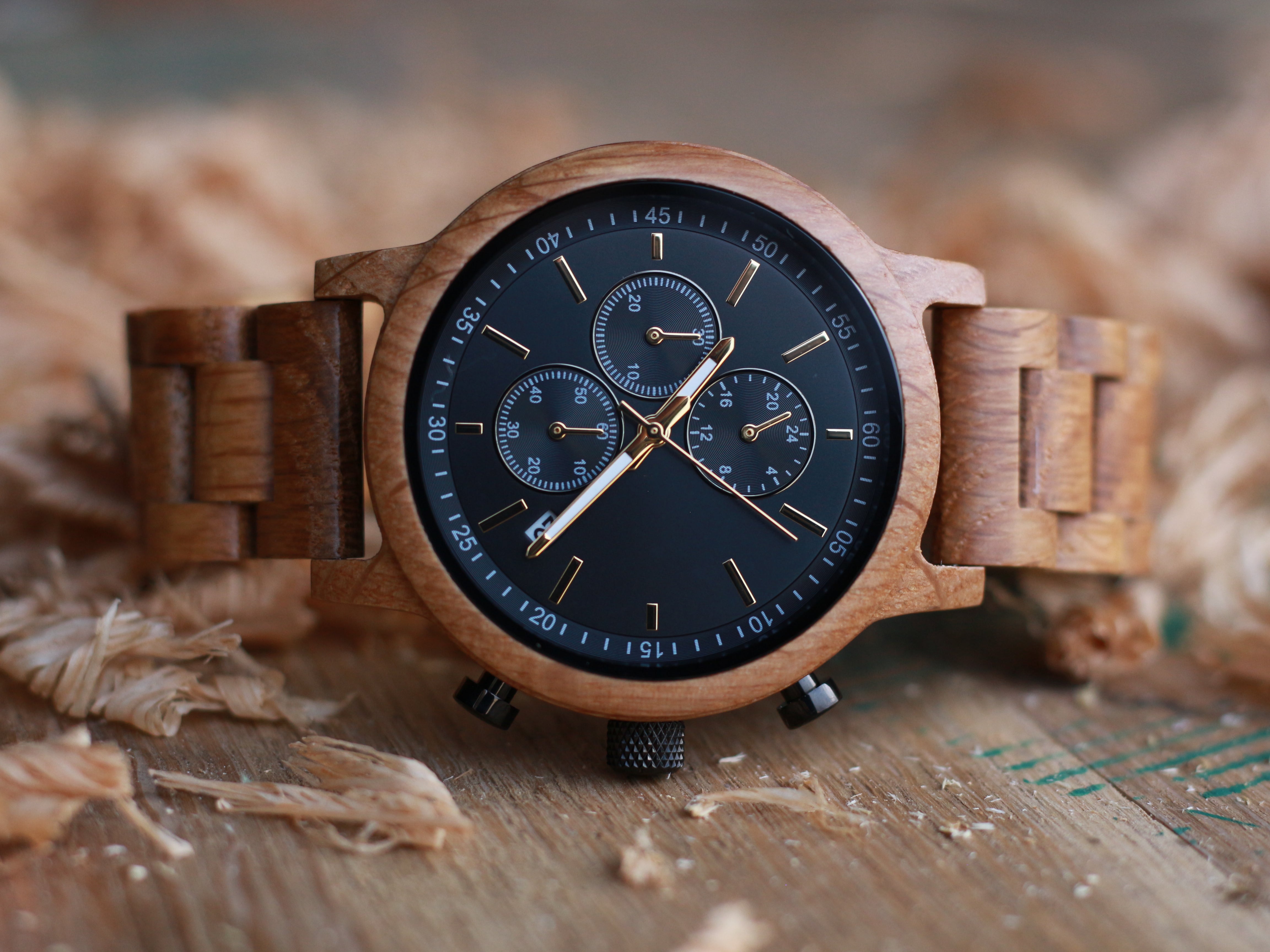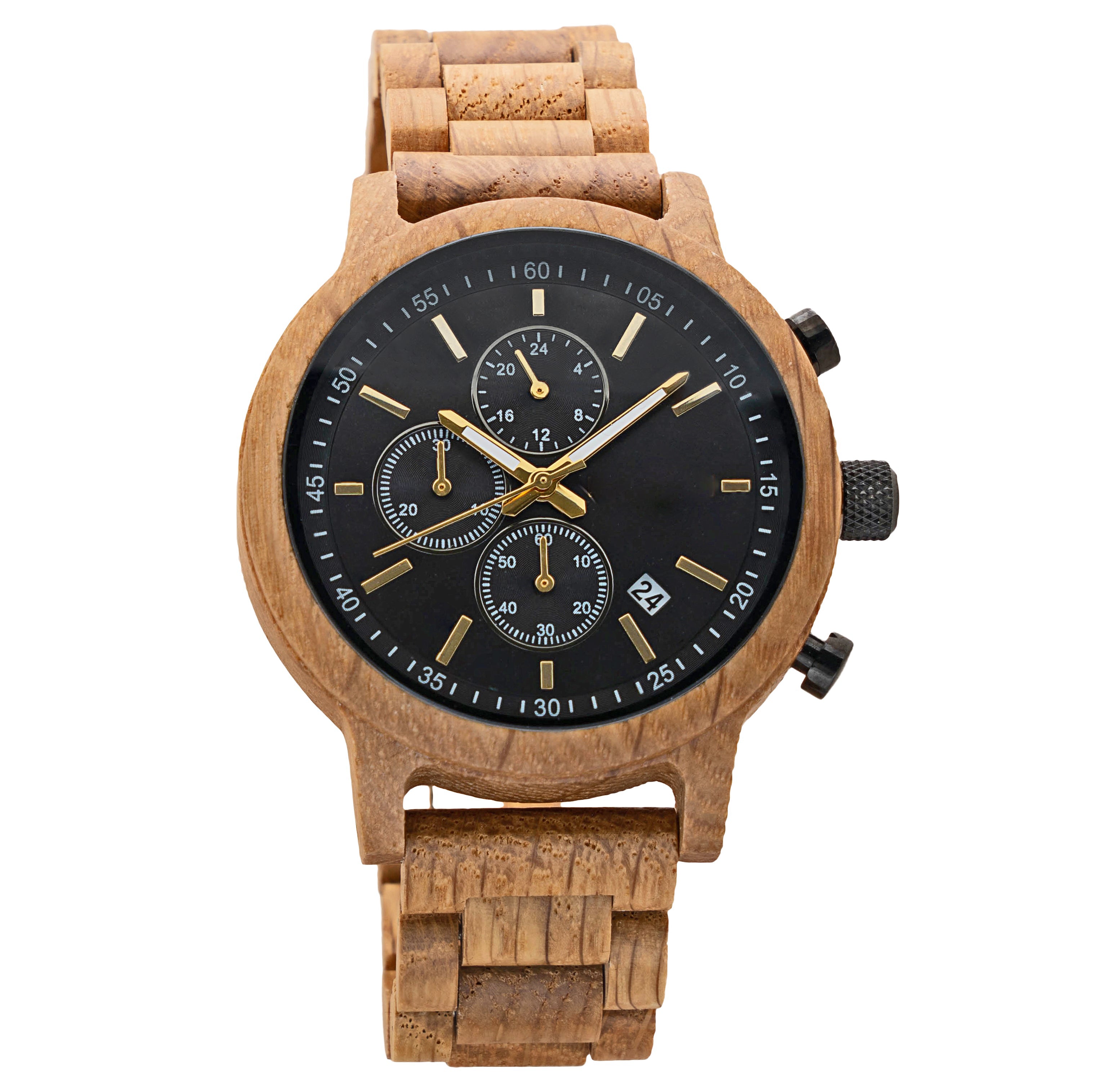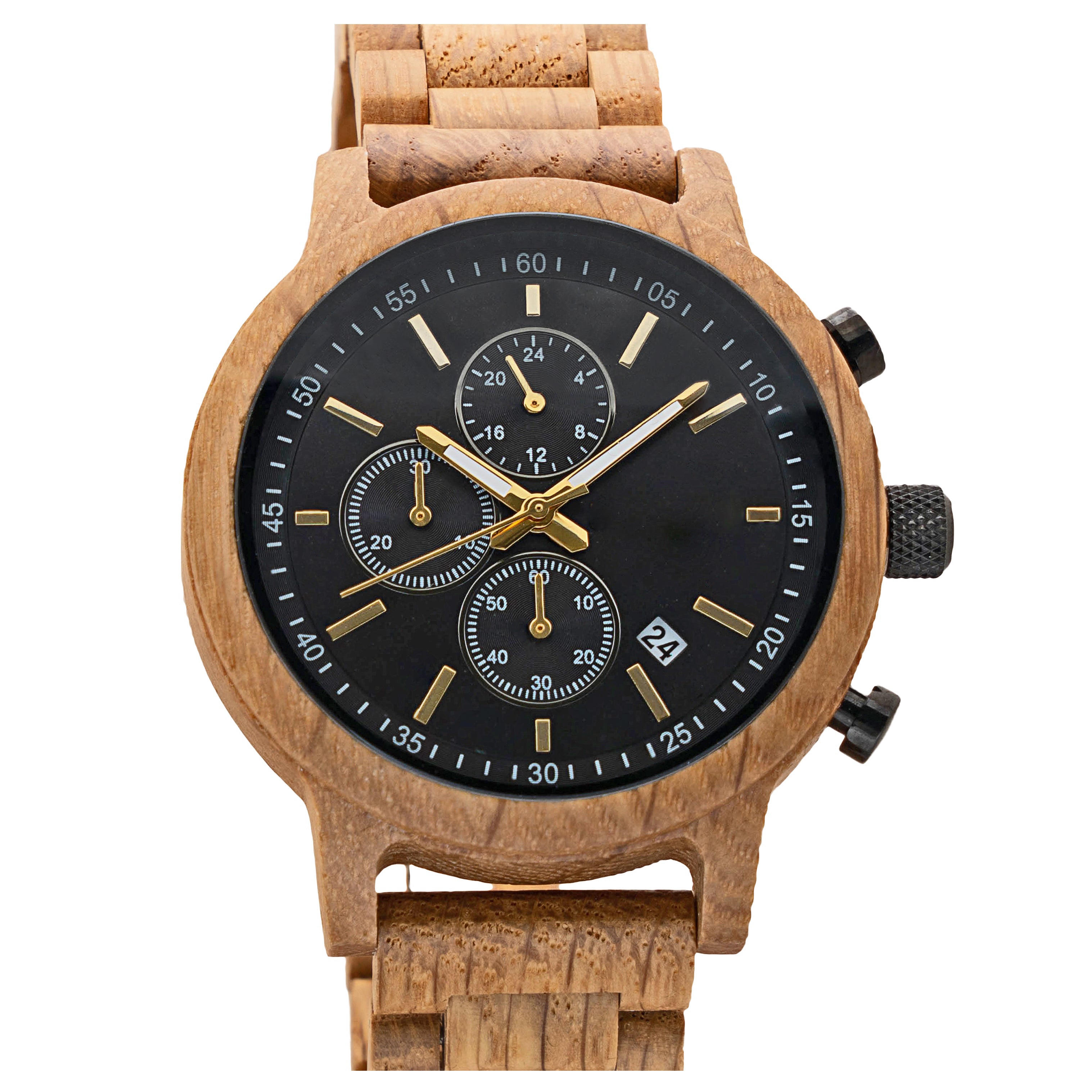 The Orion White Oak wooden watch mixes the functionality of a stopwatch with the sleek design of a gentleman's timepiece. Our newest design features a white oak 1.75” casing and matching wooden link watch band made from reliably sourced white oak. The style-forward design is matched by its functionality. A reliable Miyota JS15 movement, simple notch dial indicators, three sub-dials, and a calendar card are built for everyday wear.